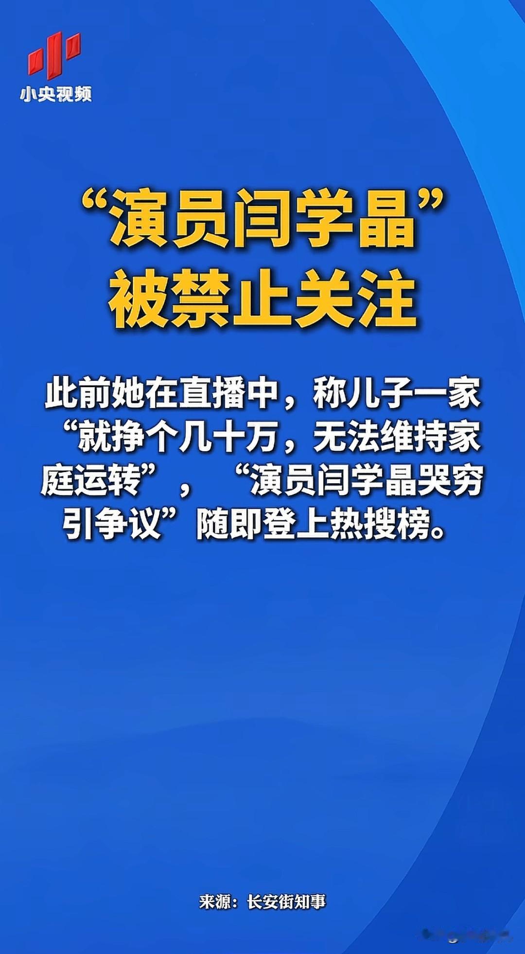 官媒发声了,闫学晶被禁止关注,最终为自己的傲慢无知言辞付出了代价。 这还只是个开始,接下来才是她最可能崩溃的,将在影视、代言、事业等方面全方位的崩盘! 过去的一两年,多少网红因为炫富,最终塌方。当金钱匹配不上认知时,塌方是迟早的事。闫学晶这次的塌方,纯粹就是典型的不作不死,过去几十年春晚积累的观众缘,一夕之间毁之殆尽。事件发生时,不积极处理危机,反而不知悔改,暗讽众人是在酸她。娱乐圈混了那么久,咋一点公众人物危机公关意识没有? 而且当前的大背景是啥,那是世界风云变幻,内外形势严峻,缩小贫富差距,增加人民收入,促进内循环是当前的大方向。你一个明星,在这种背景下,不但不知收敛,儿子几十万年收入竟然不满足,还大放厥词哭穷卖惨以博同情从而割韭菜,挑起百姓的对立情绪,你不塌方谁塌方!