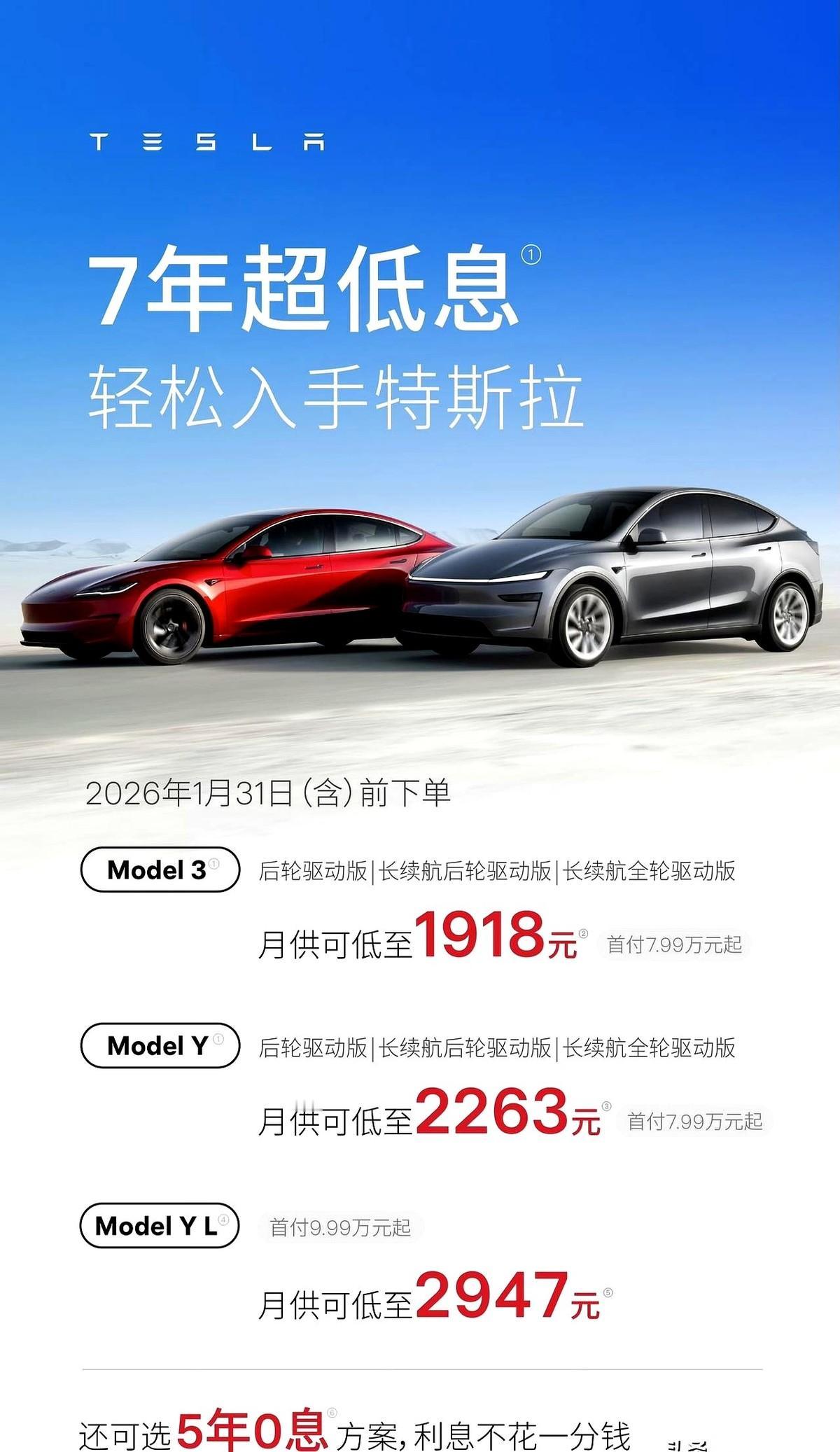 都以为价格战是最终章,特斯拉却直接换了剧本。 别人卷价格,它开始卷你的月供。 最近特斯拉甩出个五年免息的Model Y,还带个新颜色。我跟你算笔账,这招比明着降三万还狠。 为啥? 你贷款买辆二十多万的车,普通分期五年,利息怎么也得两万五六。这一下子,全给你抹了。 钱没少花,但感觉就是不一样。 它最毒的一点,是彻底改变了游戏的计价单位。 以前你看车,盯的是右下角那个吓人的总价。现在它让你看的,是每月三千出头的月供。 心理防线一下就垮了。 “几十万的车我买不起,但一个月三千多?好像……也行?” 再加上个七年低息的选项,好家伙,真把买车供出了还房贷的仪式感。 这已经不是卖车了。 这是在玩金融,更是在拿捏人心。它绕开了你理性比较的那部分大脑,直接跟你感性的钱包对话。 哦,差点忘了,还送你个“海洋蓝”新车漆。 打个巴掌,给颗糖。巴掌是告诉你别老盯着降价,糖是让你觉得这买卖真值。 所以还刷什么降价榜单啊。 赛道早就换了。当别人还在泥地里拼刺刀,比谁降得多一万少一万的时候,特斯拉已经坐在直升机上,往下撒分期传单了。 它算准了,大多数人怕的不是总价高,而是“当下”的压力大。 把压力摊薄到六十个月里,每一份都变得可以忍受。欲望,就这么被悄悄松了绑。 高,实在是高。