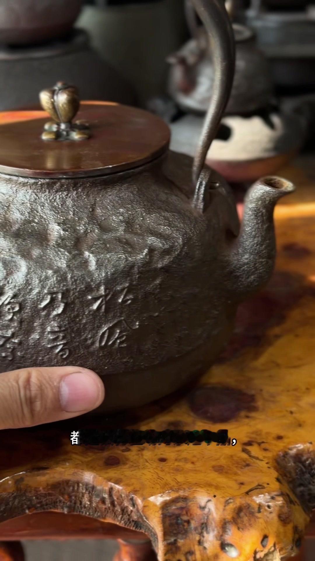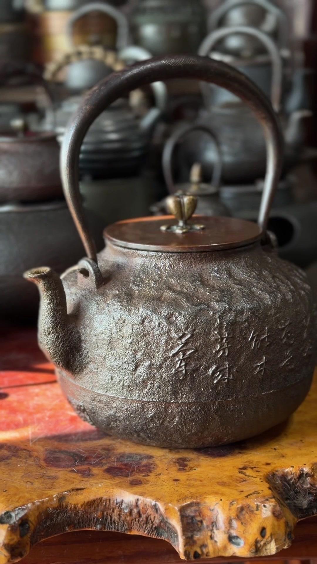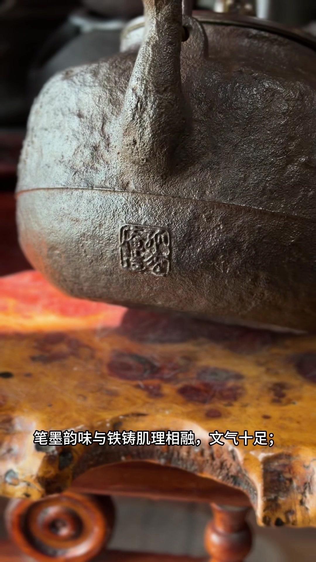 壶身满布古朴岩肌纹,摸上去颗粒质感扎实,百年老铁质地精纯紧实,上手分量感十足。总重1623克,斑紫铜盖249克,压手感直接拉满。最绝的是环腰两圈汉诗题刻,笔墨韵味与铁铸肌理相融,文气十足。斑紫铜盖原配严丝合缝,历经岁月依旧品相完好,无修补无渗漏,状态绝佳。 1300cc黄金大容量,不管是煮水泡茶还是陈设收藏,都是镇得住场的茶道珍品,上手即知是藏家梦寐以求的好物件。