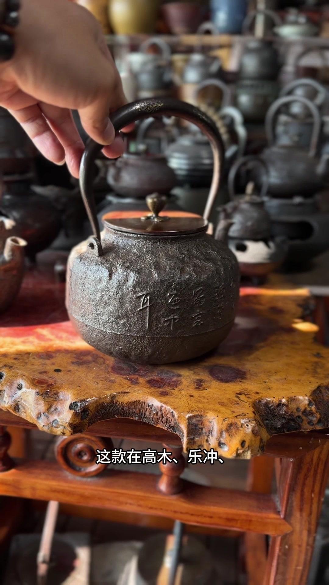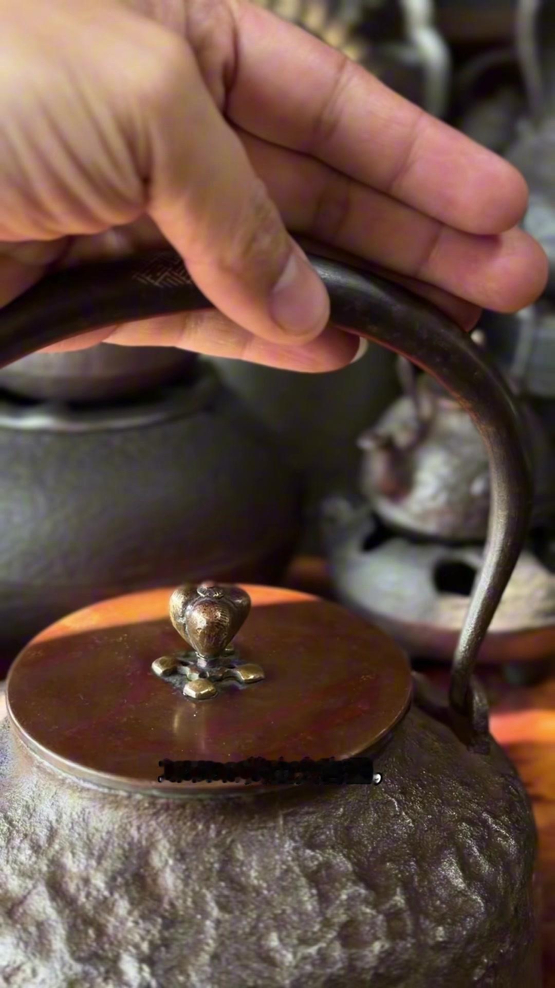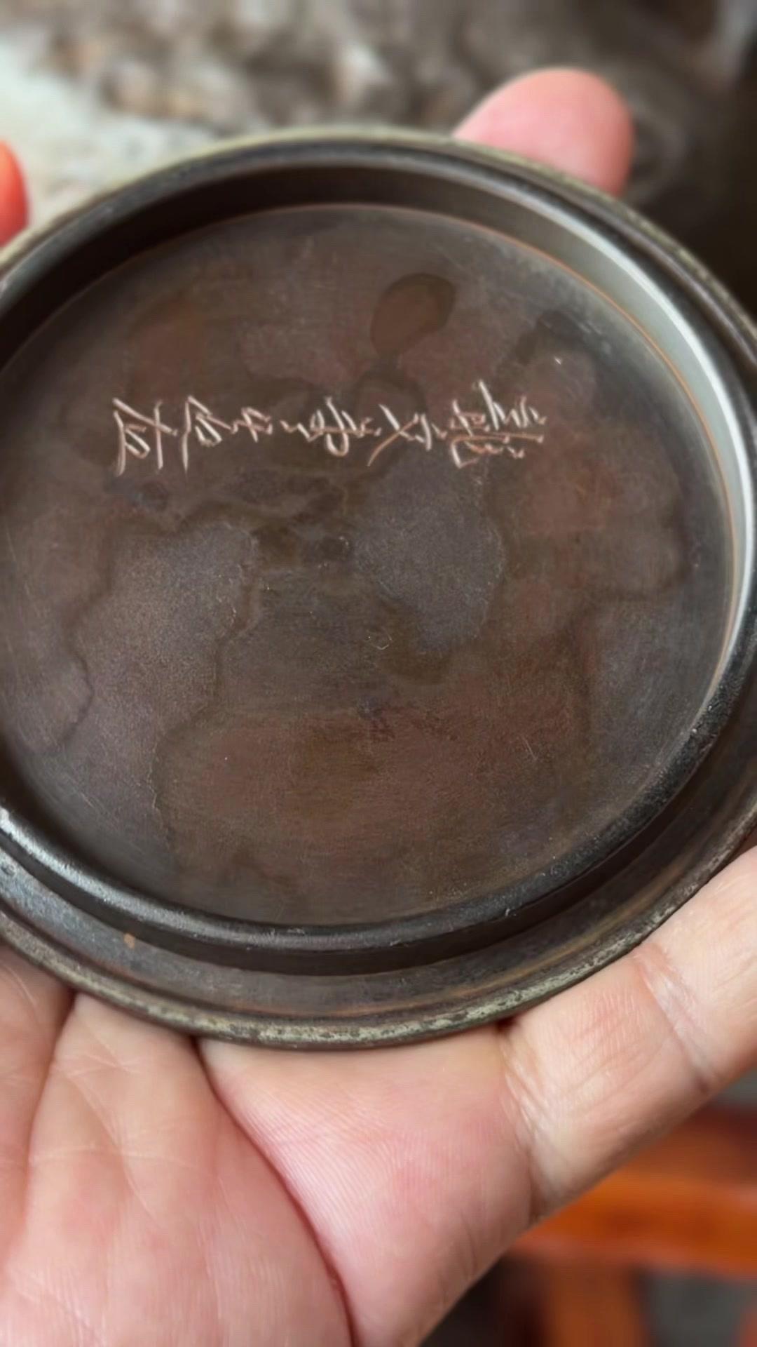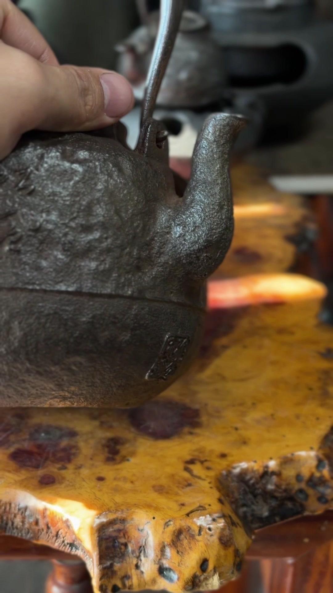 壶身满布古朴岩肌纹,摸上去颗粒质感扎实,百年老铁质地精纯紧实,上手分量感十足。总重1623克,斑紫铜盖249克,压手感直接拉满。最绝的是环腰两圈汉诗题刻,笔墨韵味与铁铸肌理相融,文气十足。斑紫铜盖原配严丝合缝,历经岁月依旧品相完好,无修补无渗漏,状态绝佳。 1300cc黄金大容量,不管是煮水泡茶还是陈设收藏,都是镇得住场的茶道珍品,上手即知是藏家梦寐以求的好物件。