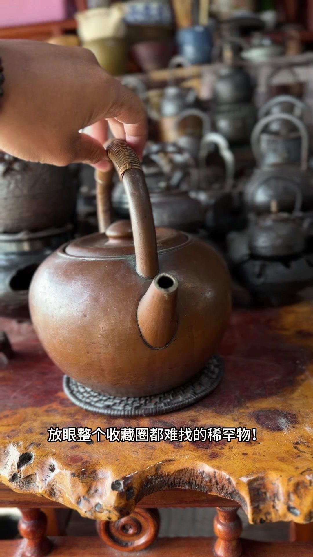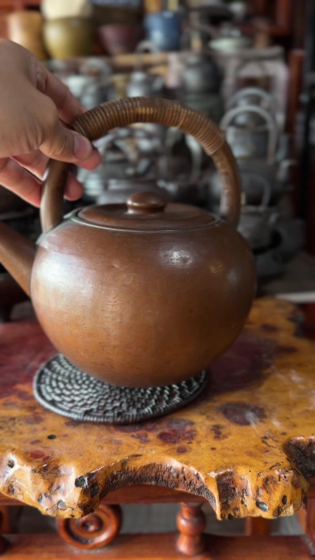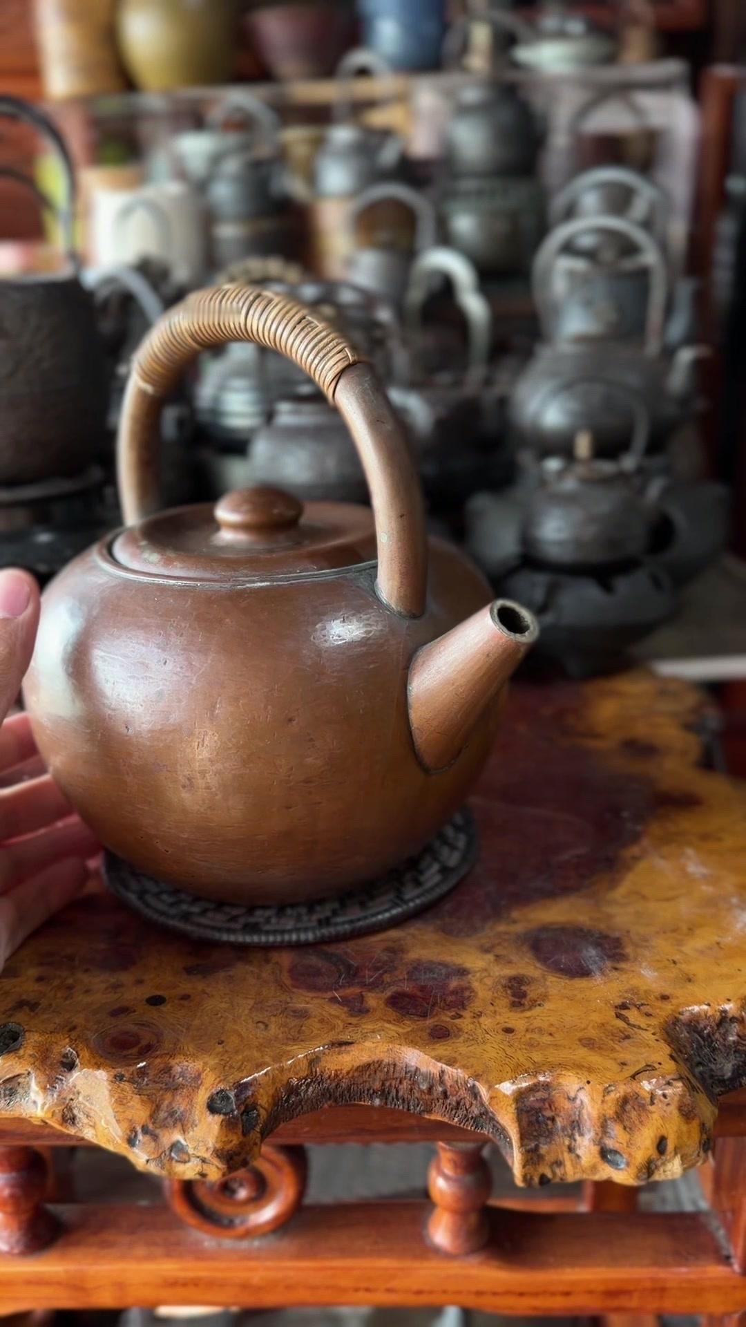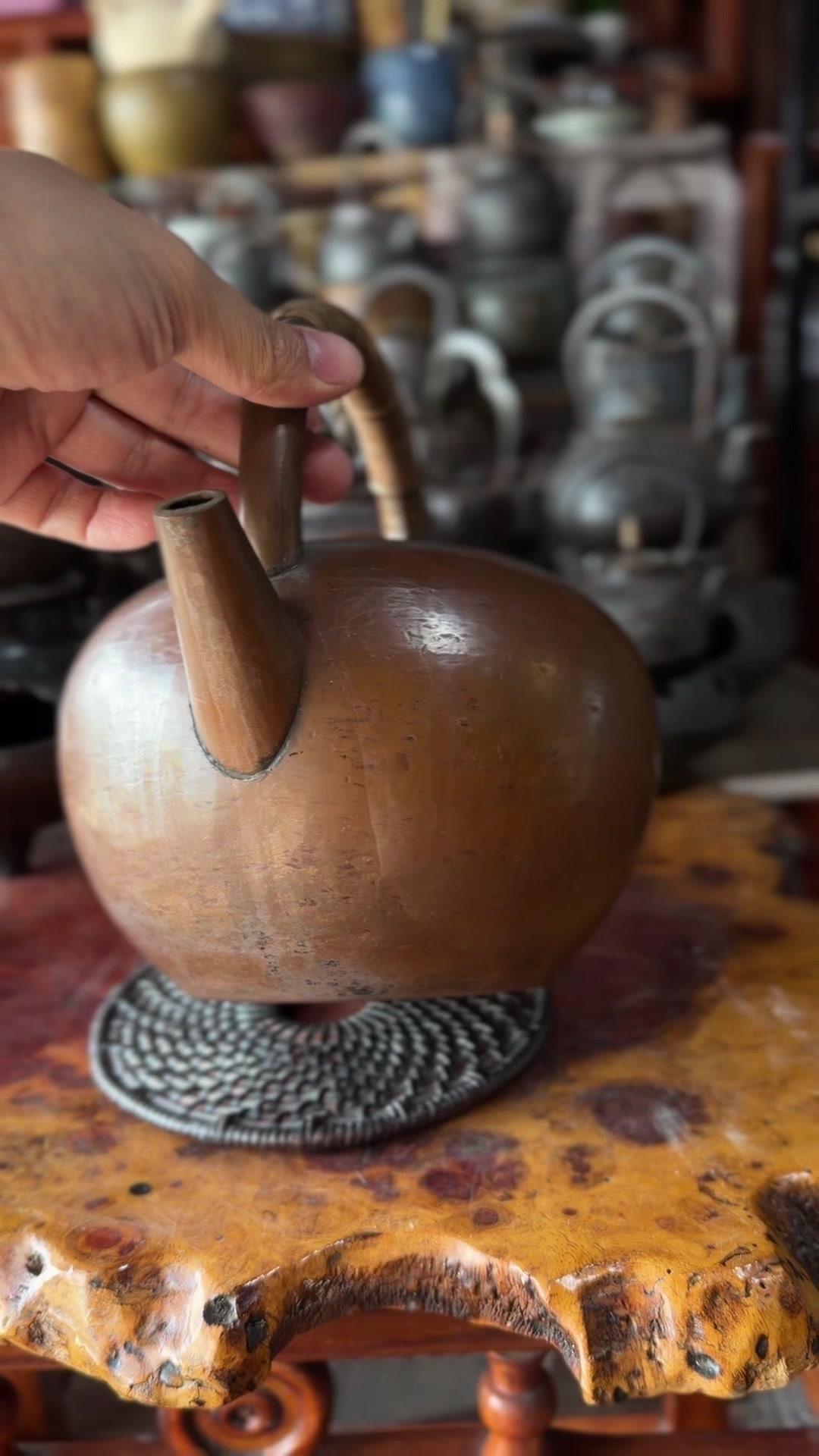 这件明治老铜壶也太绝了吧!🏺这可是压箱底的宝贝,明治时期极品老铜壶,收藏圈都少见的稀罕物。形制特别,土器式保普罗型搭配圆润的苹果圆壶身,最亮眼的是霸气炮嘴壶口,利落大气还不洒漏。 💧1.8升大容积,日常蓄水或茶席煮茶都够用,实用性拉满。工艺更是绝了,纯手工一片手打,壶身每道肌理都带着匠人温度,是机器复刻不出的自然质感。 🍃原配藤把保存完美,温润趁手,搭配古朴拱把设计,拿握稳稳当当。老铜壶包浆温润厚重,铜光流转间满是岁月沉淀的韵味。 兼具实用与收藏格调,自用品茶或藏赏陈设都是点睛之笔,喜欢的千万别错过!
