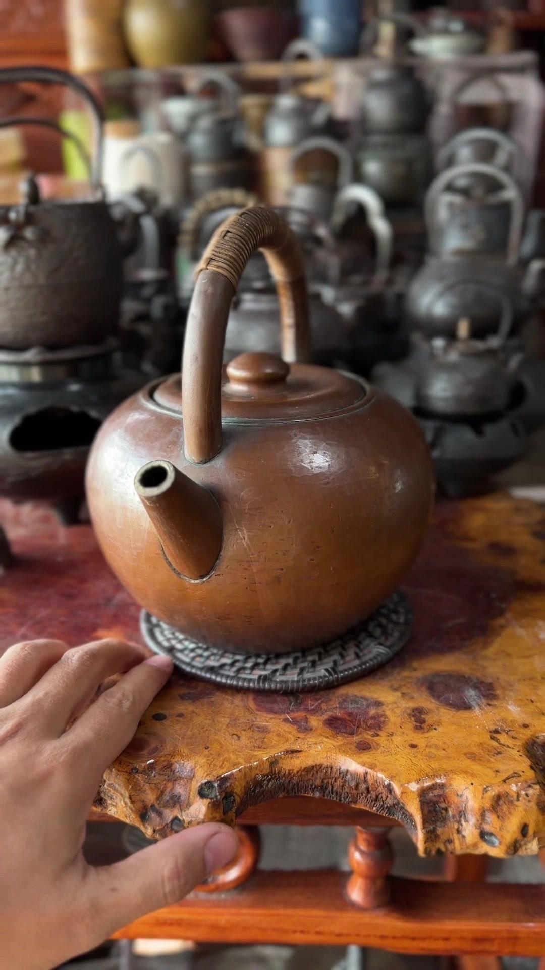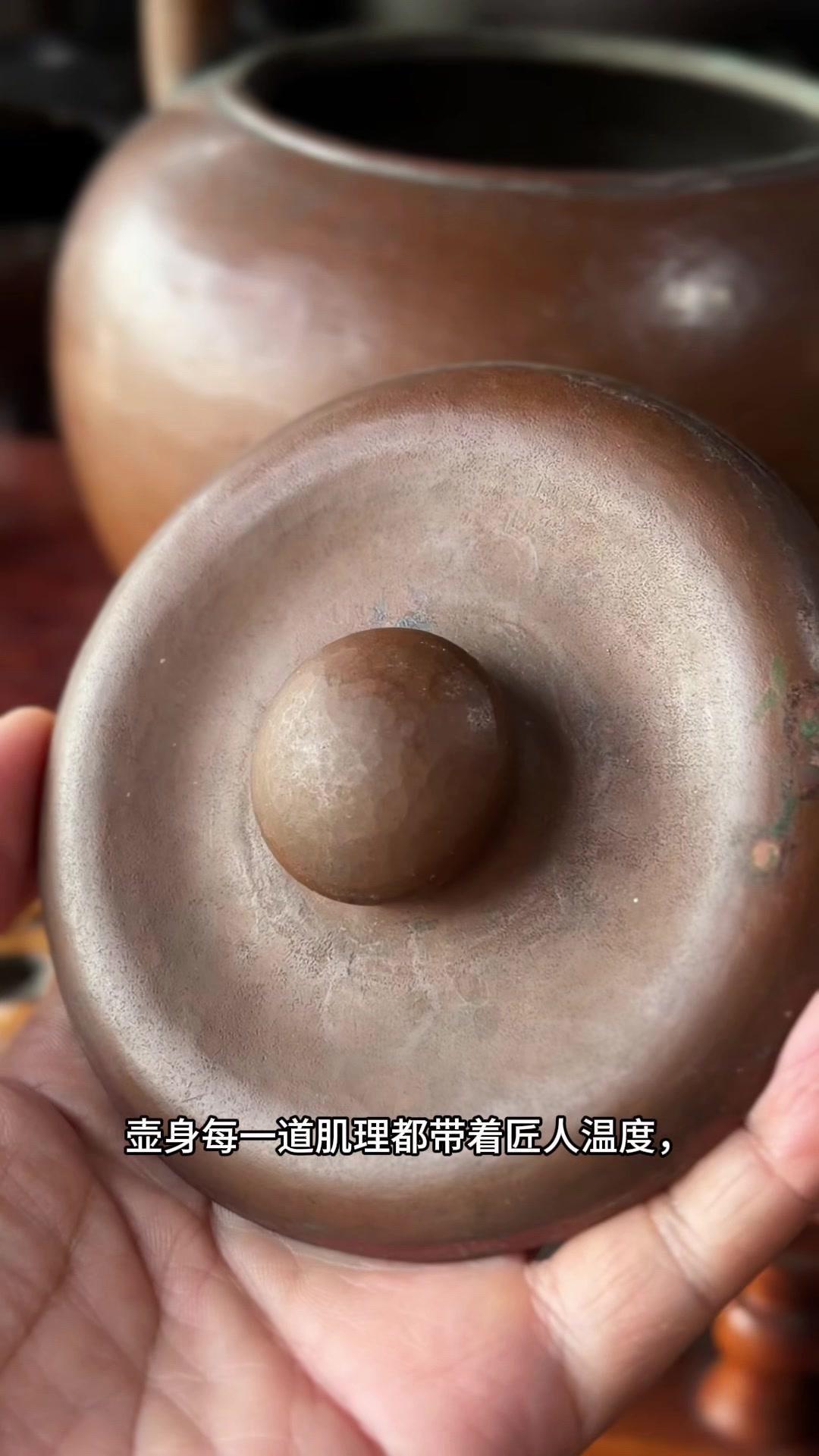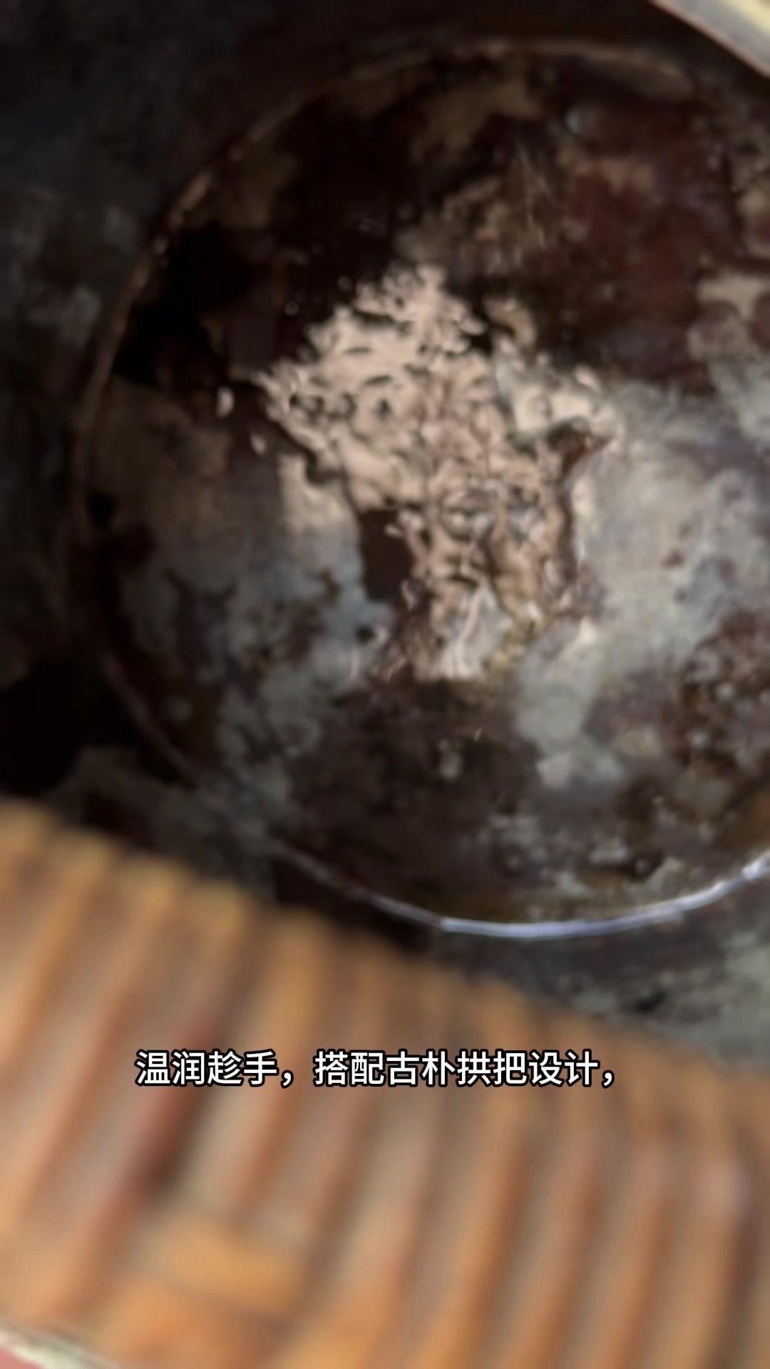 这件明治老铜壶也太绝了吧!🏺这可是压箱底的宝贝,明治时期极品老铜壶,收藏圈都少见的稀罕物。形制特别,土器式保普罗型搭配圆润的苹果圆壶身,最亮眼的是霸气炮嘴壶口,利落大气还不洒漏。 💧1.8升大容积,日常蓄水或茶席煮茶都够用,实用性拉满。工艺更是绝了,纯手工一片手打,壶身每道肌理都带着匠人温度,是机器复刻不出的自然质感。 🍃原配藤把保存完美,温润趁手,搭配古朴拱把设计,拿握稳稳当当。老铜壶包浆温润厚重,铜光流转间满是岁月沉淀的韵味。 兼具实用与收藏格调,自用品茶或藏赏陈设都是点睛之笔,喜欢的千万别错过!