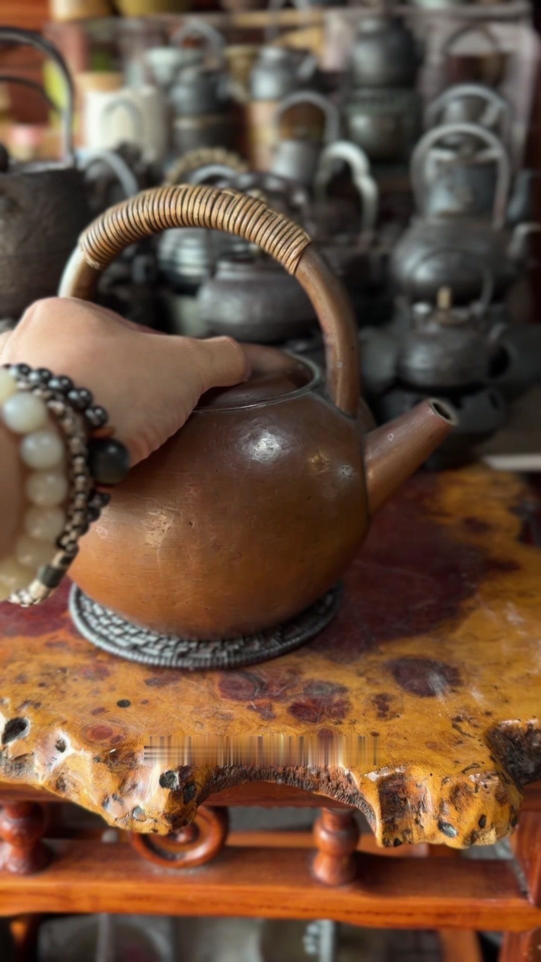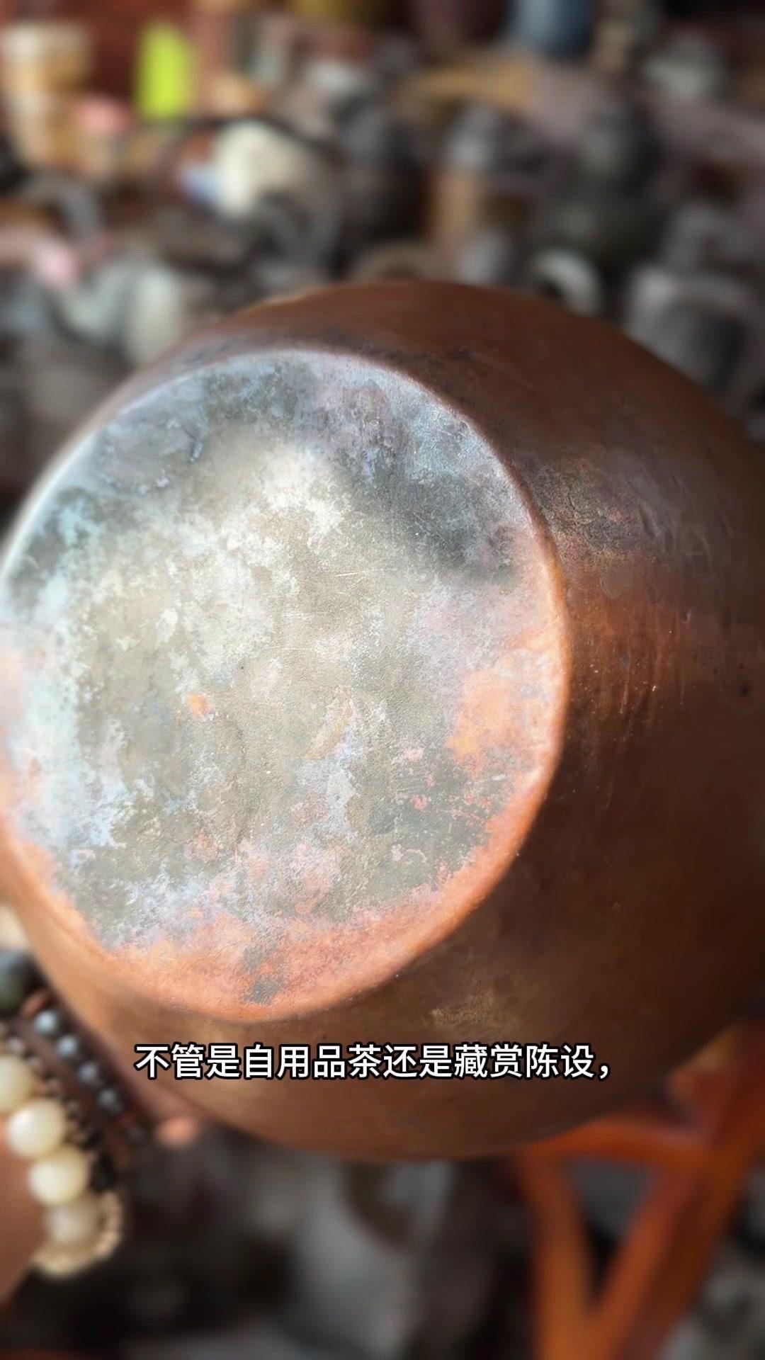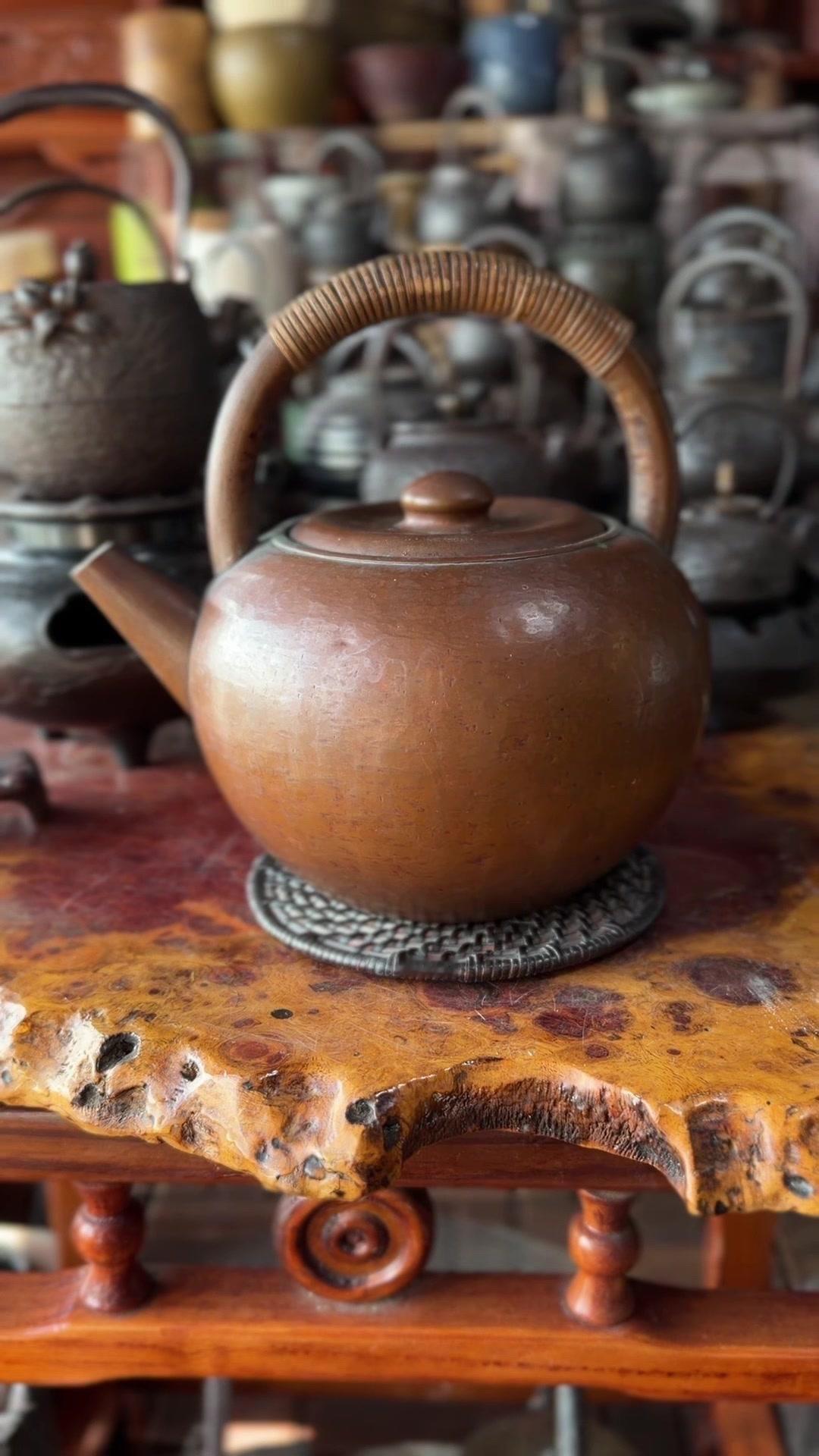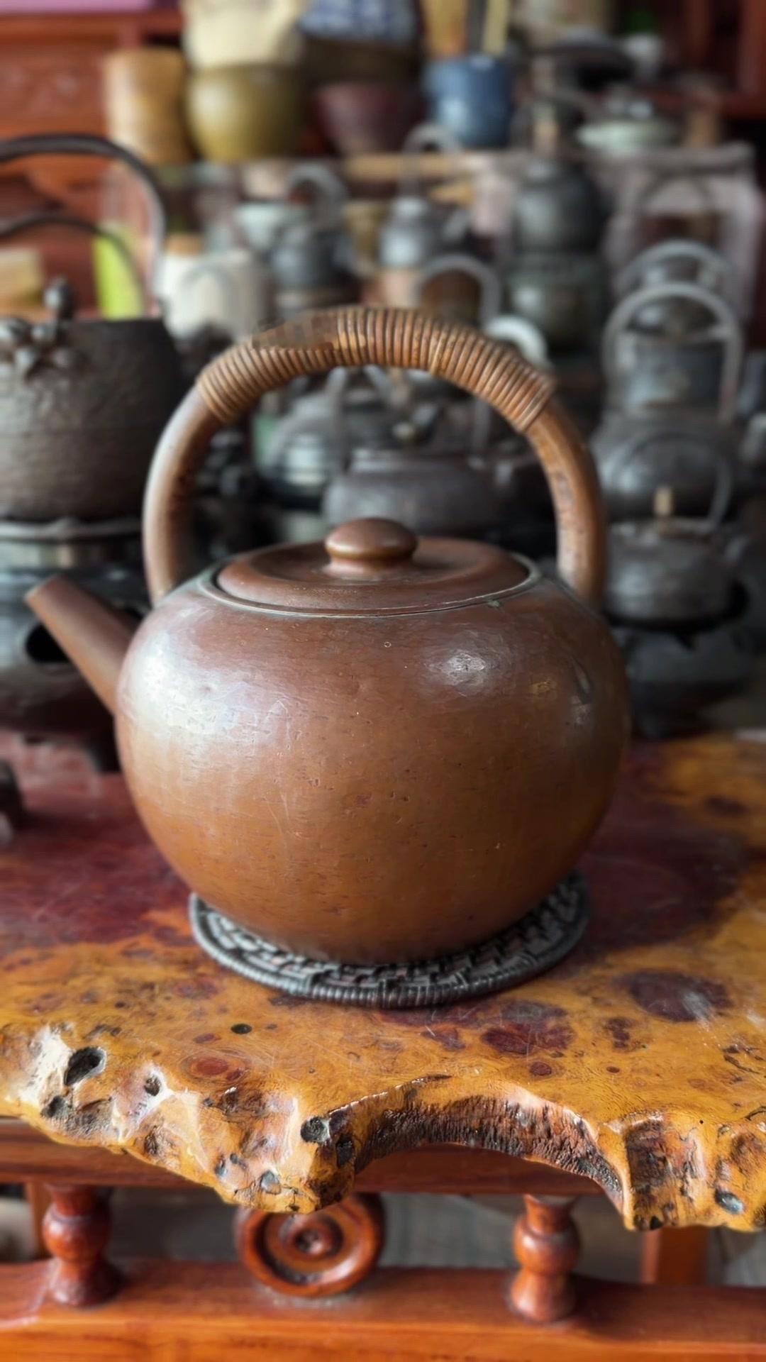 这件明治老铜壶也太绝了吧!🏺这可是压箱底的宝贝,明治时期极品老铜壶,收藏圈都少见的稀罕物。形制特别,土器式保普罗型搭配圆润的苹果圆壶身,最亮眼的是霸气炮嘴壶口,利落大气还不洒漏。 💧1.8升大容积,日常蓄水或茶席煮茶都够用,实用性拉满。工艺更是绝了,纯手工一片手打,壶身每道肌理都带着匠人温度,是机器复刻不出的自然质感。 🍃原配藤把保存完美,温润趁手,搭配古朴拱把设计,拿握稳稳当当。老铜壶包浆温润厚重,铜光流转间满是岁月沉淀的韵味。 兼具实用与收藏格调,自用品茶或藏赏陈设都是点睛之笔,喜欢的千万别错过!