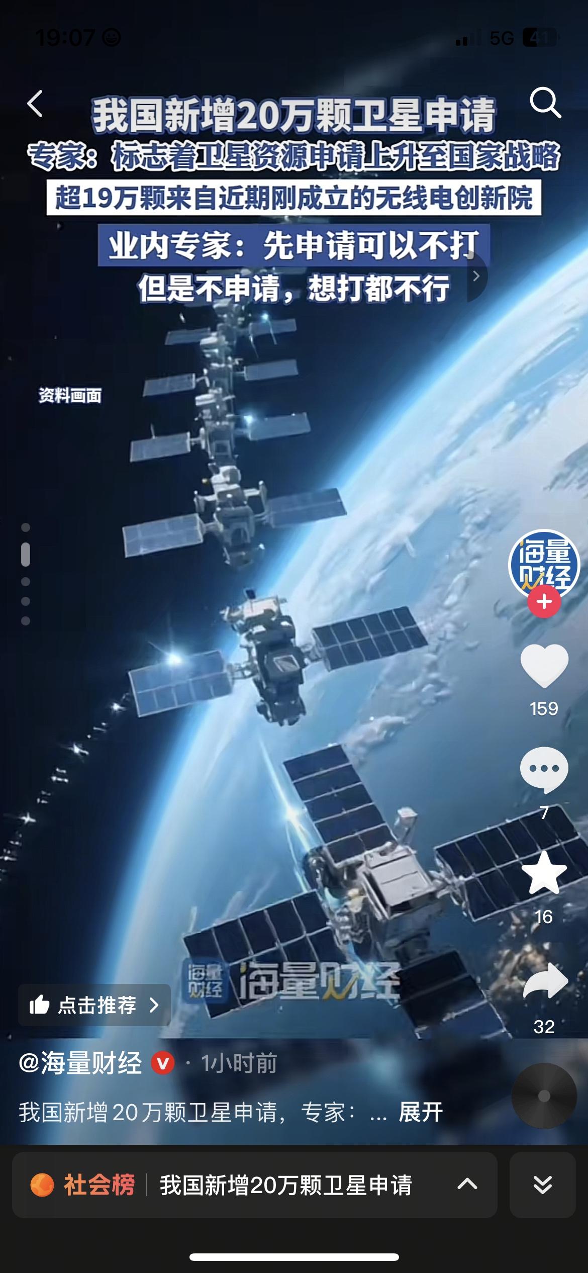 太燃了!我国新增20万颗卫星申请,轨道资源抢占战,中国航天发力了! 好消息!我国新增20万颗卫星星座申请,专家称卫星轨道资源申请已上升至国家战略层面。 中国航天这是要全面赶超SpaceX的节奏啊! 你期待中国航天未来的发展吗?评论区一起为中国航天加油! 中国航天 卫星 SpaceX中国卫星