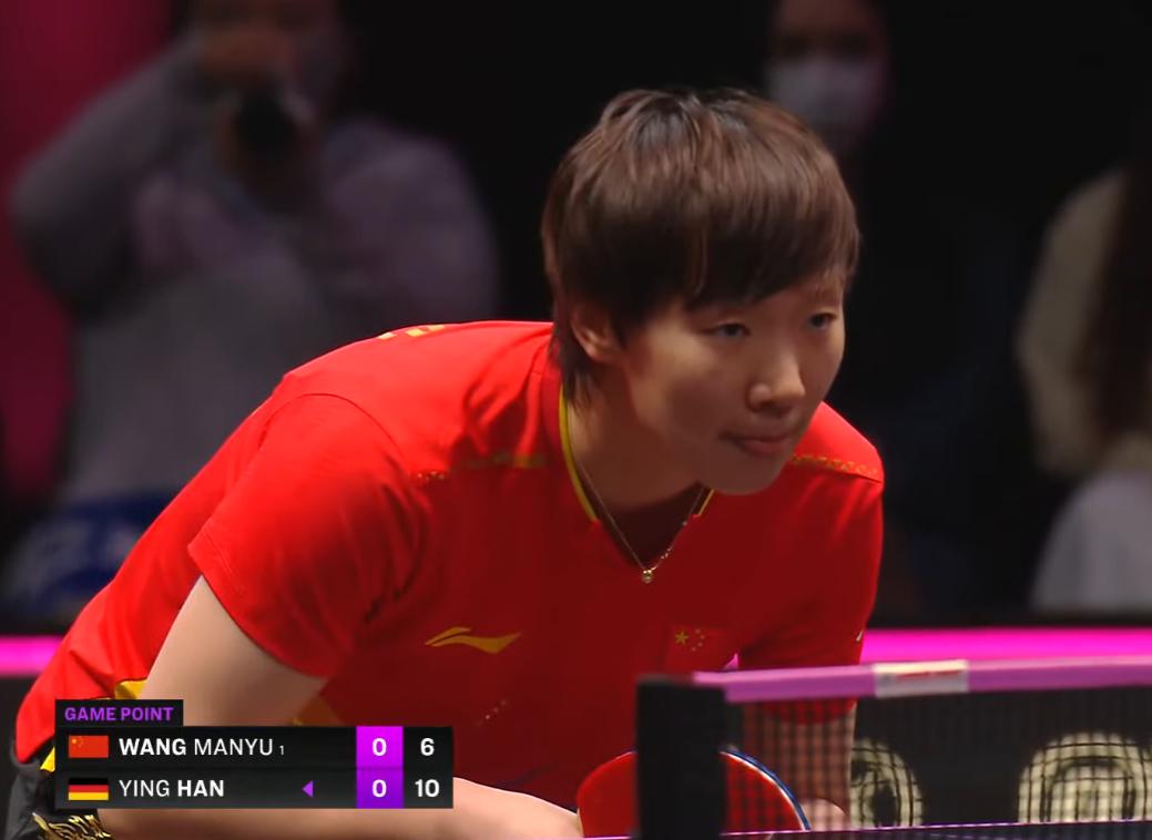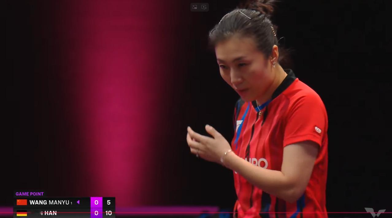 鳗鱼要爆冷吗?开局1:5落后, 韩莹今天改变了战术, 加强了进攻, 让鳗鱼很不适应。 还好韩莹进攻失误率也高, 鳗鱼追到了5:6, 但是回球过高, 又被韩莹抓住机会, 连赢4球, 韩莹10:5拿到了局点, 鳗鱼6:11输了。