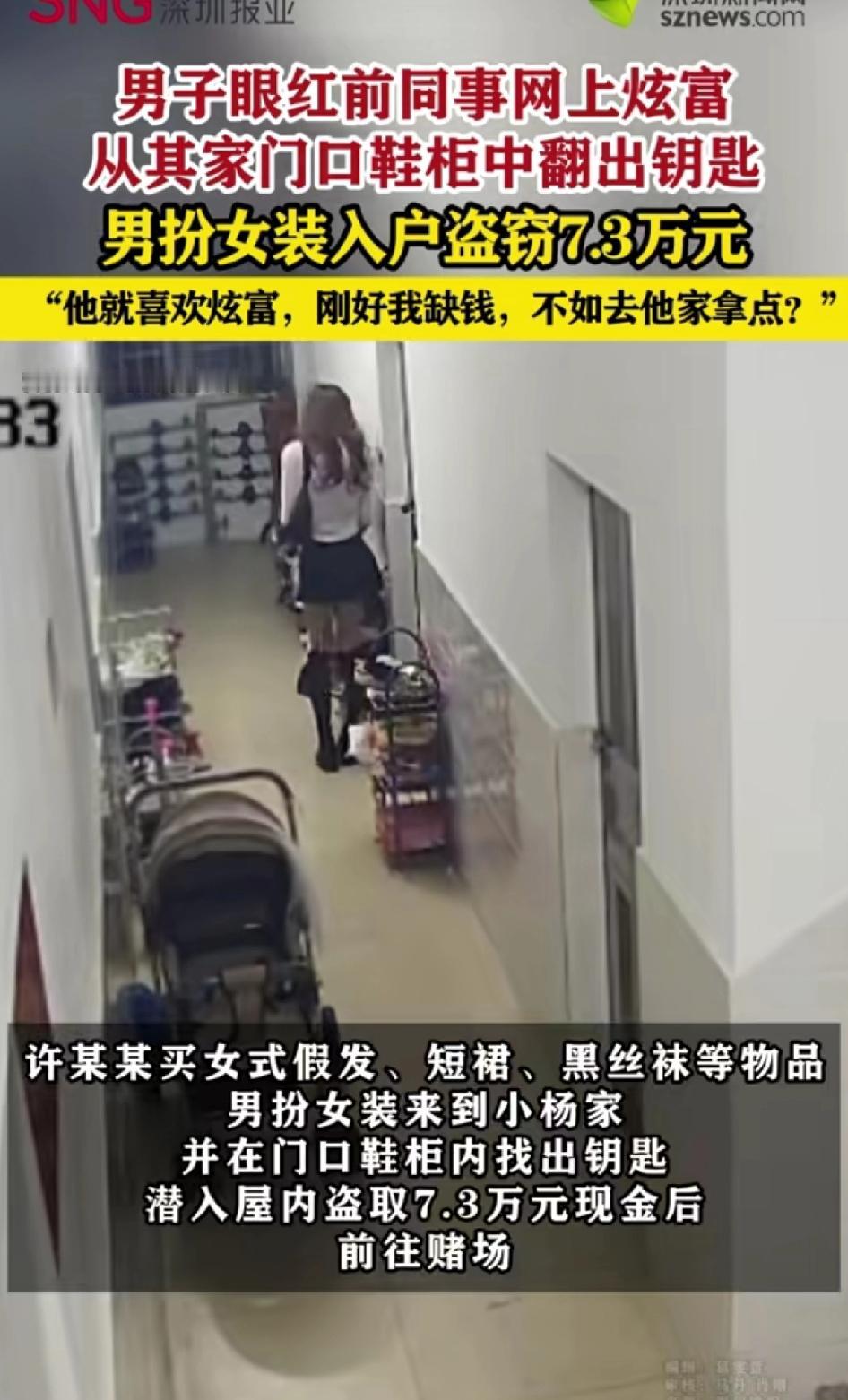 男子眼红前同事网上炫富,“男扮女装”从家门口鞋柜中翻出钥匙,入户盗窃7.3万元。 这许某某真是够荒唐的!就因为前同事小杨在朋友圈炫富,一段现金视频让他动了歪心思。自己缺钱,就想去人家家里“拿”。 他为了不被认出,还男扮女装,买假发、短裙、黑丝袜,半夜跑去作案。凭着之前去过的记忆,爬窗进楼梯拐角,在鞋柜鞋子里找到钥匙进屋。翻遍衣柜没找到钱,最后在床头纸盒里发现好几摞现金,全装进袋子,就留了5块。 得手后去赌场挥霍,以为把女装扔了就能没事。结果小杨发现钱丢报警,警方一看监控,步态怪异的“女子”哪有这体力爬窗,很快就锁定他。最终许某某被判四年半,真是贪念作祟,自食恶果。 快过年咯,这个小杨也够搞笑的!就这个居住环境,鞋子都放外面,连个密码锁都没装,整个走廊放满了臭鞋,还炫富。 俗话说财不外露,再有钱也要藏着点,不怕贼偷就怕贼惦记,到处宣扬自己有钱,就会引来别有用心的人。