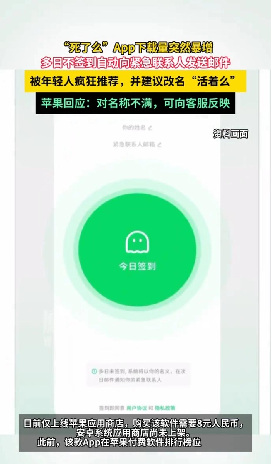 死了么?很多天不签到会联系紧急联系人。 这个APP居然能火,我也是无语了。 其实