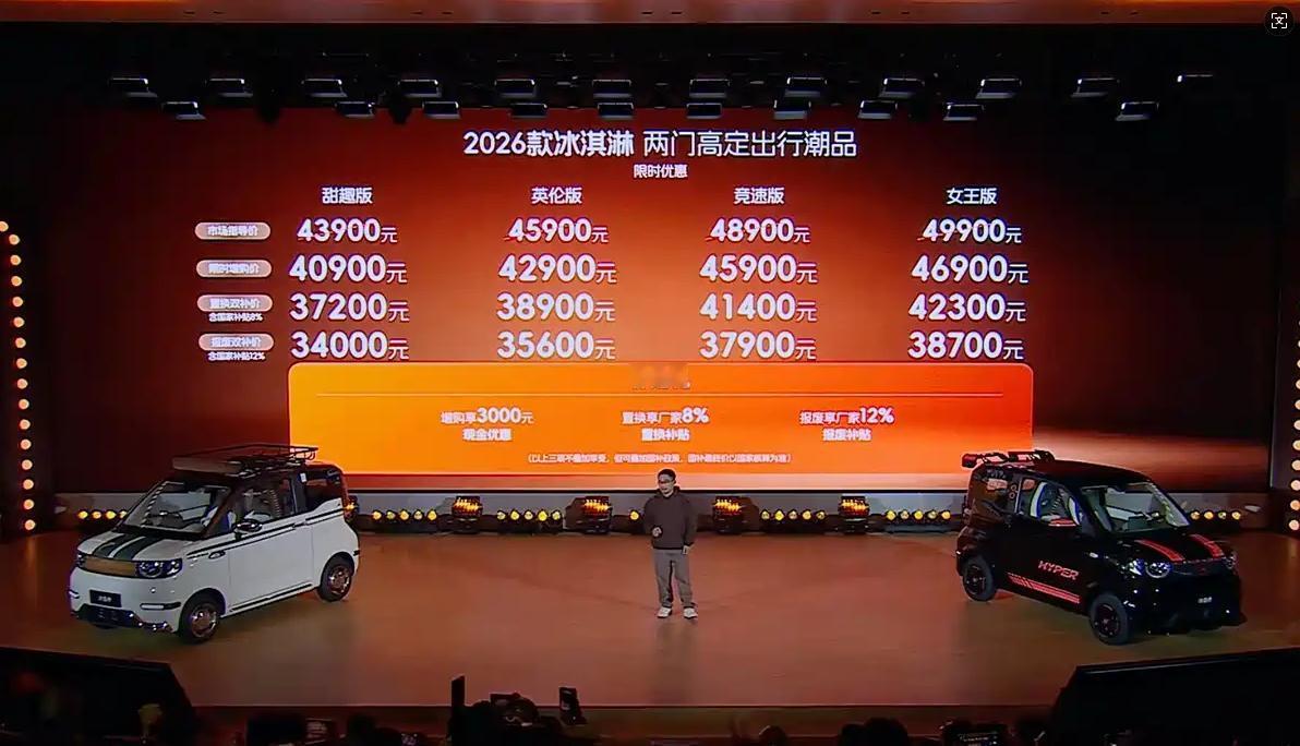 【报废双补价3.4万元起,2026款全新冰淇淋升级了啥?】日前,2026款全新冰淇淋迎来上市,共推出4款车型,报废双补价为3.4-3.87万元。就这个价格,还看啥五菱宏光MINIEV。 先看产品。新车的核心看点就是“四大同级唯一”与“十项同级领先”。其中,皮质多功能方向盘、主驾补光化妆镜、可拓展3个1/4螺纹接口及可拓展行李架&小书包配置,在同级就是唯一。220km续航、22kW直流快充、高强度车身结构等十项技术,主打一个实用与可靠。 此外,坡辅+蠕行模式、无感启动与APP远程操控等功能加持,进一步提升用车体验。 值得一提的是,奇瑞冰淇淋还带来了“女王版”与“竞速版”两款高定车型。其中,女王版以“复古奢华美学”为核心,而竞速版则主打“赛道性能美学”,精准切入A00级市场高价值空白地带。 小结一下:全新冰淇淋的目标很明确,以高定设计、终身质保、场景拓展三大核心价值,锚定4–5万元精品区间,在满足基础代步需求的情况下,进一步为用户提供情绪溢价与个性表达,这一点非常难能可贵。当然,新车的到来,也将进一步夯实奇瑞新能源在A00级精品小车市场的创新引领地位。【来自懂车帝车友圈】