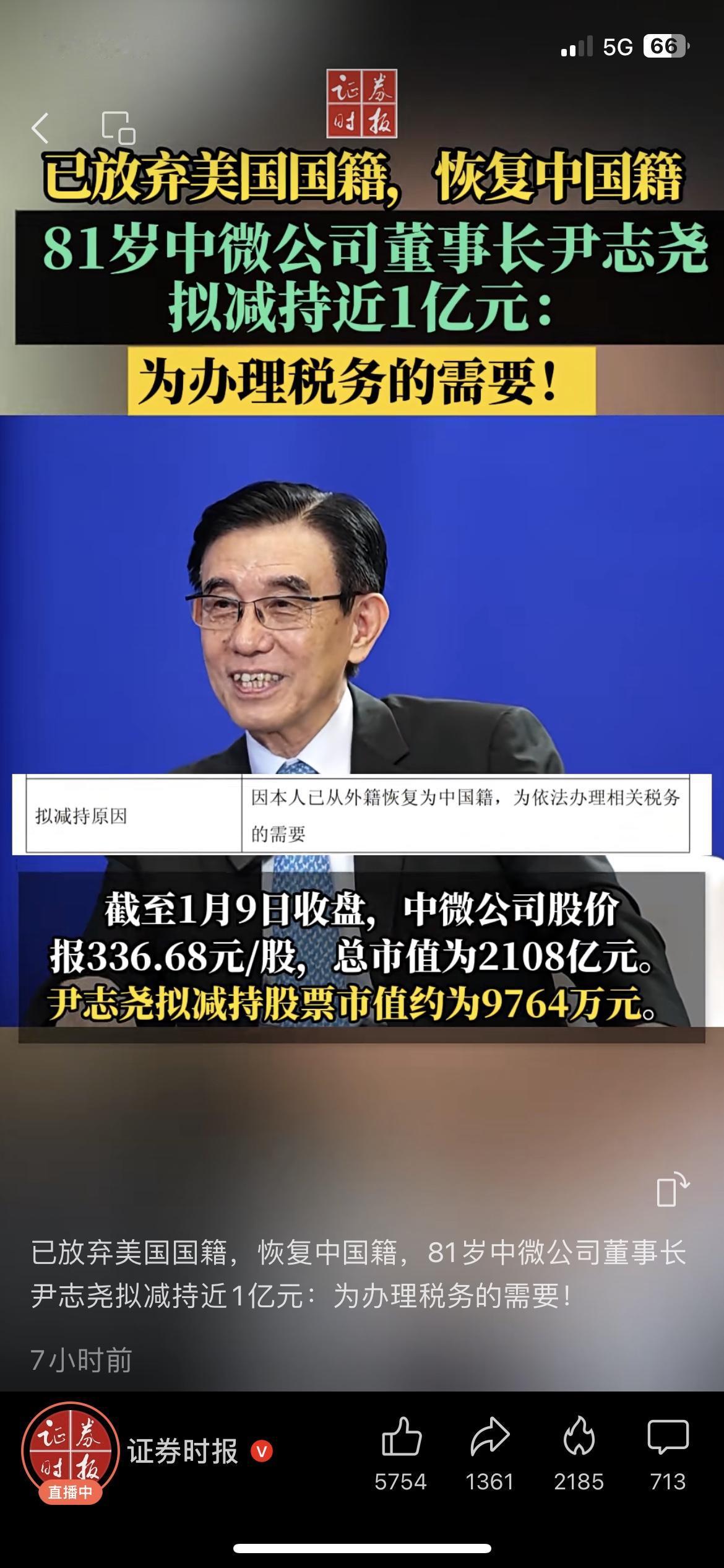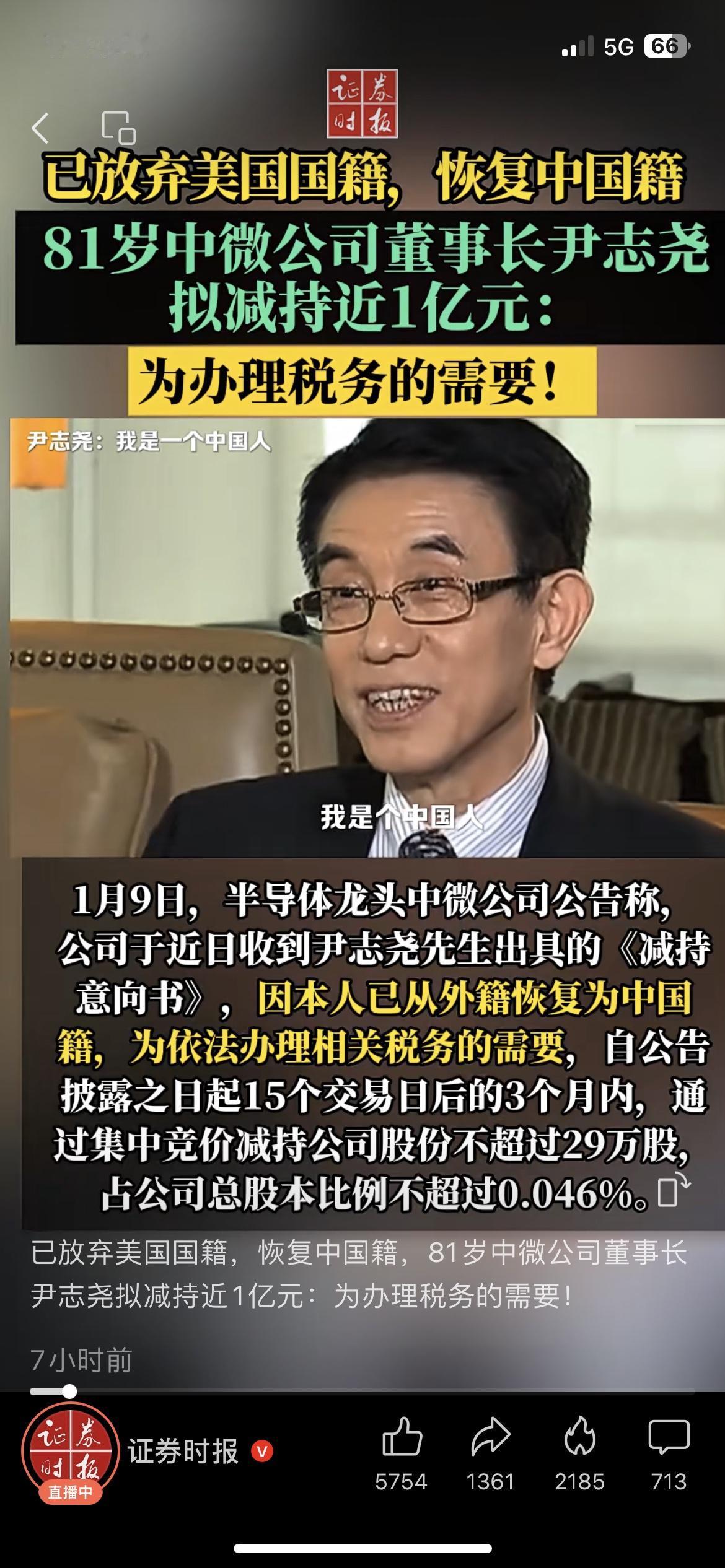 81岁半导体大佬恢复中国籍,减持1亿引热议,真相太暖心 中微公司董事长尹志尧火了!81岁的他放弃美国国籍恢复中国籍,还拟减持近1亿元,网传“套现离场”? 其实真相是为了办理税务需求,这位半导体老科学家一辈子都在为中国芯片事业打拼,回国更是带着一腔家国情怀。 半导体是国家核心赛道,尹老的回归对国产芯片发展意味着什么?评论区说说你的看法! 尹志尧 半导体 中微公司