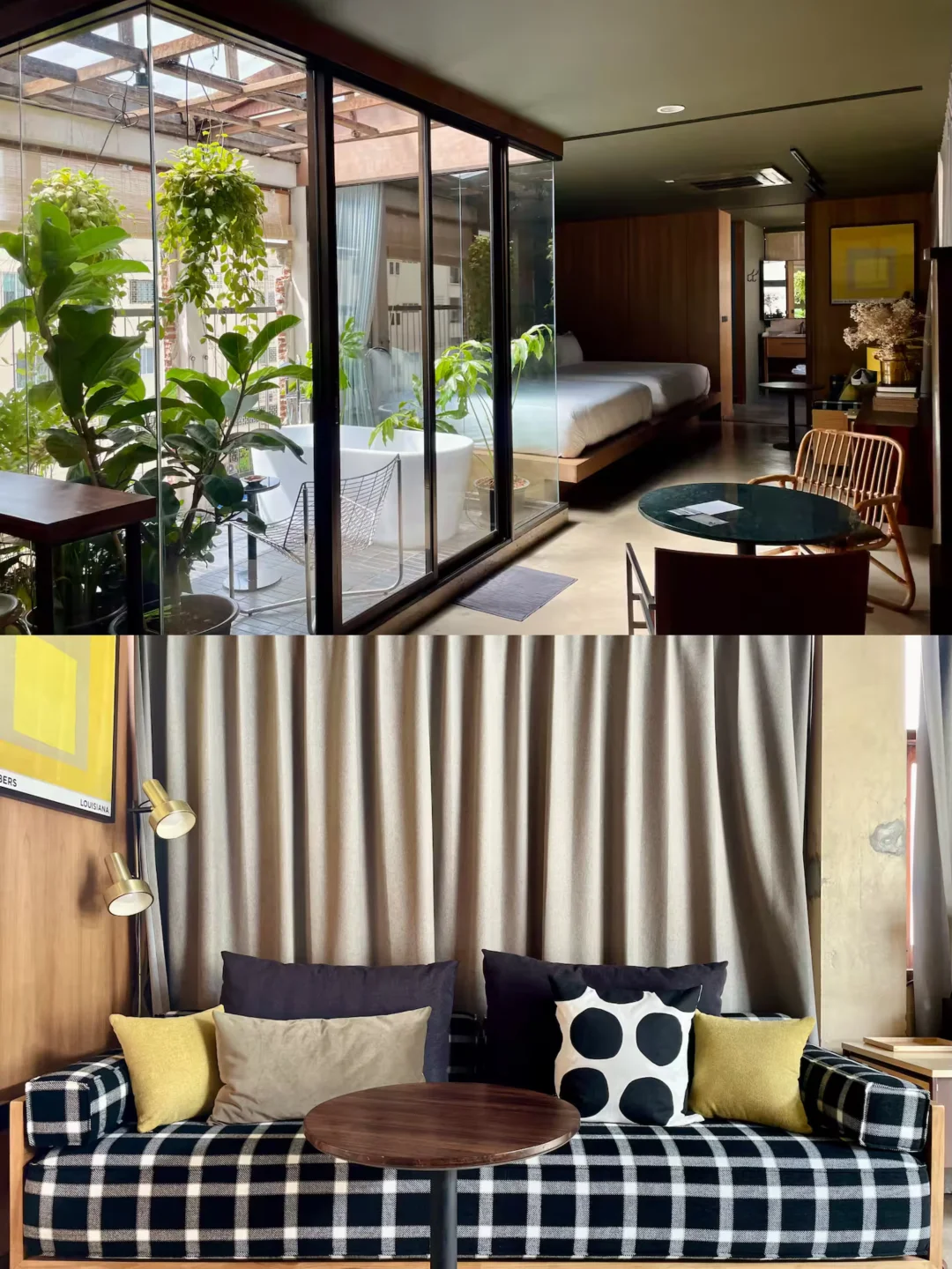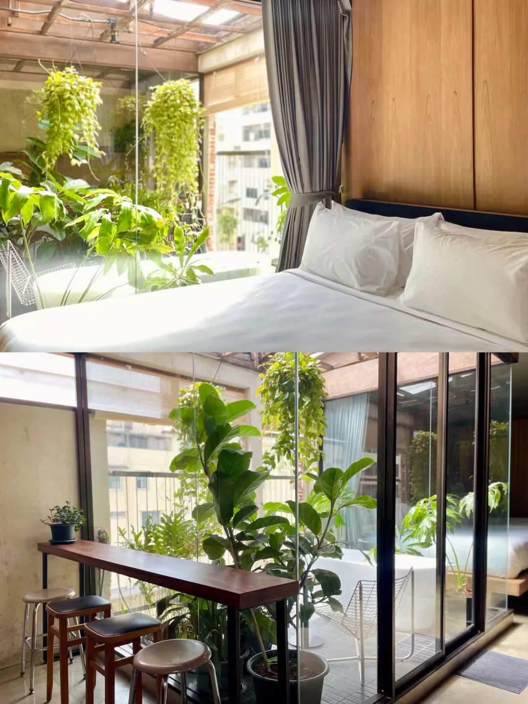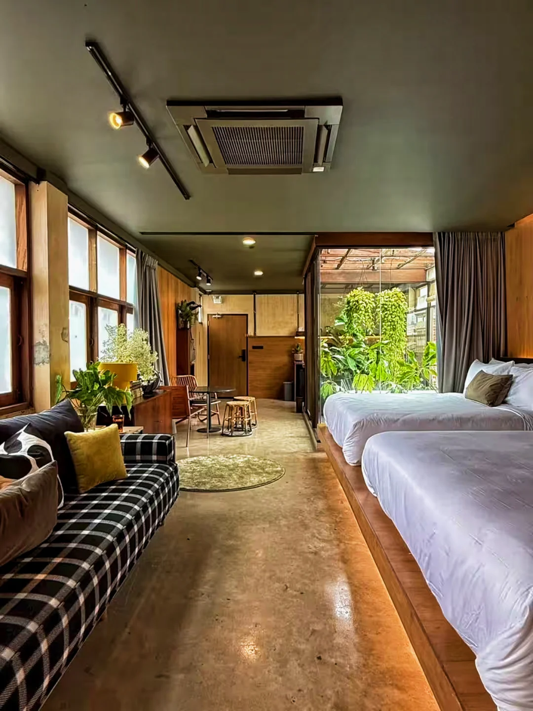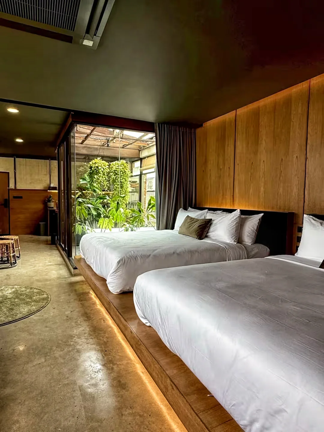 🏠民宿很漂亮很有设计感,在咖啡馆的顶层,可以俯瞰Ong Ang运河,内部是大面积的混凝土纹理和木质装修,以及很有生命力的绿色植被
