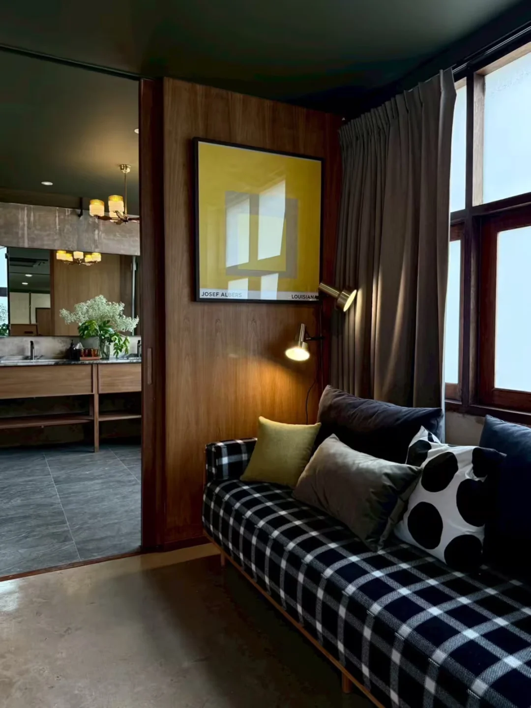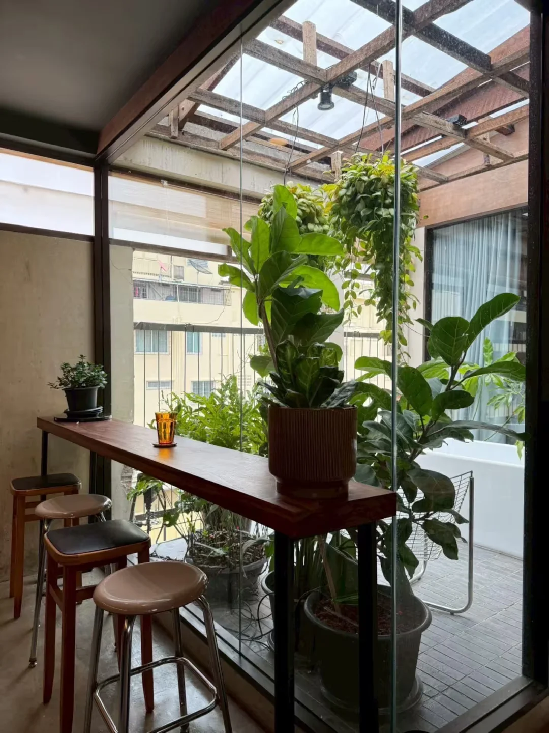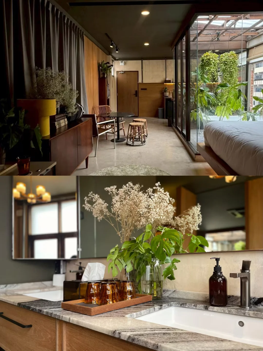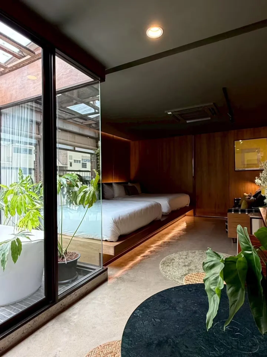 🏠民宿很漂亮很有设计感,在咖啡馆的顶层,可以俯瞰Ong Ang运河,内部是大面积的混凝土纹理和木质装修,以及很有生命力的绿色植被