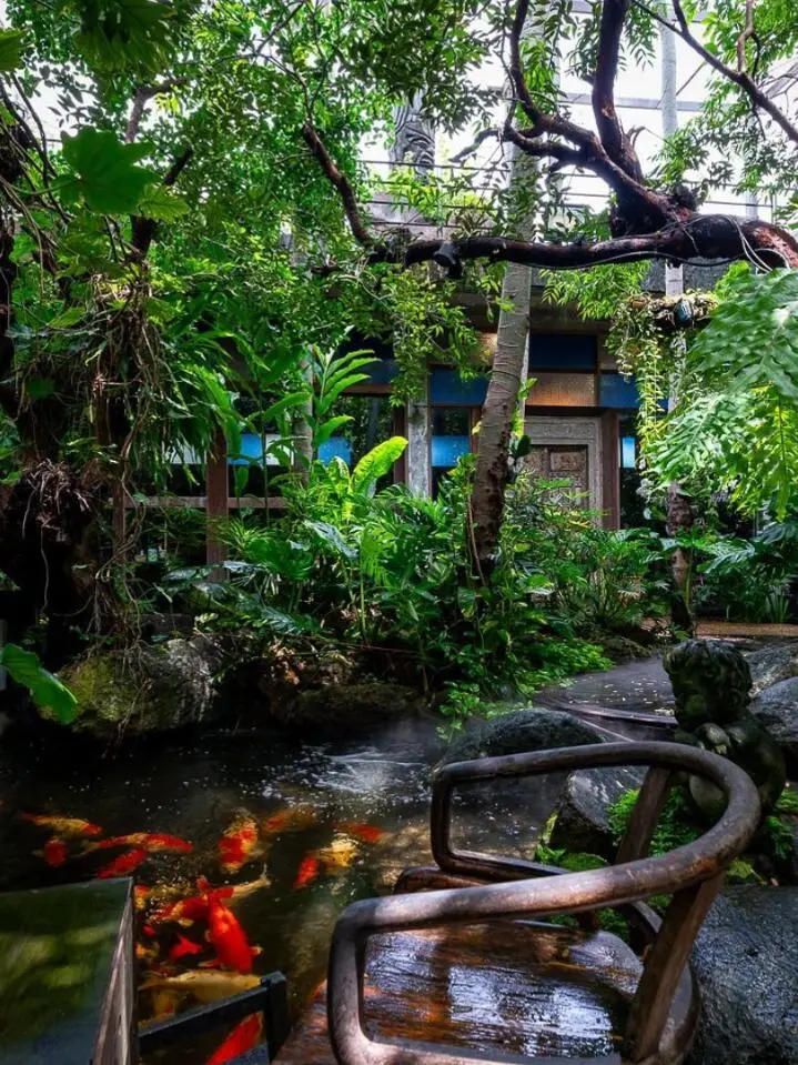 这家简直就是烟雾缭绕的人间仙境,郁郁葱葱的热带雨林,漂亮的鲤鱼池塘和瀑布,阳光透过植物的空隙照射下来形成美妙的丁达尔现象