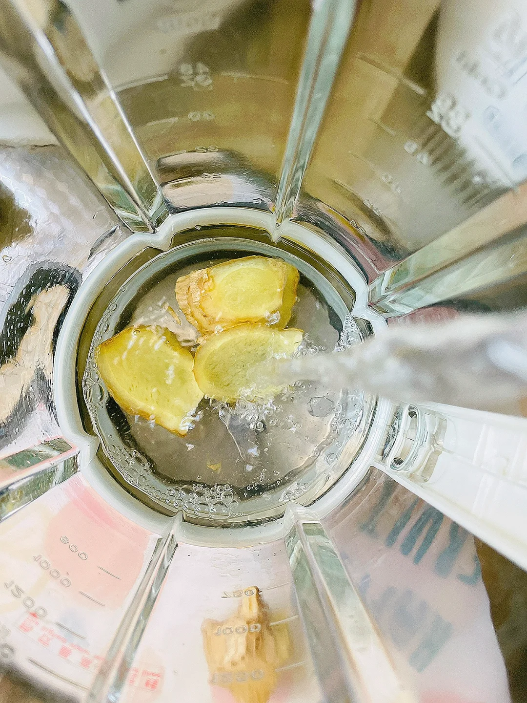 3.将切好的生姜和备好的柠檬水倒入破壁机。