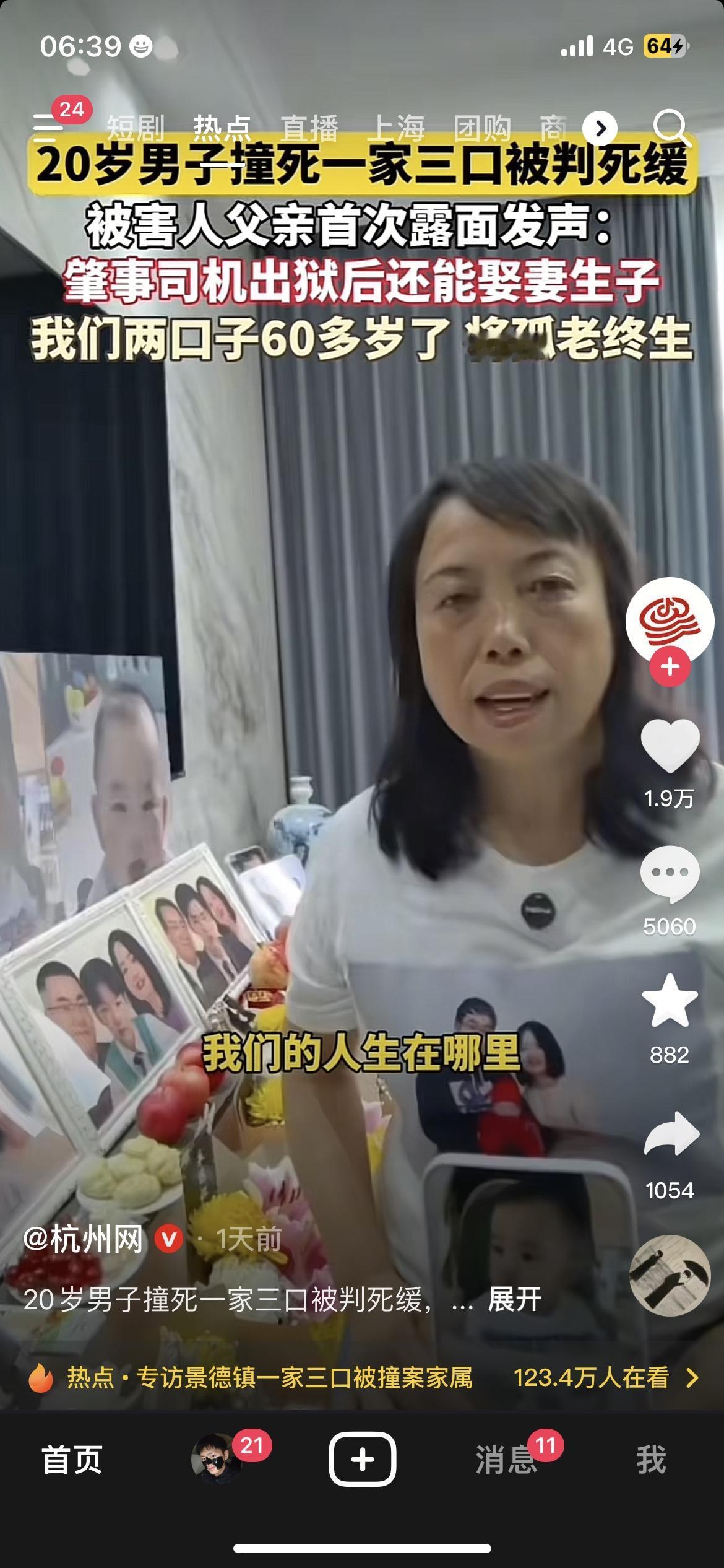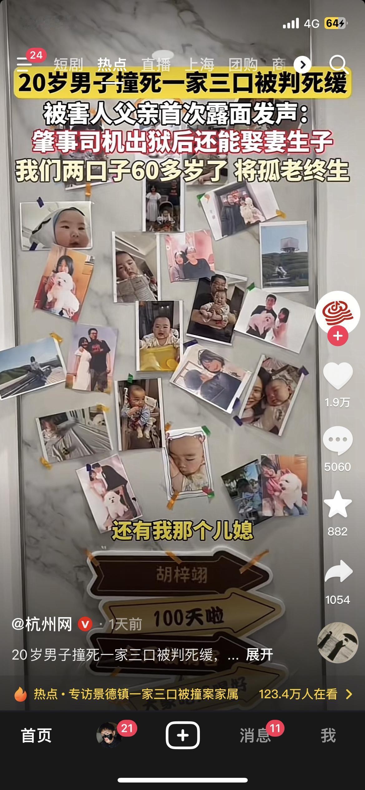 景德镇20岁男子撞死一家三口被判死缓 死缓!20岁撞亡一家三口,家属要抗诉? 景德镇这场悲剧终于等来一审判决,20岁肇事者因以危险方法危害公共安全罪获死缓。法院考量了他有自首、紧急避让等情节,但受害者老两口痛失儿孙,整年靠吃药入眠,坚持要死刑立即执行。 法律自有其严谨逻辑,但大众的悲痛从来都是感性的。正义不仅要合法理,更要暖人心——司法判决不能只算“法律账”,还要顾“情感账”。 现在家属要申请抗诉,这场关于“公道”的博弈还没结束。 投票:你支持家属抗诉吗?A.支持 B.不支持 C.理性看待 你觉得这个判决合理吗?评论区说说你的看法!景德镇肇事案