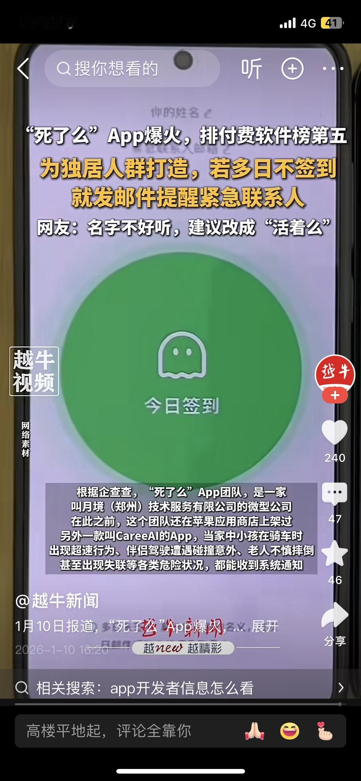 “死了么”App爆火,排付费软件榜第五 离谱!一款叫“死了么”的App突然爆火,直接冲上付费软件榜第五,独居的人却抢着买! 光看名字吓一跳,实际功能超实用——专为独居人群设计,长时间不签到就自动联系紧急联系人,妥妥的独居安全神器。 网友们吵翻了:有人说名字太晦气,有人夸功能太刚需! 投票:你会下载“死了么”App吗?A.会,刚需 B.不会,名字太晦气 C.观望,等优化 你会给独居的自己或家人安排吗?评论区见!
