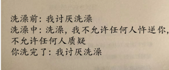 洗澡前:我讨厌洗澡 洗澡中:洗澡,我不允许任何人忤逆你,不允许任何人质疑你 洗完了:我讨厌洗澡