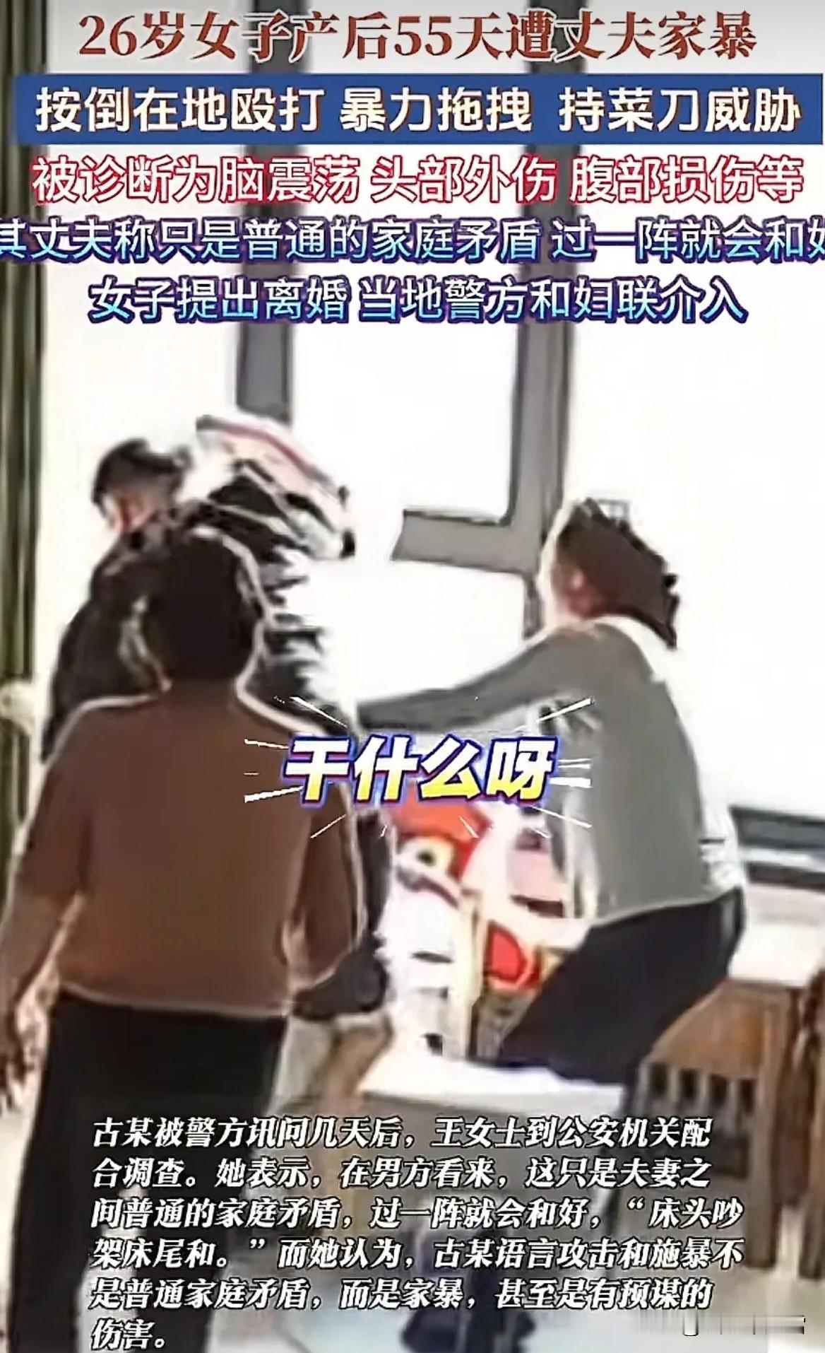 1月5日报道,河北张家口26岁女子产后55天,在家带孩子,因感觉空气有点冷,让丈夫挪下空气净化器,两人斗了几句嘴。 万万没想到丈夫竟突然发了疯,对女子拳打脚踢,甚至拿刀威胁,中间丈母娘和婆婆劝都劝不住。 这位26岁的女子姓王,和丈夫古某都是95后,2024年经人介绍相识,古某经营建材生意,当初许诺让王女士婚后帮忙打理公司、成为股东,这份期待让她很快答应了婚事,怀孕后两人正式登记结婚,2025年10月迎来了儿子的降生。 谁能想到,这份看似圆满的婚姻,在她产后还没出百天就迎来了如此狰狞的一幕。 事发当天,王女士刚给孩子喂完奶,产后伤口还隐隐作痛,连续熬夜带娃让她浑身乏力,只是觉得空气净化器的风直吹后背,才随口让丈夫挪一下,没成想换来的却是一句不耐烦的“你自己想办法”。 争执没几句,古某就像变了个人,抬手就朝她头部挥拳,监控视频里36秒的画面,记录下他四次重拳、揪着衣领拖拽的暴行,连试图劝阻的婆婆都被吓得摔倒在地,他还冲进厨房拿出菜刀拍在餐桌上,嘶吼声让襁褓中的婴儿吓得啼哭不止。 法医报告显示,王女士当天被打成脑震荡,伴随应激反应,腹部的淤青距离哺乳伤口仅3厘米,左手小指因拖拽留下的伤痕许久未消。 更让人心寒的是,古某在派出所审讯时还念叨“家务事怎么报警”,承认动手却坚称“没想真伤她”。 这种认知偏差并非个例,《发展心理学》期刊指出,男性成为父亲后,睾酮下降比女性激素变化更慢,情感投入往往滞后,很多新手爸爸还没适应角色转变,就把育儿责任完全推给妻子。 王女士的手机里存着23条聊天记录,古某偶尔会关心孩子,却从未问过她产后恢复得如何,夜间孩子哭闹时,他始终是鼾声如雷的那一个。 产后55天,正是女性身体和心理最脆弱的阶段。世界卫生组织统计,全球约10%-15%的新妈妈会经历产后抑郁,我国这一比例因社会支持不足可能更高,而产后1个月到1年内,也是夫妻矛盾的高发期。 王女士产后激素剧烈波动,侧切伤口未愈,每天要起来三四次夜奶,睡眠严重不足,情绪本就容易波动,丈夫的漠不关心早已让她积压了诸多委屈。 《中国婚姻家庭报告》显示,73%的夫妻在产后第一年争吵明显增多,34%会因矛盾分房睡,责任失衡、情感失语、身体失信这三颗“隐形炸弹”,往往会让本就紧张的夫妻关系彻底破裂。 古某显然没意识到,妻子让他挪空气净化器的背后,是渴望被关心、被分担的诉求,而他的暴力行为,直接将妻子推向了创伤后应激障碍的边缘。 我国《反家庭暴力法》明确规定,哺乳期妇女遭受家庭暴力应给予特殊保护,施暴者的行为已构成违法,严重者还可能触犯刑法。 事发后,桥西区明德南街派出所已立案调查,妇联也主动联系王女士提供帮扶,公益律师为她提供法律援助,但她现在独自住在母婴酒店,床头还放着没拆封的《反家暴法》宣传册,生怕丈夫知道地址后再施暴。 桥西区法院的统计数据显示,涉及哺乳期妇女的家暴案件调解成功率不足15%,多数施暴者会在六个月后卷土重来,这也让王女士的未来充满不确定性。 婚姻的意义从来不是单方面的付出,孩子的到来更不是矛盾的导火索,而是考验夫妻同心的试金石。 母爱是本能,父爱却需要主动学习和投入,当妻子在产后承受身体和心理的双重压力时,丈夫的一句关心、一次分担,都能成为支撑她的力量。 法律能制裁暴力行为,却难以修复破碎的情感,真正的家庭和谐,需要夫妻双方共同承担责任,学会沟通与共情。 产后第一年是婚姻的“渡劫期”,唯有拆掉责任失衡的枷锁,打破情感失语的壁垒,才能守住爱情与家庭。 各位读者你们怎么看?欢迎在评论区讨论。