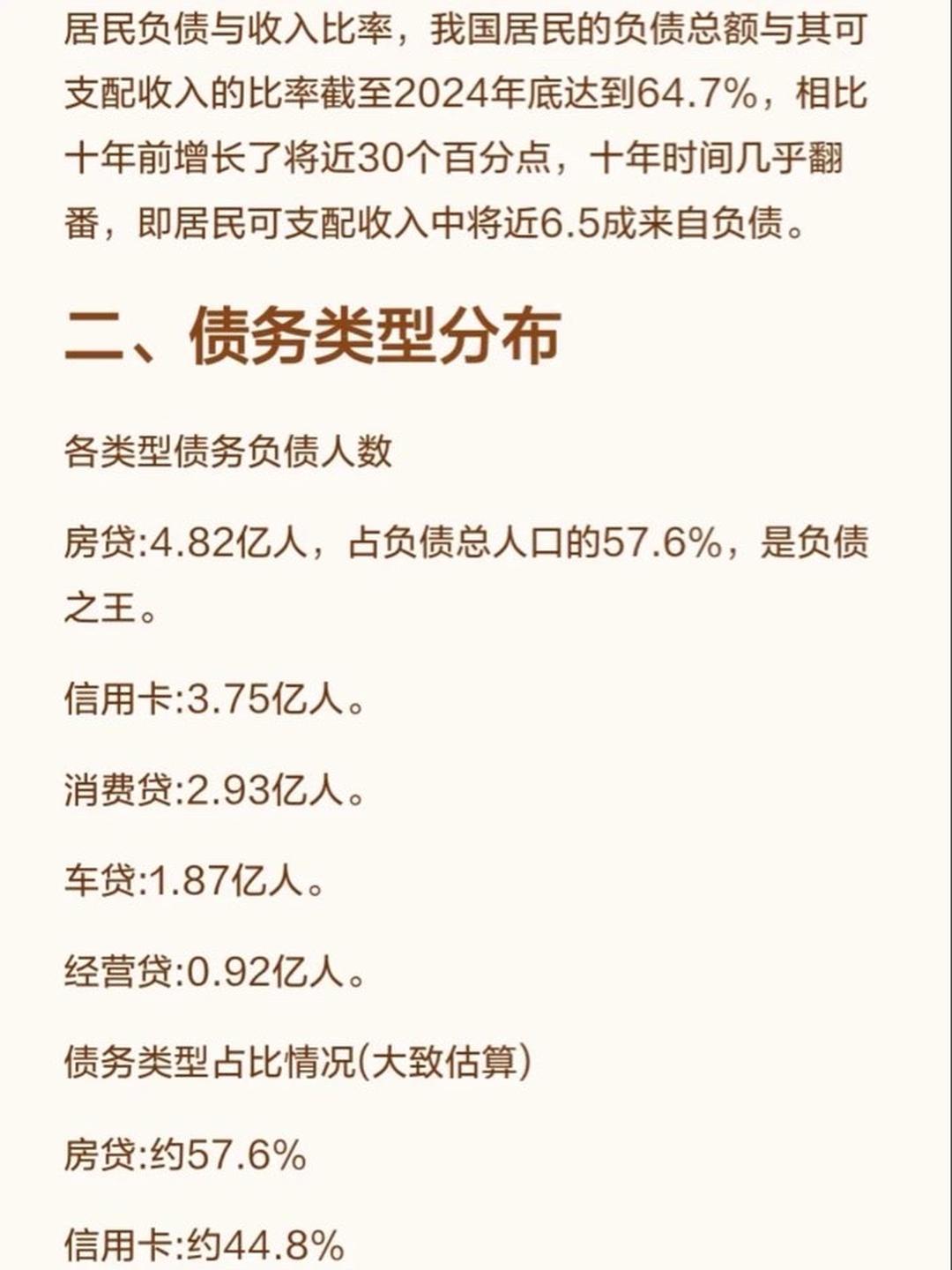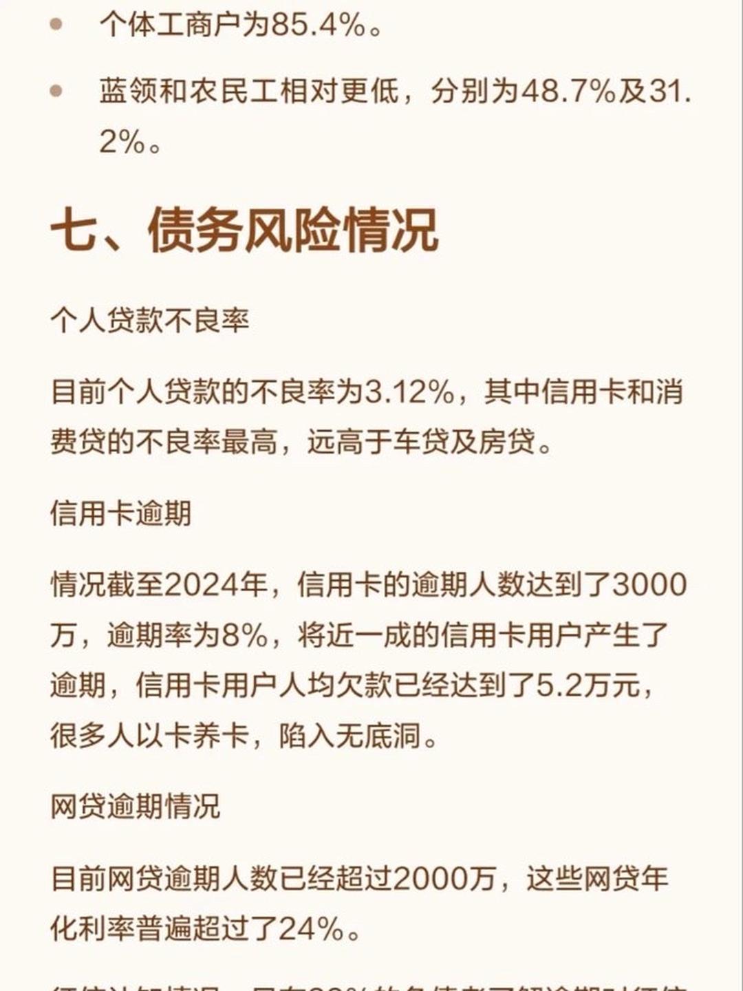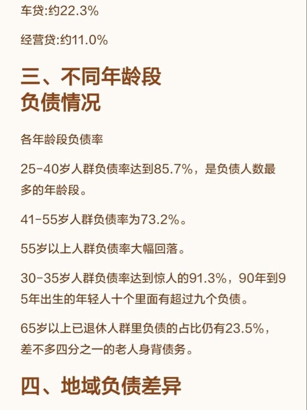 昨天中国人民银行发布了国内的负债数据,目前国内11.5亿成年人,负债比例73%,同时有房贷跟车贷的人有6.5亿,占负债人群74%。 目前国内负债大头就三种房贷:4.82亿人,占57%信用卡:3.75亿人 车贷:1.87亿人 20到40岁的人,负债85% 40到55岁的人,负债73% 好消息是、55岁之后就很少有负债了 大家努力活到55岁 国内信用卡的违约率最高,为3% 人均信用卡欠款5万人民币 2024年,信用卡逾期人数是3000万张 还有个数据挺有意思的 大学本科以上,负债概率为85%高中学历以下,负债概率为42%根据这个数据,得到的结论: 大家不读书,活到55岁就没有负债了[捂脸]