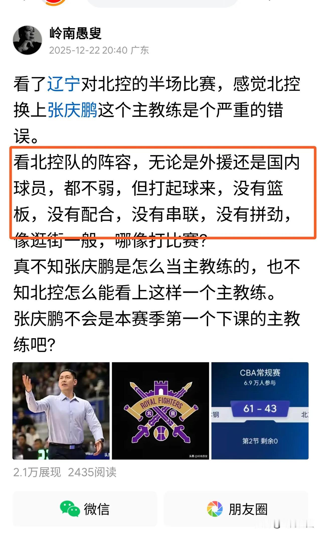 能否当好一个主教练,首先得掂量掂量自己的驾驭能力有几斤几两,而不是自己当球员时有多牛。 刘炜也好,张庆鹏也罢,当球员时能力确实不错,但当主教练还是缺些火候。倒不是技战术有什么问题,而是驾驭不了球员,无法把球队拧成一股绳,无法让球员发自内心地去执行自己的战术部署,无法让队员为自己去拼命。 刘炜下课了,估计张庆鹏离下课也不远了。 不是现在说张庆鹏有问题,本赛季第4轮,看北控作客辽宁的比赛就明显看出,北控队是一盘散沙,那个时候就断定张庆鹏带队有问题了。 现在北控队的问题已公开化,张帆公开批评张庆鹏″水平太差″,张庆鹏弃用张帆。 如果仅仅是张帆一个人还好办,看北控队现在的状态,绝对不止张庆鹏与张帆的矛盾。 张庆鹏会下课吗? 张庆鹏离下课还有多远?