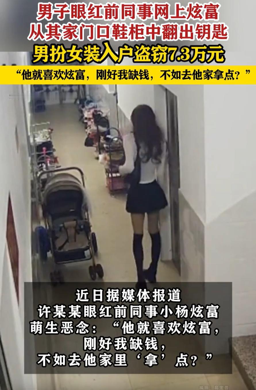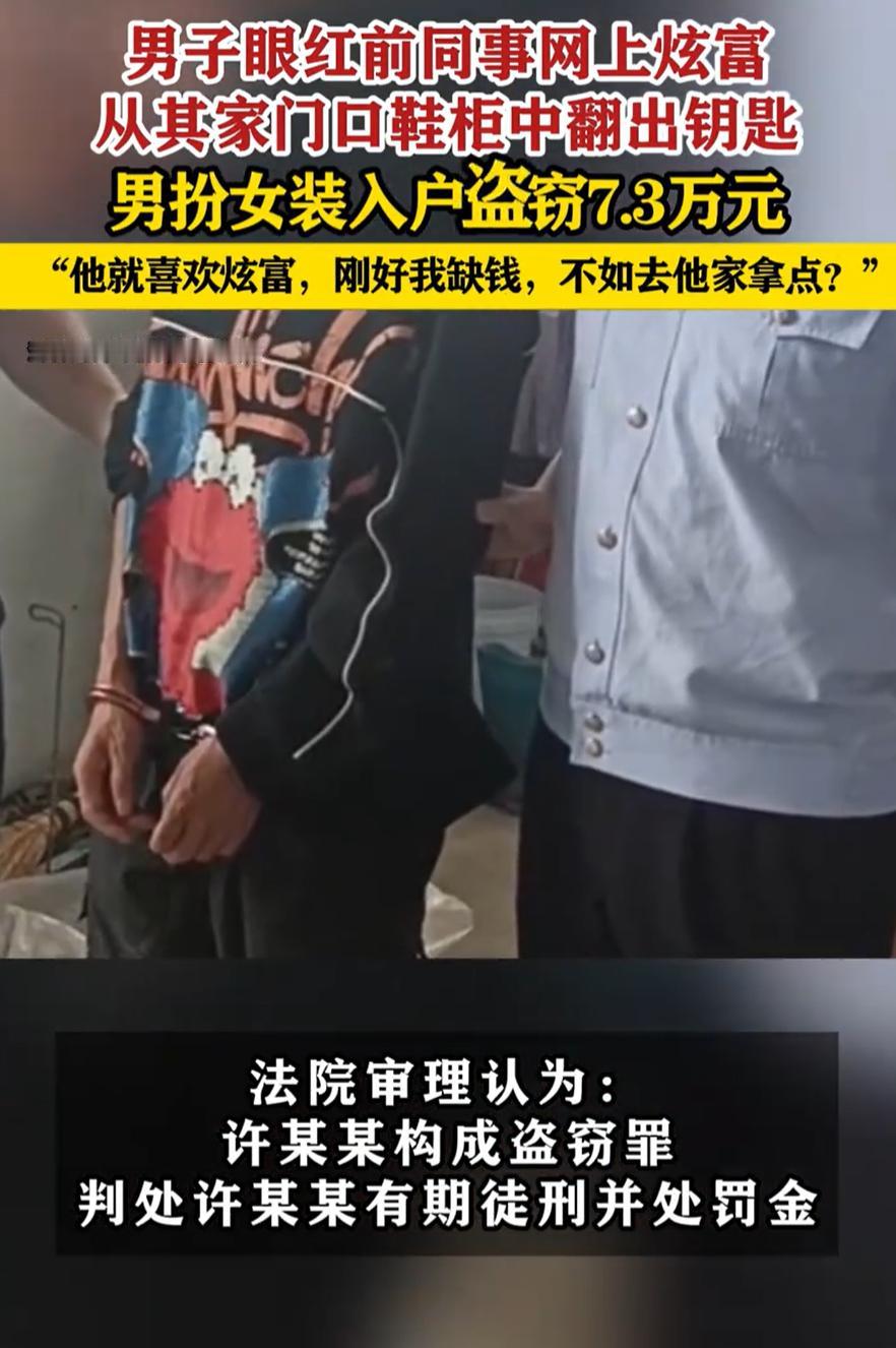 离谱!福建,一男子喜欢在网上炫富,动不动就拍一摞现金发到朋友圈里,谁知,这一举动却引起了前同事的眼红,于是买了一套 女装,直接男扮女装入户盗窃7.3万元,事后被抓,前同事坦言:他就喜欢炫富,刚好我缺钱,不如去他家拿点 刷朋友圈这事,如今成了很多人的日常习惯。有人晒美食,有人晒旅行,也有人喜欢晒点特别的。男子小杨,就有一个习惯,喜欢在网上晒现金。一摞摞的百元大钞,拍成视频发到朋友圈里,看着确实挺扎眼。他可能觉得这是自己的生活方式,没什么不妥,却没想到,这个习惯被一个人盯上了 盯上他的人,是他的前同事许某某。许某某失业后手头一直很紧,某天刷朋友圈时,正好看到小杨发的现金视频。那一沓沓红钞票,在许某某眼里格外刺眼。他想起以前和小杨共事时,就听说小杨喜欢在家里放现金,不太爱用银行卡。一个念头突然冒了出来 这念头一起,就再也没压下去。许某某知道这事有风险,小杨肯定认得自己,得想办法伪装。他琢磨了半天,竟然想出一个办法:男扮女装。说干就干,他直接去服装店买了假发、短裙和黑丝袜,把自己打扮成女性模样 等到半夜,许某某换上这身行头,打车去了小杨住的小区。因为两三年前去过一次,他还记得路。到了楼下,他没走正门,而是从楼梯拐角的窗户爬了进去,轻手轻脚上了楼。到了门口,他想起小杨习惯把备用钥匙放鞋柜,一翻,果然找到了 小杨发现丢钱,其实也很偶然。纸盒被碰倒,才意识到问题。报警、调查、供述,一步步走下来,就抓到了前同事许某某。到案后,许某某交代得很干脆,承认自己是一时眼红,才动了歪心思 这事听起来有点离奇,男扮女装入室盗窃,像是电影里的情节,但背后的问题其实很现实 小杨喜欢在朋友圈晒现金,从法律上讲,这当然没什么错,那是他的自由。但从安全角度来说,这种行为确实存在风险。朋友圈不是真正的私密空间,好友列表里未必都是真正可信的人。过度展示财富,尤其是现金、贵重物品存放习惯等细节,无形中给自己埋下了隐患。这不是责怪受害者,只是提醒一句:生活可以分享,但隐私和财产安全这根弦,还是得绷紧一些 而许某某的行为,则是典型的“见财起意”加上侥幸心理。他看到前同事有钱,自己正缺钱,就把法律和道德全抛在了脑后。男扮女装看似聪明,其实在监控遍布的今天,这类伪装很难真正瞒天过海。说到底,眼红别人不如踏实赚钱,走歪路迟早要还 财富是自己的,怎么支配、展示都是个人选择,但安全意识不能丢。同样,面对他人的财富,可以羡慕,但绝不能伸手去“拿”。凭自己本事挣来的,花着才踏实