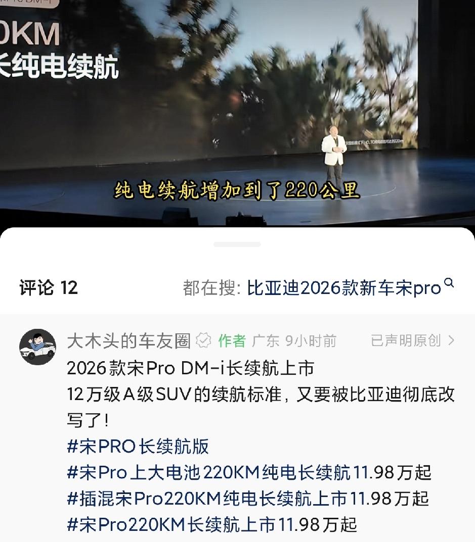 比亚迪又在开始卷了,现在2026款的上市了。 可以说是真正遥遥领先,就以比亚迪宋来举例,26度的电池可以做到纯电续航220km,要知道早几年的比亚迪秦还是轿车,20多的电池包只能开100到120km左右,如果跑高速的话,续航应该就在100km以内。现在比亚迪宋的是SUV,26的电池就可以跑220km,这是什么概念?这真的是技术遥遥领先,非常非常的提升先进了。 可以说没有比亚迪,中国汽车新能源行业废了,比亚迪才是真正做技术的,比其他的卷冰箱,彩电,大沙发,强太多。