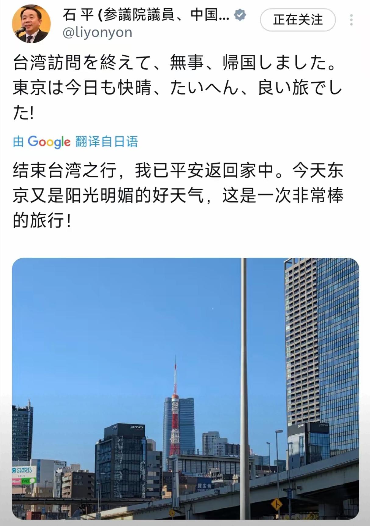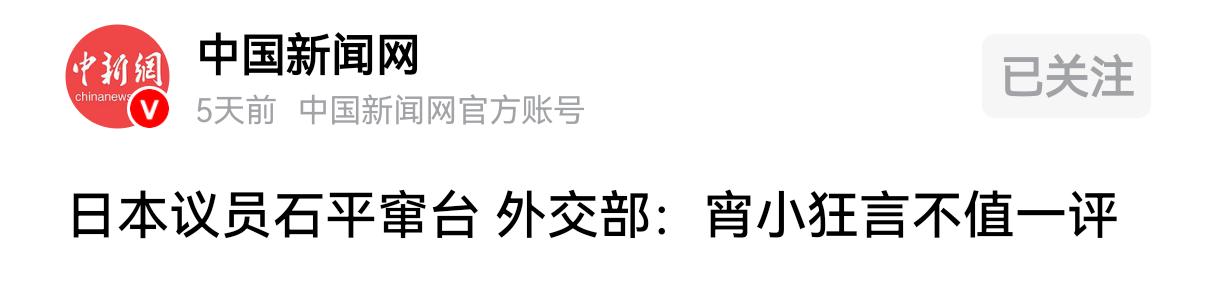 石平窜访台岛被骂汉奸后安全返日,发文感叹:东京又是阳光明媚 汉奸石平太郎1月6号前往台岛进行为期4天的窜访。此人刚一落地,马上就在机场遭到了抗议。在随后参加活动的现场,还有人直接拿着汉奸的牌子叫嚣让石平太郎滚出去。还有反对者在街头喊话,说他是一个连日本人都看不起的汉奸(这确实是实话)! 1月10号,狼狈的石平太郎总算结束了为期4天的荒唐之旅返回了日本,回到东京之后,心里的一块大石头总算落了地,稳了稳心神,在自己的社交媒体上写了一段话,他说“结束台岛之行,我已平安返回家中,今天东京又是阳光明媚的好天气,这是一次非常棒的旅行”! 这个时候这个汉奸说出这样的话,一方面算是给自己这4天的狼狈之行画下一个句号,对外展示出自己做事有始有终。而另外一方面,也是对于大陆的一种挑衅。表示自己安全地往返台岛并没有受到大陆的制裁。石平太郎自认为,自己通过这个做法表达了强硬的立场。 但实际上并不是这样的,我国外交单位对于石平太郎的这次窜访之旅早就已经有过定性,宵小之徒不值一评。 石平太郎有点过于的高看自己的影响力和地位了,他只不过是螳臂当车而已,注定要被钉在耻辱柱上。