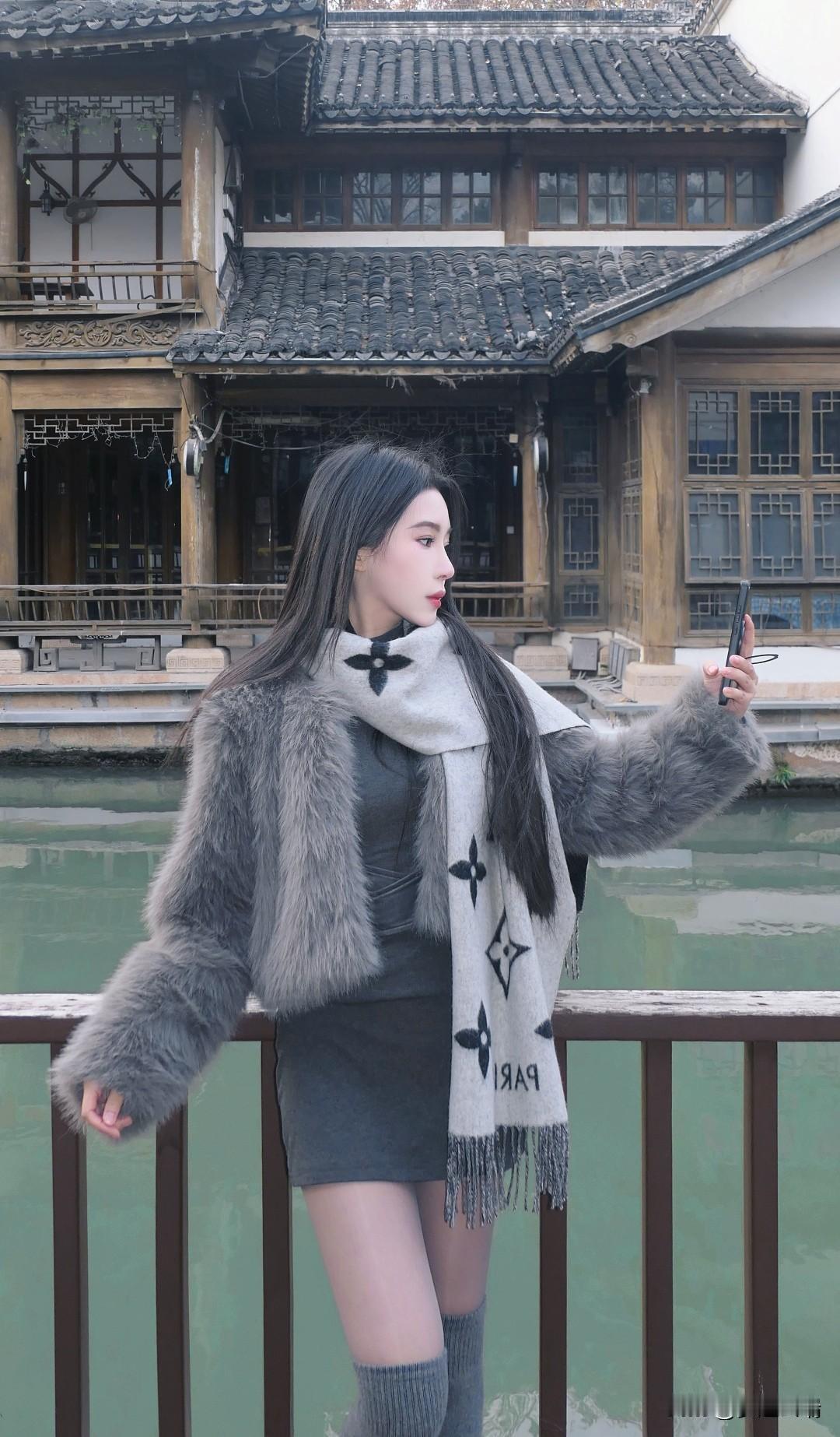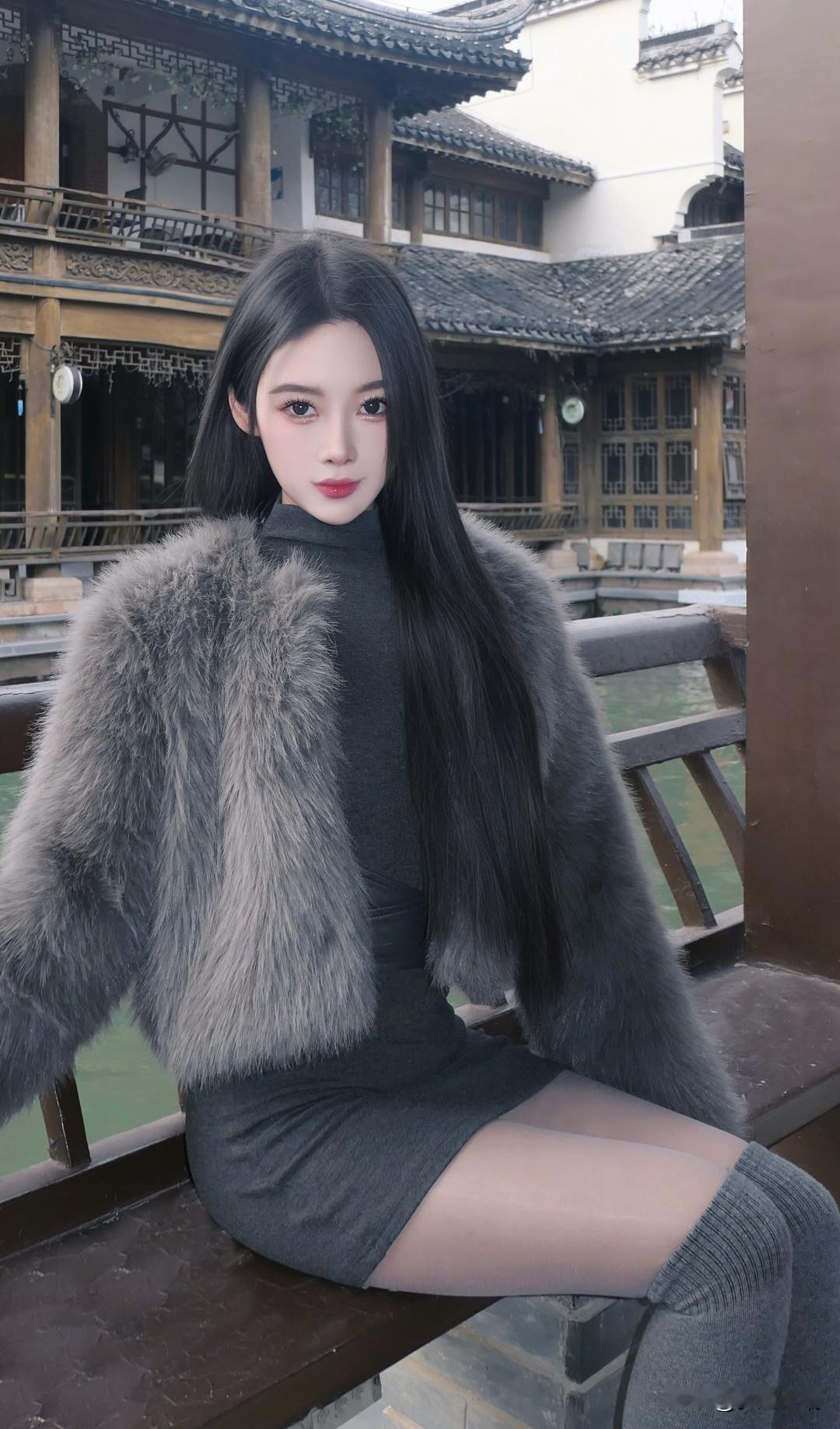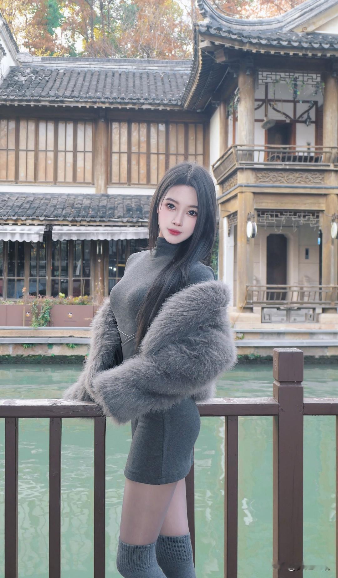 桥上美人倚栏杆,水边风景入画来。