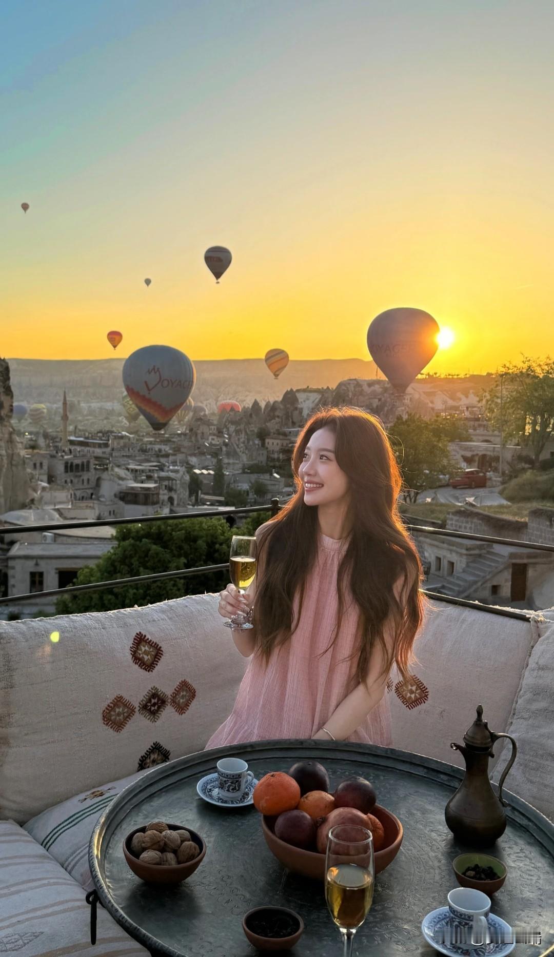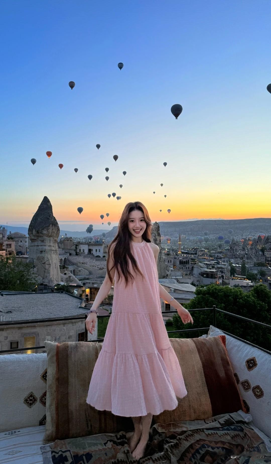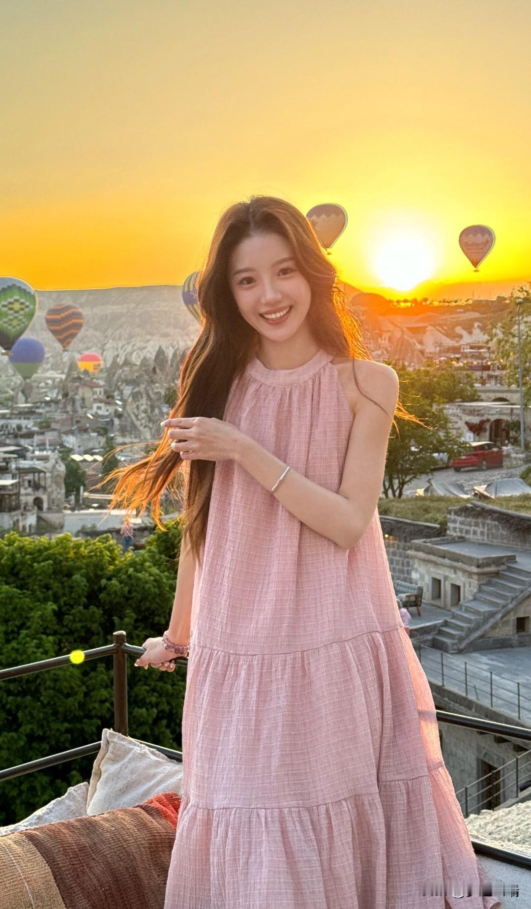 日落时分,热气球下的少女,笑靥如花。