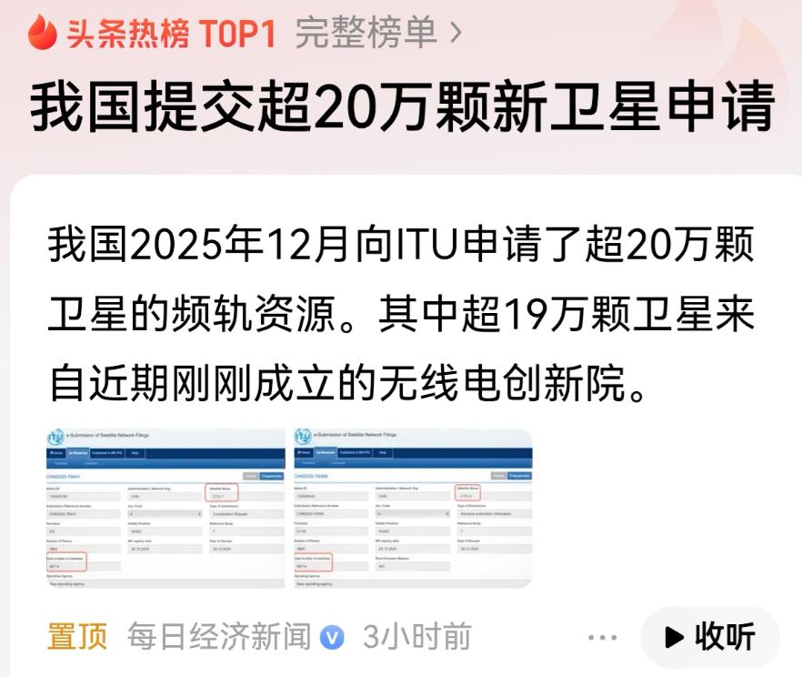 周末超级大利好,足以碾压“星链”的轻举妄动!我国向国际电信联盟申请了超20万颗卫星的轨道资源,商业航天的真正爆发点找到了! 这消息一出来,估计不少关注航天的朋友都忍不住拍大腿,这波操作属实是出手即王炸,直接把太空赛道的格局给拉开了。要知道太空里的轨道和频率这块香饽饽,可不是谁想占就能占的,国际电信联盟一直奉行“先到先得”的规矩,先申报并且按时发射卫星,才能把这些资源牢牢攥在手里,要是动作慢了,好位置全被别人占了,后续想补网、想搞全球服务都得受制于人。 马斯克的星链之前还在太空里耍小聪明,2026年初刚放出消息,要把4400颗运行在550公里高度的卫星降到480公里。嘴上说是什么为了减少太空垃圾,让失效卫星更快坠落,可明眼人都能看出来,这就是想抢300到500公里的黄金轨道带。 这个高度的信号传输延迟能控制在20毫秒以内,普通手机都能直接连,不管是商业价值还是战略价值都高得离谱。 星链申报的轨道高度是550公里,这次直接降70公里,还没按程序改登记参数,说白了就是仗着自己火箭回收技术的成本优势,想靠堆卫星数量垄断低轨空间。 就在星链忙着抢地盘的时候,我国直接亮出了底牌。2025年12月,我们向国际电信联盟提交了超20万颗卫星的频轨资源申请,这规模直接把星链那4.2万颗的终极规划给比下去了。而且这20万颗卫星可不是零散的小项目,而是来自十多个卫星星座,其中最大的两个星座CTC-1和CTC-2,每个规模都达到了96714颗,光这两个加起来就快20万颗了。 这两个巨型星座的申请单位是刚成立的无线电创新院,这家2025年12月30日才在雄安注册的“国家队”,一出手就有这么大动静,背后是国家无线电监测中心、中国卫星网络集团等7家单位联合共建的实力,显然是把卫星互联网产业上升到了国家战略层面。 可能有人会问,一下子申请这么多,真能部署完吗?其实懂行的都清楚,先把坑占住总没错,要是现在不申请,以后想部署都没地方挤。国际电信联盟虽然不一定会全批,但只要批准了,就拿到了优先使用权。 而且部署也不是一蹴而就的,规则里写得明明白白,从申报那天开始算,12年内完成首批50%部署,14年内完成全部部署就行。把20万颗的任务分摊到十多年里,再加上近地卫星寿命本来就只有3到5年,后续还需要更换补充,对咱们庞大的卫星互联网市场来说,并不是不可能完成的任务。 咱们现在已经有了扎实的技术底子,完全能支撑起这么大规模的部署。2025年我国航天发射次数直接创下历史新高,达到了92次,比2024年多了三成还多,这意味着咱们的发射能力已经进入了常态化、高频化的阶段。 而且火箭可回收技术也在加速验证,要知道这技术可是降低发射成本的关键,现在部分可回收火箭成本已经能控制在6700万美元左右,未来全面回收后有望降到200到500万美元。有了这两样加持,后续星座组网的成本会大幅降低,部署效率也会跟着提上来。 之前我国已经申请了5.13万颗低轨卫星,像中国星网的GW星座、垣信卫星的千帆星座都已经开始初步组网。现在加上这20万颗的新申请,相当于在低轨空间给自己铺好了一条宽广大道。 反观星链,就算再怎么降轨抢地盘,面对咱们这超20万颗的规模,也只能算是小打小闹。毕竟太空不是某一家的后花园,想靠垄断耍横行不通,咱们用合规的方式抢占先机,就是最硬的底气。 这波操作不仅是碾压了星链的轻举妄动,更标志着我国商业航天从之前的零星探索,正式进入了规模化布局的新阶段。随着后续技术不断成熟、部署逐步落地,不管是民用的互联网接入、物流导航,还是其他领域的应用,都能迎来质的飞跃。 曾经被美国几乎垄断的近地卫星轨道和频率资源,现在咱们靠自己的实力抢回话语权,这就是大国航天的底气所在。 接下来就看后续的部署推进了,相信用不了多久,咱们就能在太空赛道上真正实现弯道超车,让商业航天的红利惠及更多人。