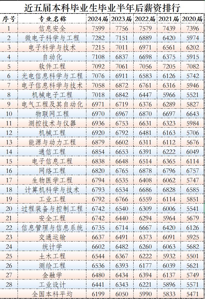 不知道选什么专业,不妨看一看5年来的本科毕业生工作半年后的薪资情况 不管本科毕业后是升学,还是就业,薪资待遇都是我们考量一个专业好坏的重要标准;薪资待遇越高,专业人才需求量就越高,就业质量也就越好。 近5年来,薪资待遇排名前20的专业,全部是工学类专业,这说明“工学为王”的时代已经来临。排名前10的专业中,除万金油专业自动化外,其他都是与强弱电相关的专业。前几年比较盛行的几个传统专业,比如金融学、统计学等,甚至已被大家视为“天坑”专业的土木工程专业,近5年来其薪资待遇仍在全国平均水平之上,这也说明他们仍保持着一定的需求量。 虽然多学科交叉的新专业并未出现在排名表上,但他们仍将是AI时代的“主宰”,选择他们意味着紧抓住时代的脉博。