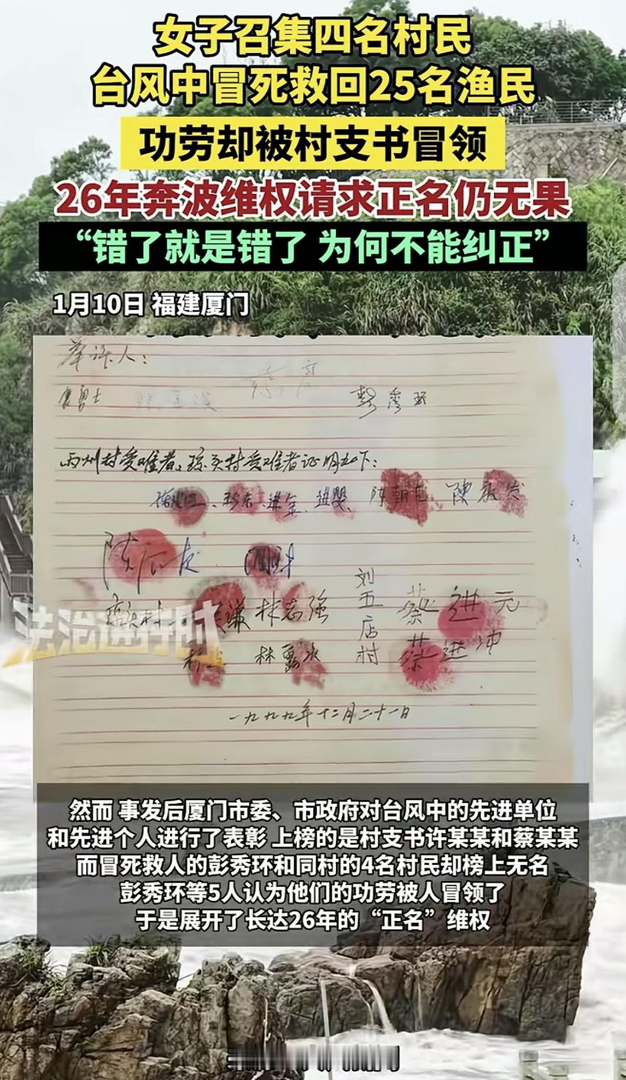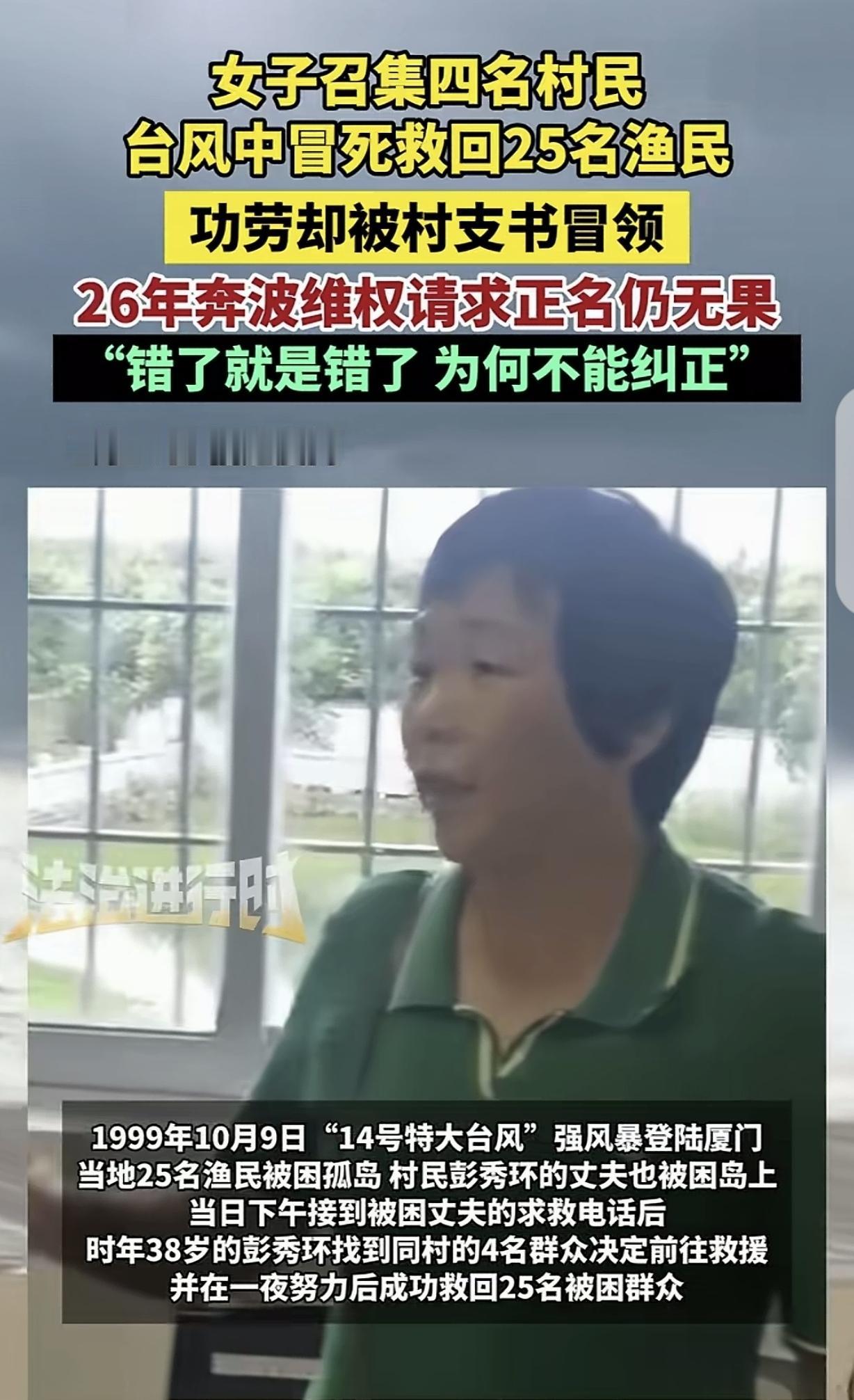 福建厦门,一女子的丈夫和24位村民,因为特大台风被困孤岛,女子叫上4个人,努力一夜,终于冒死把25个村民救了出来,可万万没想到,功劳却被村支书冒领,女子不服,把对方告上法庭却被驳回。她们5人奔波了26年,请求正名,一开始说“没有表彰的就不再表彰”,后来又说“超过申请时效”,女子愤怒:错了就是错了,为何不能纠正?那个狂风大作的夜晚,已经过去整整26年了。 时光回溯到1999年10月9日,那天第14号特大台风正面撞上厦门,那风力,足足有十二三级,是当地四十年未见过的凶狠。在刘五店附近的海面上,惊涛骇浪不仅吞噬了光亮,也切断了岸边的一切生机。25名成年人困于一座孤岛礁石之上,水电皆断。 在这群被困者中,还有彭秀环的丈夫与小叔子,他们的安危令人揪心。因为出海船只被吹跑,那真是一群待宰的羔羊。最让人揪心的是,其中还有个才10岁的孩子,一天水米未进,眼看就快昏死过去。 当妈的、当妻子的哪能坐得住?大伯那边的船出不了海,彭秀环硬是咬着牙,把自家平日里的两条木船拖了出来。她是个女人,力气不够,就挨个去敲蔡金溪、蔡良等四个乡邻的门。听说有人命关天,这几个汉子二话没说,这就要拿命去换命。 那时候的风浪有几米高?平时眨眼就能到的小岛,他们愣是在浪尖上颠簸了一个多小时才靠上去。回程更是惊险,多了25条性命,船身吃重,严重超载,要是随便那个浪头没躲过去,这一船人连个响声都留不下。等到这一船老小湿淋淋地爬上岸,天都已经蒙蒙亮了。 人救回来了,船也撞坏了。光修船费在当年就得花8000块,这是一笔巨款。可是,当大家都还沉浸在劫后余生的庆幸里时,一张令人瞠目结舌的表彰名单下来了。厦门市委、市政府开展先进表彰活动,表彰名单上,刘五店村支书许某某与村民蔡某某的名字格外醒目,他们获此殊荣,无疑是对其贡献的高度认可。 那个晚上,这两位受表彰的人在哪?蔡某某事后亦觉此事荒诞至极。在接受采访时,他直言不讳:“是我误会且搞错了,我的确未曾救人,也未见到所谓奖金。”就连村支书后来也没法圆场,推说是“村干部凭感觉上报的,没核实”。承认弄错并不难,难的是承认了之后怎么办。 这一错,就错到了今天。彭秀环想不通,救人是把脑袋别在裤腰带上的事,怎么这荣誉还能被张冠李戴?他们五个人开始了漫长的“讨说法”。起初,上面有人拿着2000块钱和5本证书来,像是要“私了”;后来又谈到给3万块钱补偿。 彭秀环脾气倔,一样都没收。她觉得这像是某种施舍,更像是一种讽刺——既然承认我们救了人,为什么不能像那个假名单一样,光明正大、名正言顺地更正过来? 最让人感到无力的是官方后来的回应。先是说“当年没表彰的不再追加”,后来这理由又升级了。相关部门搬出了一套2012年才制定的规定,告诉彭秀环:见义勇为申请有2年的时效期,你们这事儿发生在1999年,早过期了。 这种逻辑让连律师都觉得站不住脚。法不溯及既往是基本常识,怎么能拿十几年后的规定,去卡死十几年前的义举?更何况,这根本不是他们不去申请,而是当初那个被错发的奖杯挡在了那里,官方已经认错撤销了那个冒领者的荣誉,却始终不愿意把那份空白填上真正的名字。 在这个过程中,最初一起救人的5位英雄里,有一位已经带着遗憾离世了。活着的几位,从壮年跑到了两鬓斑白。彭秀环的丈夫老蔡,一开始也不理解妻子的“轴”。 村里总有风言风语,笑话他们没事找事,为了那张纸折腾全家。那时候老蔡脸皮薄,甚至想让她放弃。但这26年走过来,看着妻子一次次碰壁又一次次昂着头出门,他慢慢懂了。那哪里是一张纸的事儿?那是这一家子人在风浪里捡回来的尊严。如今,连当初想劝退她的丈夫,也陪着她往相关部门跑。 这个世界有时候挺荒谬,真正的救人者需要在质疑和推诿中自证清白,而那冒领功劳的名字虽然被撤销,当事人却只要躲着不说话就能安度晚年。彭秀环在这个村子里当了十几年的村民小组组长,威信很高,大家服她,不是因为那没到手的红头文件,而是心里都有杆秤。 被救的那25个人里,也有人已经走了。但只要彭秀环拿着联名信去找他们签字,不管是在家的、在外的,都能给她按下那个鲜红的手印。 这是人心,也是公道。彭秀环说她还会接着跑下去,哪怕只剩她一个人。她要的那个结果,不仅是为了那惊心动魄的一夜,更是为了证明:在这人世间,错了就是错了,哪怕过了26年,也得改回来。
