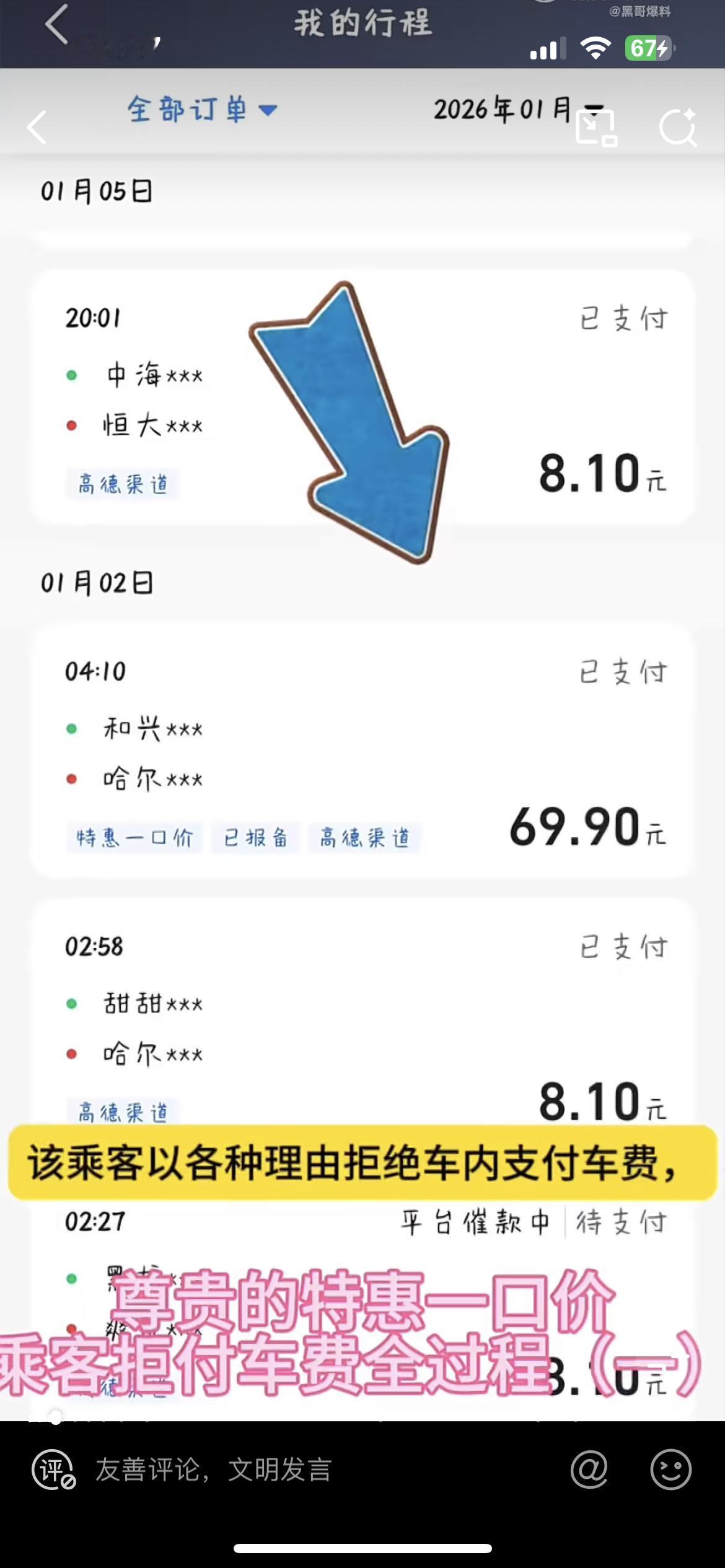 哈尔滨司机曝光一南方小仙女打车不想付车费,报警后才勉强付钱,反手就举报司机让他停工了。这个小仙女凌晨从酒店打车去机场,拿着几个行李箱,司机下车帮她把行李箱搬上车,小仙女连谢谢都没有。快到目的地,系统提示小仙女付车费,小仙女不付,司机就好心提醒她,小仙女还是不付。到了目的地,小仙女还在磨蹭。司机没办法就报警,女滴犹豫了几分钟才付款,一共69.9块钱。下车,司机帮搬完行李,小仙女全程黑脸,完了就把司机给投诉了。