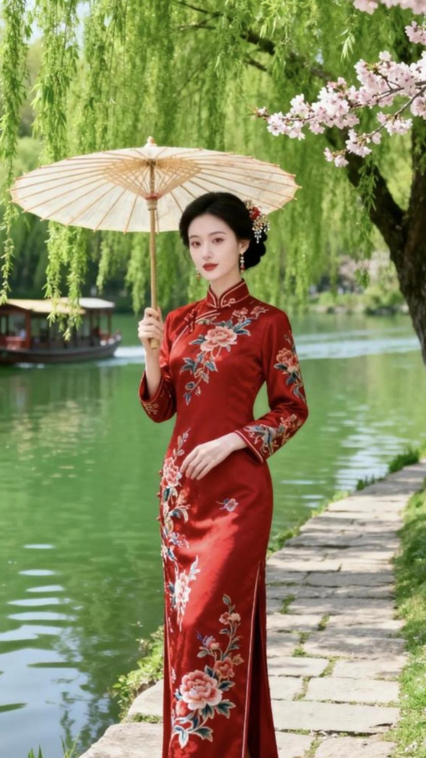 天净沙·柳下佳人 柳枝柔伞遮身, 佳人红袂依亲。 粉面桃腮韵蕴。 扁舟水吻, 碧波轻荡波纹。