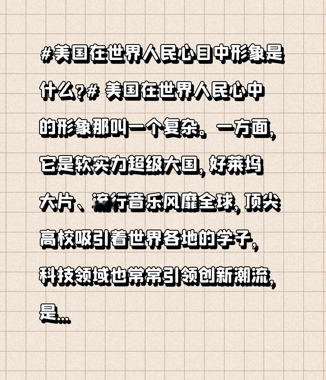 美国在世界人民心目中形象是什么? 美国在世界人民心中的形象那叫一个复杂。一方面,它是软实力超级大国,好莱坞大片、流行音乐风靡全球,顶尖高校吸引着世界各地的学子,科技领域也常常引领创新潮流,是很多创业者心中的“梦想之地”。 但另一方面,美国也饱受诟病。军事上到处干预他国内政,搅得地区局势不得安宁;外交上搞单边主义,经济制裁成了常用手段,还把国内的经济问题外溢到全球;文化上推行霸权,用自身价值观去衡量一切,搞双重标准。2024年,美国国内一堆问题没解决还外溢,国际上又搅乱地缘政治,国际形象实在难以改善。 从普通民众的视角来看,美国好莱坞塑造的“超级英雄梦”曾让无数人向往,可现实里美国大兵在海外制造的一桩桩惨案却让人们认清其真面目。那些因美国军事干预而流离失所的难民,成了美国霸权行径的牺牲品。比如在中东,美国以莫须有的罪名发动战争,至今当地依旧是一片废墟,百姓生活苦不堪言。 在外交舞台上,美国的单边主义就像一个蛮横的“恶霸”。为了维护自身经济利益,随意挥舞制裁大棒,全然不顾其他国家的死活。这不仅破坏了全球经济秩序,也让许多依赖贸易的国家经济遭受重创。美国还试图把自己的文化和价值观强加给全世界,却从不反思自己国内存在的严重种族歧视、贫富差距等问题。 2024年,美国国内的政治极化、社会撕裂等问题愈发严重,然而它还在国际上煽风点火。无论是在俄乌冲突中拱火浇油,还是在亚洲地区制造紧张局势,美国似乎乐此不疲地扮演着“麻烦制造者”的角色。长此以往,美国想重塑良好的国际形象,恐怕只能是天方夜谭了。