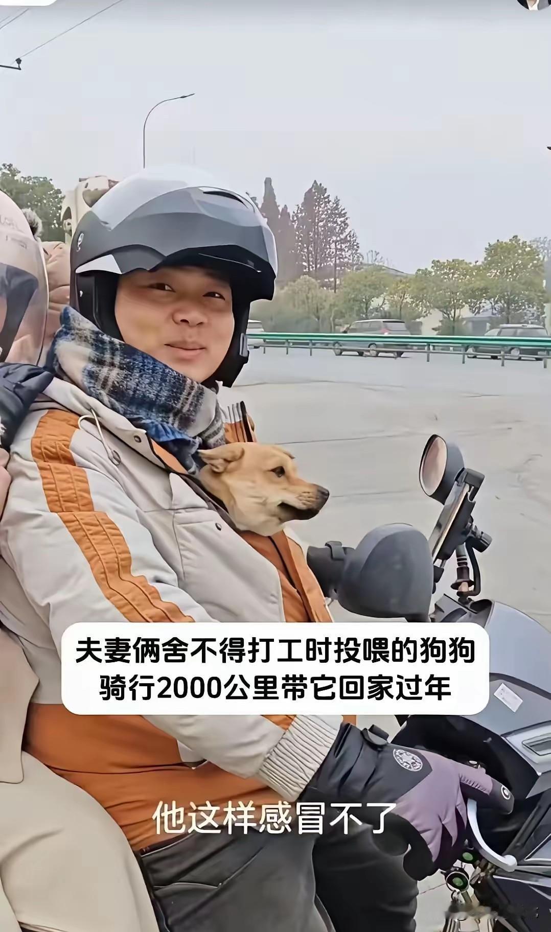 泪目了!一对在外打工的夫妻,偶然间遇到了一只流浪狗,他们一直投喂它,狗狗也非常听话,和他们很亲近。年关将至,夫妻俩决定回家过年,放不下狗狗,于是决定骑车把狗狗带回去收养。 这对夫妻在城郊的工地干活,每天天不亮就出门,天黑透了才回出租屋,日子过得紧巴巴的,舍不得买肉吃,却总记得给狗狗留半个馒头、一碗热粥。听附近摆摊的人说,这只狗狗被前主人扔在这快半个月了,好像是因为生病,主人嫌麻烦就直接丢了。 有些人养宠物图新鲜,看小狗小猫可爱就往家抱,等新鲜劲过了,宠物生病、掉毛了,就随手扔到街上。他们倒是潇洒了,可那些小生命呢?在陌生的地方挨饿受冻,还要提防车来车往,不知道哪一天就没了。 这对夫妻过得不容易,却把这只小流浪当成了家人。年关越来越近,工地上的人都陆续收拾东西回家了,夫妻俩却犯愁了。回老家的路不近,坐大巴不让带宠物,打车又太贵,思来想去,他俩一拍大腿,决定骑着那辆骑了好几年的电动三轮车回去。 出发前一晚,妻子翻出家里旧衣服,缝了个软软的小窝,垫在后座上,怕路上冷,还特意放了个暖水袋。丈夫则把三轮车仔仔细细检查了一遍,轮胎打气、刹车调试,就怕路上出问题。狗狗好像知道自己要跟着主人回家,乖乖蹲在旁边,尾巴摇得像小旗子,时不时蹭蹭夫妻俩的裤腿。 第二天一大早,天还没亮透,夫妻俩就出发了。夫妻俩裹着厚厚的棉袄,迎着冷风往前骑。狗狗缩在小窝里,偶尔探出头看看,看到主人在前面,又安心地缩回去。路上遇到刮风,丈夫就把自己的外套脱下来盖在小窝上,妻子则时不时回头,看看狗狗有没有冻着。 有人说他们傻,为了一只流浪狗遭这份罪。可我觉得,这才是最可贵的善良。善良从来都不是有钱人才配拥有的东西,而是刻在骨子里的选择。这对夫妻没什么钱,也没什么文化,但他们懂得心疼生命,懂得不离不弃。 一路颠簸,几天之后,他们终于到了家。家里的老人孩子看到狗狗,不仅没嫌弃,还乐呵呵地围上来,给狗狗喂吃的。从此,这只曾经流浪的小狗,终于有了一个真正的家。