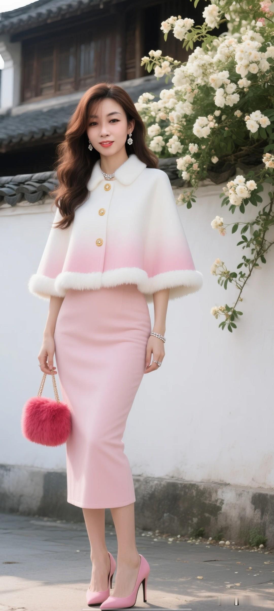 晒图笔记大赛自然+优雅的女人怎么穿衣 街拍怎么拍出自然又好看的照片 一位现代女子,身高172,温柔有气质,肤白貌美大长腿,凹凸有致,26岁,高冷御姐脸,眼睛很美,妆容精致。 女生留着黑棕色长卷发,白色浅粉色渐变斗篷式宽松短款外套,领口袖口都带白色毛绒绒边,金色扣子,下身穿浅粉色贴身长裙,脚穿粉色八厘米细跟高跟鞋。手提玫红色毛绒绒小圆包。戴钻石项链,钻石耳环,钻石手链,钻石戒指。三维高清 央视品质 白墙青瓦 吊脚楼一角 木香花开好了 干净清新 氛围感 艺术感 风景。