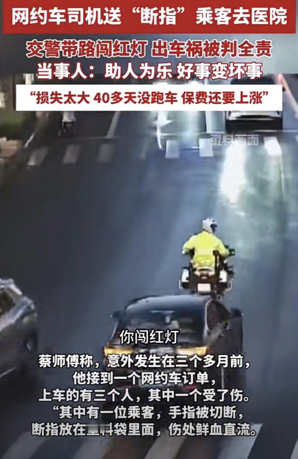 杭州网约车司机蔡师傅为送断指乘客就医,在交警带领下闯红灯,结果撞上正常行驶车辆,被判定全责,这事儿引发了热议。 当时蔡师傅接到订单,乘客手指被切断,鲜血直流。行驶中遇到交警,交警查看后让他跟着。可刚开几百米就出了事。蔡师傅等了一个多月等来全责认定,交警提出给他申请见义勇为称号和补偿,他没接受,毕竟四十多天没跑车,保费还上浮。 从法理讲,未按交通信号通行就得担责;但从情理看,蔡师傅是在助人。这事儿折射出紧急救助时情理与法理的矛盾,希望以后能有更好的制度保障善行。 网约车乘客责任 网约车司机之死 滴滴网约车拒赔 杭州滴滴司机 网约车拒单 网约车拒赔 宁波网约车事件