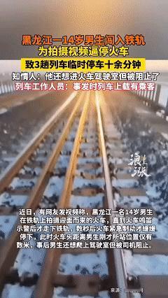 这种孩子我用钢筋打!近日黑龙江,火车司机正驾驶火车在铁路上正常行驶,突然发现火车头前出现一个男生正举着手机对火车录像,司机连忙鸣笛示警让男生离开,过了一会儿男生才走下铁轨,火车停下后,男生居然还想进入驾驶室拍照。 据了解,这位男生今年刚14岁,平时是个火车迷,就喜欢看各种火车,这次可能是男生不满足于在安全地方观看,于是便趁着工作人员不注意,用钳子破坏了封闭网进入铁轨,这才发生了惊险的一幕。 而整个过程中,男生的表现丝毫不惊慌,当司机师傅鸣笛示警时,男生一开始并没有避让,反而是等火车快开近了才走下铁轨,而司机师傅为了不伤害到男生只能紧急制动,数秒后才停下,而当时火车头距离男生的位置才几米,此次紧急制动也让三辆列车都不得不临时停车。 司机师傅看到男生没事也长舒一口气,刚想联系工作人员把男生带走,没想到男生不仅不离开,居然还想进入驾驶室中拍摄但被工作人员阻止。 后面的情况发生了什么不得而知,只是根据爆料者提供的行政处罚决定书中,得知了事件的处理结果,对男生进行了行政拘留5日,行政罚款500元的处罚,因男生刚14岁且在当地没有固定住所,所以没有执行拘留,当场收缴了罚款。 事情发生后,瞬间引起了网友们热议。 有的网友说:应该降低判刑年纪 现在互联网发达 小孩认知成型比较早。 也有的网友说:最好的结果是没出事没有人员伤亡,但年龄小不是违法的理由,应当严罚重判。 还有的网友说:这孩子已经废了,如果身体允许的话,父母再要一个吧。 不知道友友们听没听说过铁路迷这个群体,这个群体值得是一些对火车非常热爱的青少年,在这部分群体中年纪不大但对于火车有谜一样的崇拜,遇见喜欢的火车就总不动路,不拍几张照片就不可能走,还会在内部对火车进行等级划分,可以说是另一种的饭圈粉丝。 估计这个男生就是这样,对火车的已经从喜欢到了疯狂的程度,才会冒着生命风险扯开封闭网进入铁轨拍摄。 这也给所有人提了个醒,对一件事物可以喜欢但不要痴迷,一旦痴迷进去,人就不知道会干出什么愚蠢的事情了。 你怎么看?评论区说说吧。 素材来源:极目新闻,浪张新闻