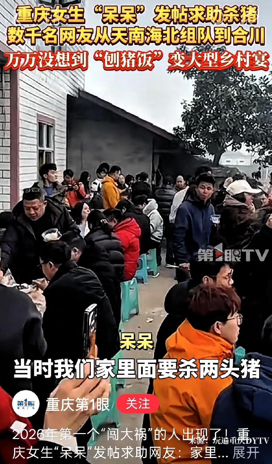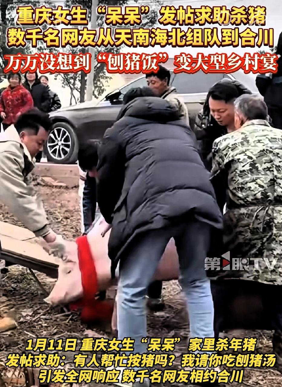 呆呆:我好像闯了个大祸啊 四川文旅:没事 这好事我接得住! 2026年才没几天,重庆合川的小女生呆呆,就凭一条帖子搞出了大动静! 谁能想到姑娘的“任性许愿”,竟炸出了全网最治愈的狂欢! 呆呆一句“求帮忙按猪,管饭还能让我扬眉吐气”,本是家常小事,却让上千人驱车奔赴,车子从村头排到村尾,十万人在线蹲守直播。 这哪是来吃刨猪汤,分明是大家憋坏了对真实温暖的渴望! 没有精心设计的网红剧本,没有刻意炒作的打卡套路,网友自带工具帮忙杀猪,陌生人围坐一桌喝汤聊天,连文旅和交警都来搭把手,这份不掺杂质的热闹,比任何网红景点都动人。 快节奏的日子里,我们总在刷着精致的短视频,却忘了最治愈的从来不是滤镜里的美好。 这场意外走红的杀猪宴,戳中了现代人的痛点:我们厌倦了原子化的孤独,渴望这种不分你我的烟火联结。 它证明了,最珍贵的快乐从不是刻意追求来的,而是藏在人与人之间的真诚互动里。 如今的“反向旅游”“赶集热”,其实都是在寻找这份真实。比起挤在人山人海的景区,这种自发的、接地气的热闹才更有温度。 你有没有过为了一份纯粹的快乐,奔赴一场陌生的约定?来评论区说说你的故事~重庆女孩呆呆