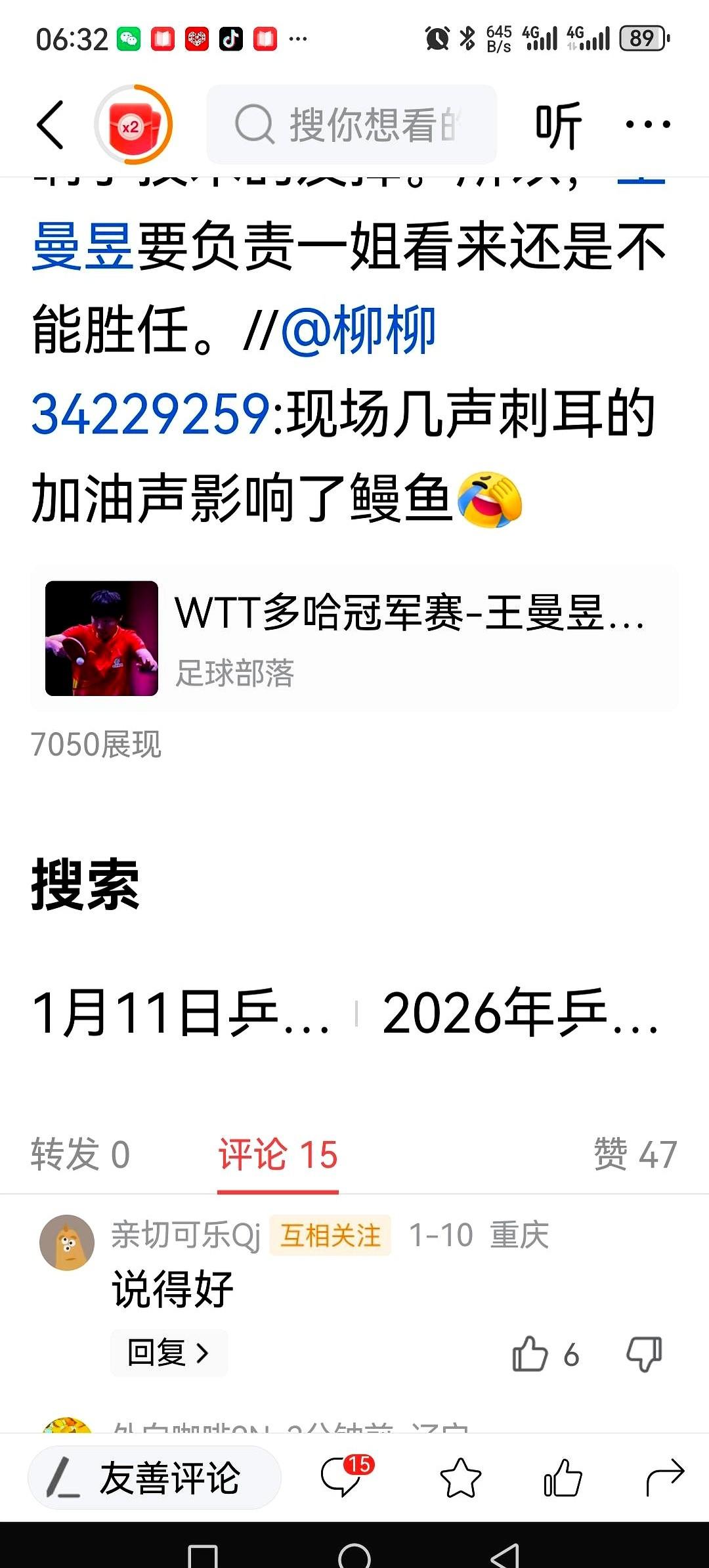 谢天谢地,这次的锅我们莎粉不用背了! 多哈冠军赛现场,又有人乱喊干扰选手,这事儿瞬间就炸了。 我刷着手机,心里竟然有点轻松……因为莎莎没去,我们这帮人一个都没到现场。 她脚踝老伤加足底筋膜炎,据说要休养66天。新赛季第一站,就这么缺了。 没了她,这比赛我真就只剩每天刷刷比分了。看卢赛尔体育馆空荡荡的座位,再瞅瞅王曼昱3-4爆冷输给韩莹,感觉一切都怪怪的。 赛场冷清就冷清吧,反正我们都在网上等她满血回归。