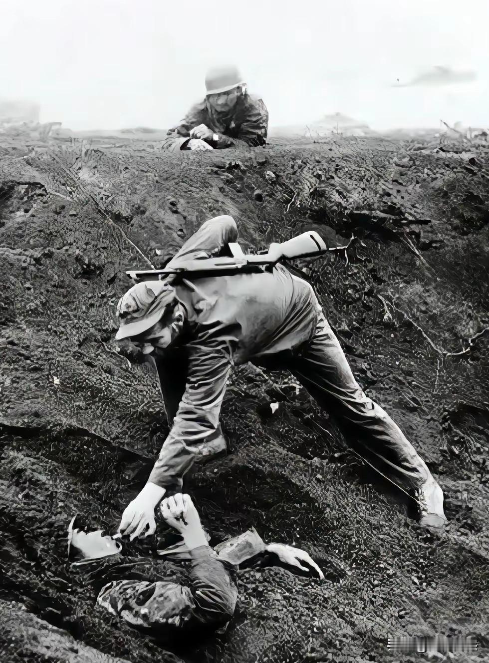 这是硫磺岛战役时留下的真实影像资料,当时的日本鬼子相当的顽固,战争打得相当惨烈,每个日本鬼子都抱着必死的决心跟美国大兵负隅顽抗,画面显示的内容,是一个美国大兵给一个受伤的日本鬼子送香烟,这个受伤的日本鬼子身体已经被土淹埋了大部分,据说当时有些日本鬼子身上是有炸弹的,当美国大兵向它们靠近时,有些日本鬼子就做出了同归于尽的行为!