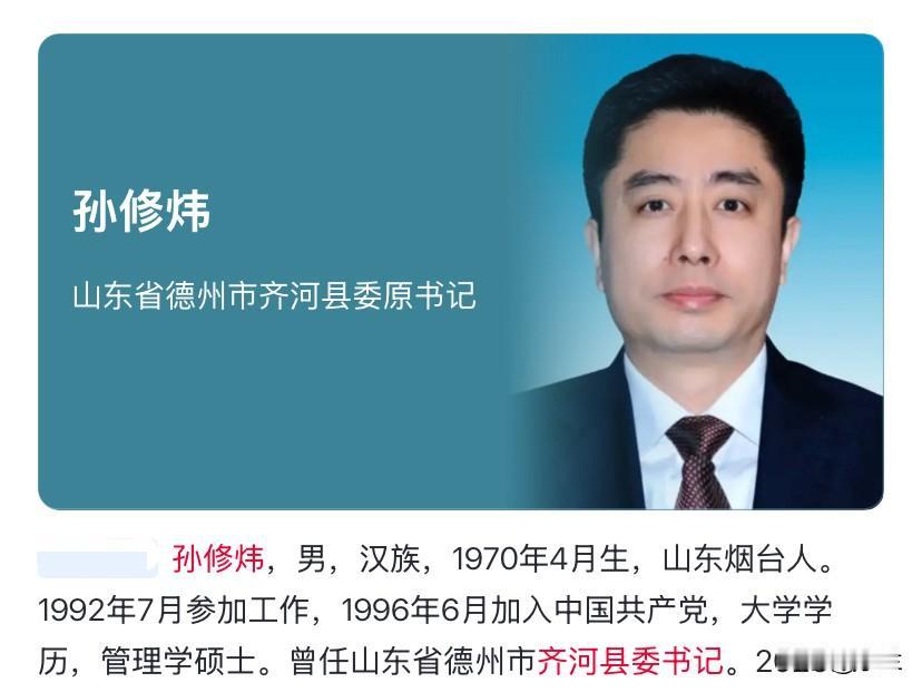 山东德州市齐河县的孙修炜是山东烟台市人, 1992年在华中理工大学毕业后, 在山东省潍坊市城市综合开发公司开始了工作。 1999年初他转入行政工作, 在山东潍坊他一干就是21年, 2020年底他调到了山东齐河工作, 当上了一把手, 可惜他没有坚守初心, 如今几十年的努力都化为泡影了!