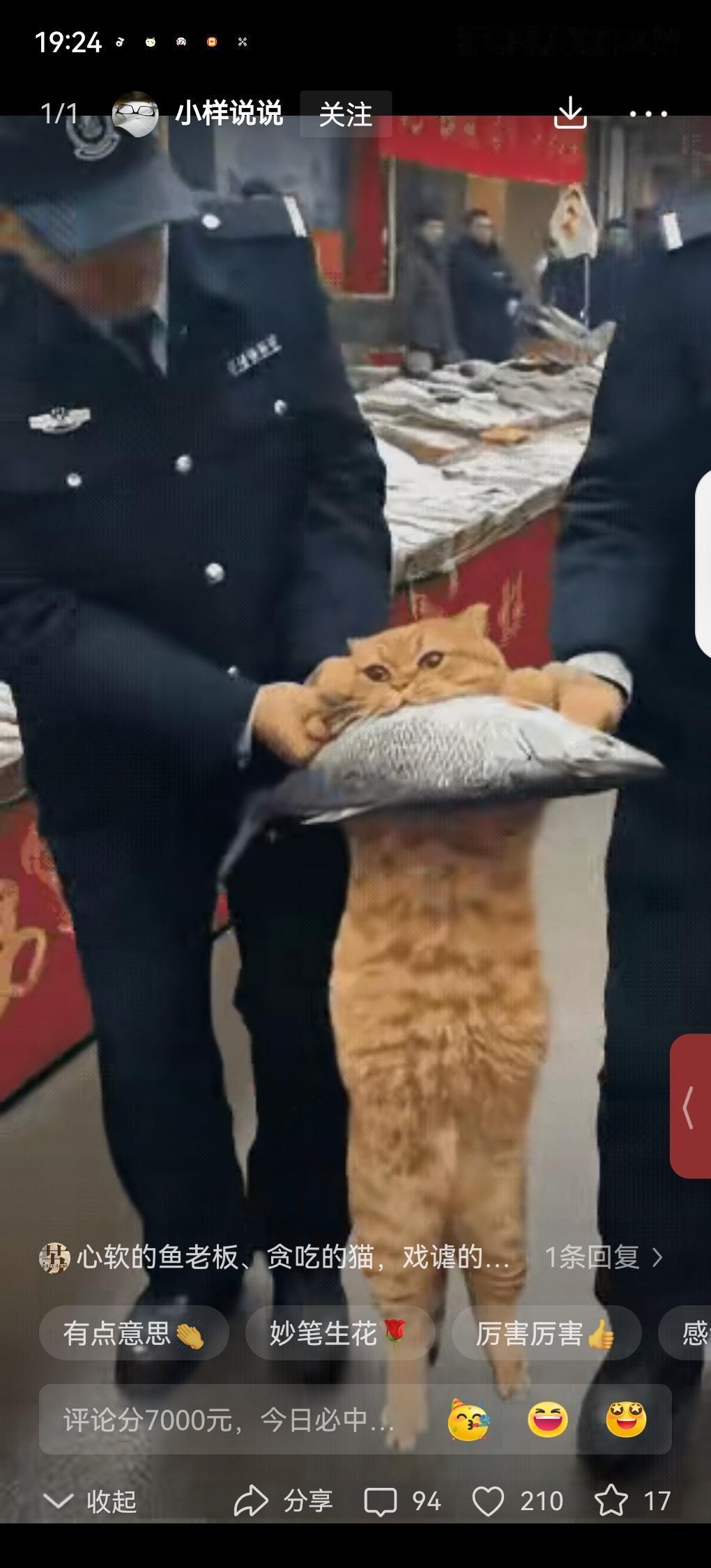 脸都不要了!广西北海icon地角海鲜市场,一个鱼贩摊位上常来一只猫偷鱼,老板前前后后赶过很多次,没下狠手,猫也不怕他,盯着摊上那条大的就下嘴。偏巧那天市场巡查人员路过,猫又叼起一条鱼就要跑,老板伸手没拦住,干脆把事跟巡查说了。 两名工作人员当场把这只“惯犯”按住,猫嘴里还咬着那条鱼,没松口,后来被两人一左一右架着,拎着走去给大家看看,摊前的人围起来都笑出了声。 心软的鱼老板、贪吃的猫,戏谑的巡查员、爱热闹的左邻右舍,一副菜市场一角的生活画面,呈现在我们面前。多么的有人间生活气息,温暖真的无处不在! 喵:我凭本事捕的鱼,干嘛抓我?!🤦 猫说了:所有摊贩要交税,有你们去管理,鱼的摊位由我来管理,只要每天一条鱼,🤦你们不能抓我,我们是平起平坐的。😄 这猫给大家带来快乐了,给它些小鱼小虾就当门票了。 心软的鱼老板、贪吃的猫,戏谑的巡查员、爱热闹的左邻右舍,一副菜市场一角的生活画面,呈现在我们面前。多么的有人间生活气息,温暖真的无处不在!👍👍👍 市场里的老鼠不能白抓!这是工资,我要向劳动局投诉,你的欠薪,这叫保安抓“猫🐱”😂
