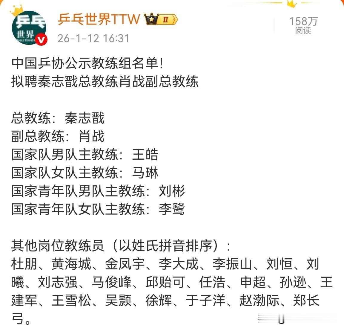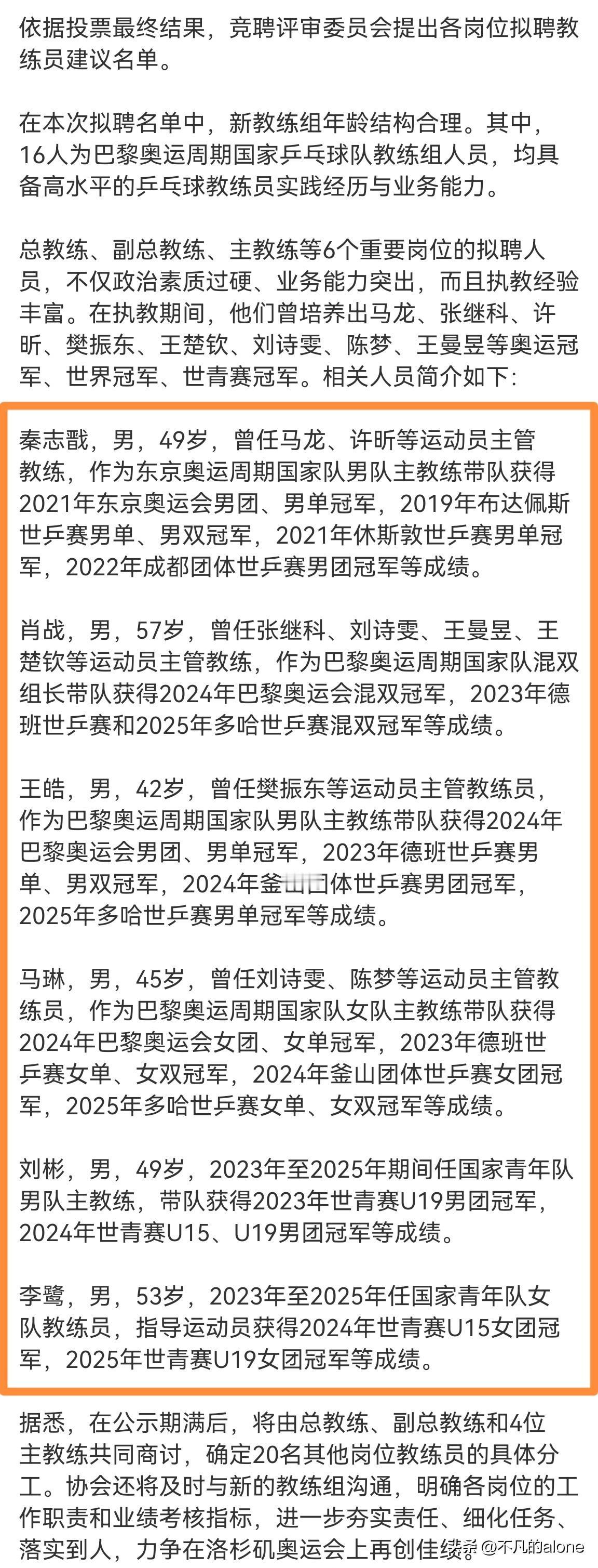 我刚刚认真看了一遍国乒洛杉矶奥运会周期总教练、副总教练以及主教练等6人的简介,他们都提到了哪些优秀运动员呢? 总教练秦志戬提到了马龙和许昕; 副总教练肖战提到了张继科、刘诗雯、王曼昱和王楚钦,没想到肖战还指导过刘诗雯; 男队主教练王皓只提到了樊振东,要是樊振东还在国家队的话,或许他的压力也没这么大; 女队主教练马琳提到了刘诗雯和陈梦,陈梦作为两届奥运会女子单打冠军,肯定值得介绍一下。 大家有没有发现,就是没有人提孙颖莎,莎莎这么优秀,这是为什么呢?