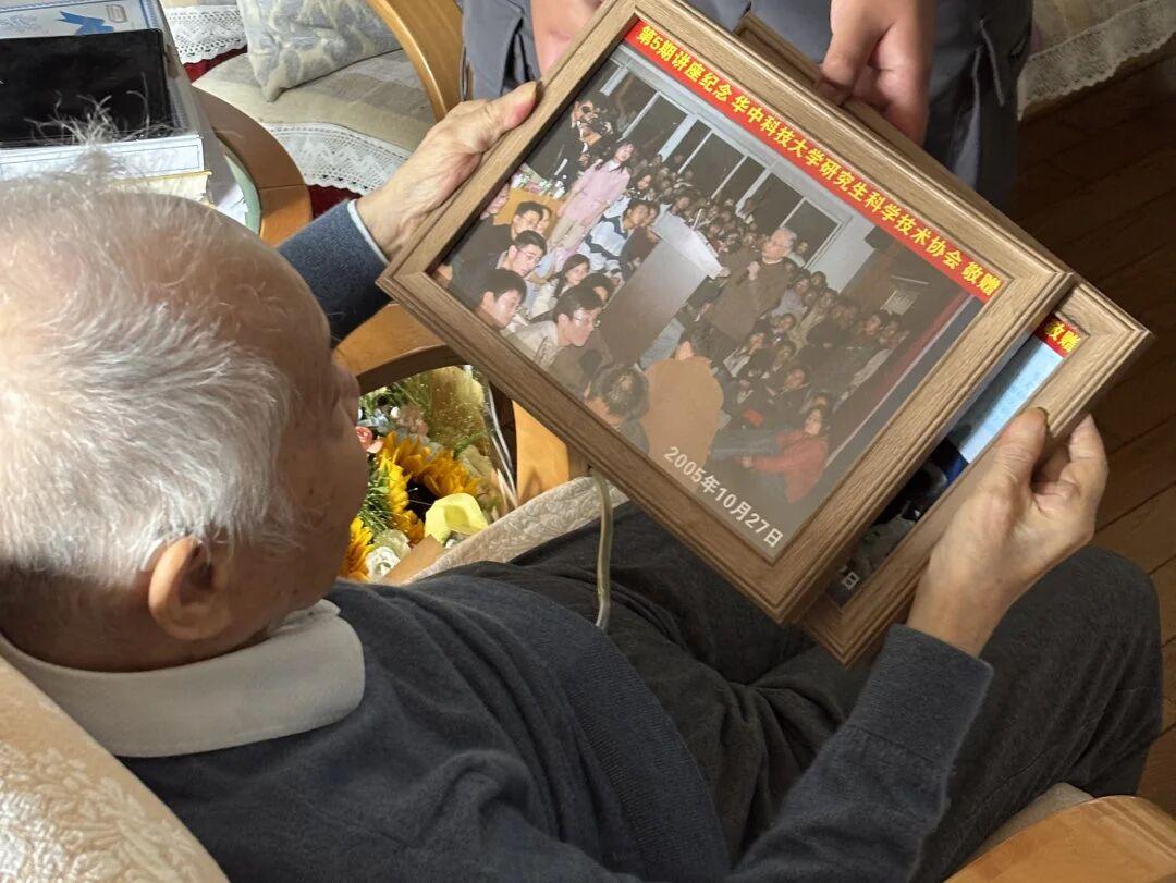 何祚庥老院士翻看老照片,回忆华科大讲座。 去年八月,华中科技大学学子拜访何老院士