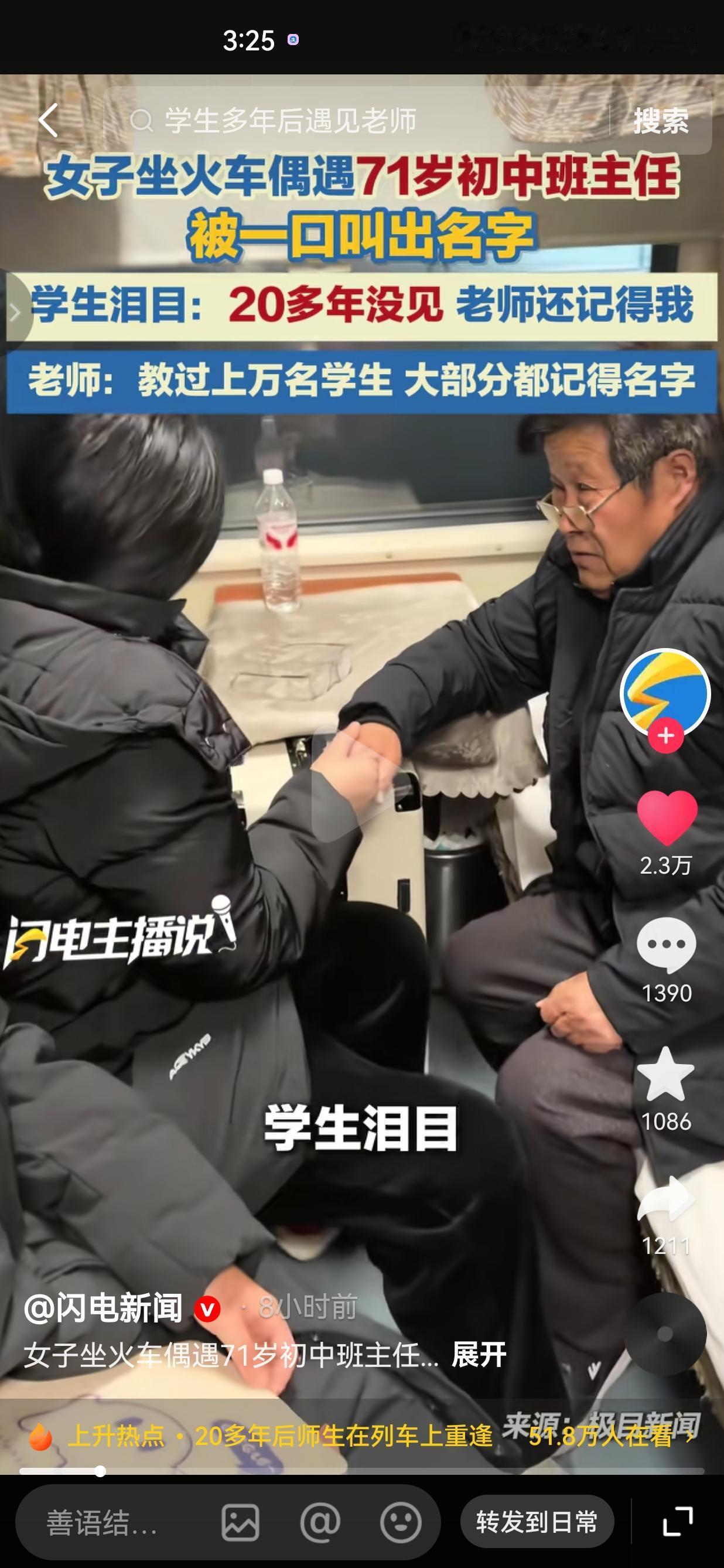 看哭了!女子坐火车时,她竟碰到了71岁的初中班主任,更让人泪目的是,时隔20多年,老师还能一口喊出她的名字,甚至记得她当年的班级和职务。网友:这老师把学生记在了心上。 在一趟普通的火车上,一女子刚落座没多久,居然有人正确地喊出了她的名字。她仔细一看,对面的老人,既熟悉又很陌生,再一想,原来是她的初中班主任。 女子瞬间泪目了,女子说:“老师,咱都20多年没见了,您竟然还记得我!” 而这位头发已经花白的李老师,不仅叫得出她的名字,还清晰记得她是自己1999年带的初一一班学生,甚至记得她当时在班里担任副班长、主管纪律,成绩还很不错。 李老师笑着握住她的手,笑着对她说:“我教了40多年的书,教过的学生上万,但是,大部分学生的名字我都记得。” 要知道,能把二十多年前一个学生的细节记得如此清楚,这份藏在岁月里的用心,任谁听了都会心头一暖。 两人就这样聊着聊着,不知不觉就到了下车的站点了! 下车后,女子不仅主动帮李老师拎起了行李,还一路出站把老师送上车,直到看着老师乘车离开,才依依不舍地转身离开。 网友看到后评论说:“这老师也太暖了吧!20多年了还能叫出学生名字,这才是真正把学生放在心里的好老师!” 还有的网友说:“我要是遇到这种老师,我也会哭。被人记住,真的是一件特别幸福的事。” 我们常说“师恩难忘”,可大多时候,都是学生记着老师的好,却很少想过,老师也会把学生放在心里,并记住学生的年轻的模样。 而这位71岁的老师,却用行动告诉我们,这就是教书育人。 这其实,这趟火车上的相遇,没有轰轰烈烈的剧情,却让我们看到了师生之间最珍贵的情感。 最后,愿我们都能记得那些曾经教过我们的老师,也愿每一位老师,都能被自己的学生温柔记挂。