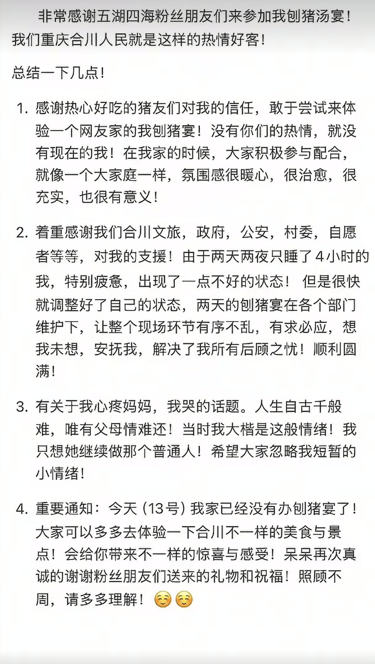 呆呆家的刨猪宴已经变味了!13日一大早,天还没亮,呆呆家楼下就已经聚集了很多人,呆呆也紧急发通知,“13日我家已经没有办刨猪宴了。” 估计这也是呆呆最担心的事情了,明明昨天已经多次说过,12日是活动的最后一天了。 但是13日早天还没亮,楼下空地又聚集了很多网友,仔细看才发现,很大部分都是拿着手机直播拍视频蹭流量的。 8点多呆呆发布了动态,估计呆呆也是被吵醒了,毕竟她说2天只睡了4个小时,要恢复正常生活了! 关于她因为看到“妈妈受累”而哭的事情,也做了解释,就是单纯的心疼自己的父母,只希望父母做个普通人。 虽然通知发出来了,评论区却全是“在来的路上”的评论,估计呆呆也很无奈吧,虽然赚的不少,但是小小年纪没经历过,也怕接不住吧,她也说过,就想活动能有个完美的结局。 还有很多网友也开始模仿呆呆,召集大家也去参加自己准备的“刨猪宴”,估计也是想赚一波流量吧。 呆呆的刨猪宴真的是无心插柳柳成荫,没有目的,就是想请网友来帮忙、凑热闹、感受年味,但是后续的模仿者,恐怕已经变味了吧。 呆呆面对大量网友的到来,敞开大门欢迎,热情招待,涨了177万粉也是她最好的回报!