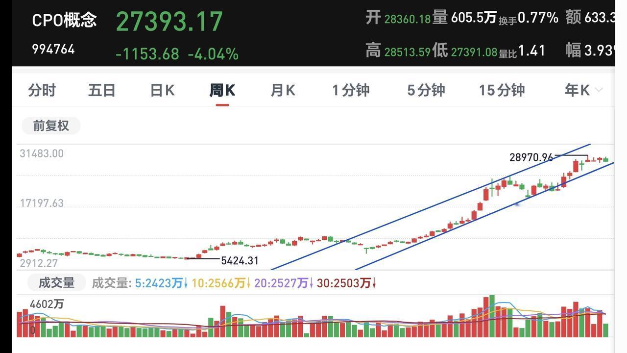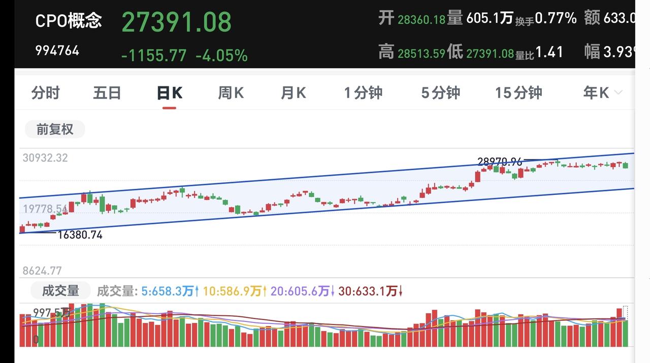 基金:Cpo板块究竟应该怎么办 前段时间的热门板块CPO,这段时间已经熄火,盘中估值下跌了2.12%,这是连续第2个交易日下跌,持有人数在所有板块中排名第5,也是散户比较多的板块。 这个板块今天加仓排行榜见下面的截图3,持有人数排行榜见下面的截图4,排名第一的都是中航机遇领航混合。 我们来看一下下面的截图5,这是cpo板块日K线图,从图中可以看出,我画了两条倾斜向上的斜线,这是cpo板块日线级别上涨通道,今天的下跌,并没有跌破这个上涨通道的下轨,也就是说,今天的下跌并没有改变CPO板块日线级别的上涨趋势,持有的人可以继续持有,除非跌破这个上涨通道的下轨,才可以考虑要不要止盈出来观望。 我们来看一下下面的截图6,这是cpo板块周K线图,从图中可以看出,我画了两条倾斜向上的斜线,这是CPO板块周线级别上涨通道,连续两天的下跌并没有跌破这个上涨通道的下轨,也就是说,cpo板块现在还是处于上涨趋势中,持有的人可以继续持有,除非跌破这个上涨通道的下轨,才可以考虑要不要止盈出来观望。 Cpo板块日线级别和周线级别都处于上涨趋势中,持有的人当然可以继续持有,除非跌破上涨通道的下轨,才会考虑要不要止盈出来观望,在跌破上涨通道下轨之前,所有的下跌都先把它们当为震荡来看待。 我每天都会分享我的观点,我的观点只代表我个人的看法,不能作为你操作的依据,据此操作后果自负。