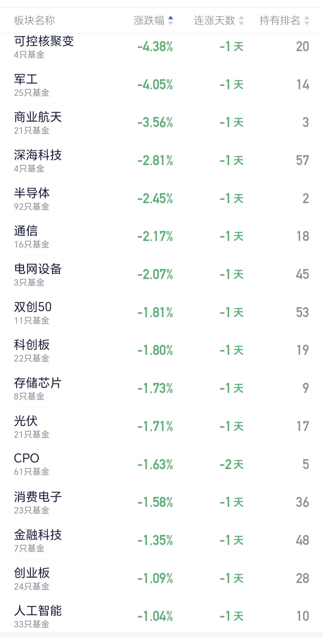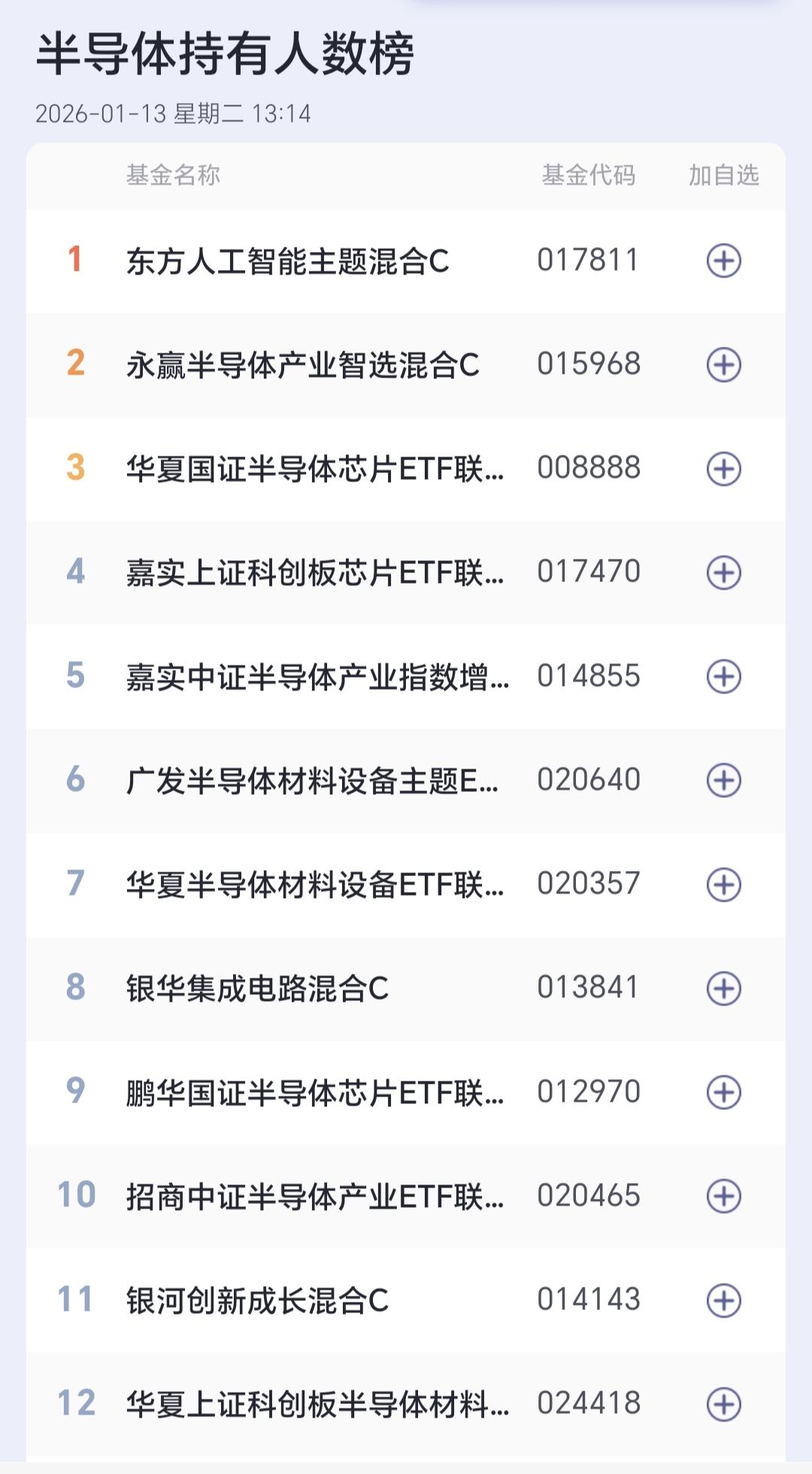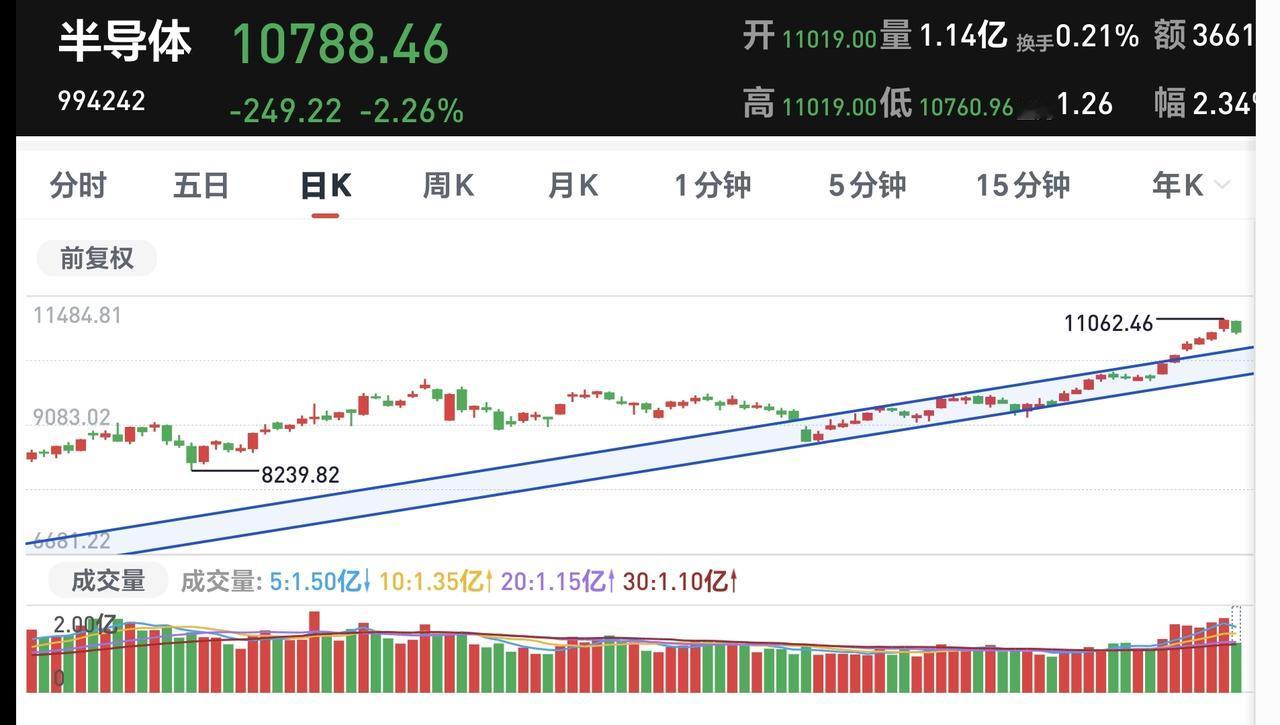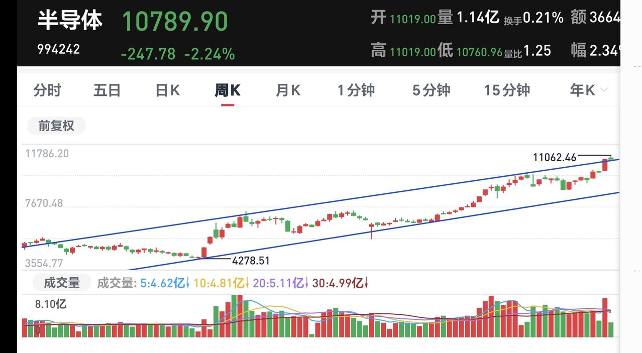 基金:半导体板块应该怎么办 半导体板块今天下跌幅度也比较大,现在盘中估值下跌了2.48%,持有人数在所有板块中排名第2位,所以,这个板块中的散户人数是比较多的。 这个板块今天加仓人数排行榜见下面的截图3,持有人数排行榜见下面的截图4,加仓人数最多的是嘉实上证科创板芯片,持有人数最多的是东方人工智能主题。 我们来看一下下面的截图5,这是半导体板块日K线图,从图中可以看出,我画了两条倾斜向上的斜线,这是半导体板块日线级别短期上涨通道,上个星期也是上涨突破了这个上涨通道的上轨,现在是处于加速上过程当中,今天的调整暂时看为震荡。 我们来看一下下面的截图6,这是半导体板块周K线图,从图中可以看出,我画了两条倾斜向上的斜线,这是半导体板块周线级别上涨通道,上周的上涨稍微突破了这个上涨通道的上轨,现在的下跌又来到了上轨线的附近,如果能够保持在上轨线的上方,那就还是处于加速上涨过程中,如果下跌到上轨线的下方,也只是回归到了正常的上涨通道当中,周线级别的上涨趋势并没有被改变,只有跌破了上涨通道的下轨,才有可能改变周线级别的上涨趋势,也才可以考虑要不要止盈出来观望。 我每天都会分享我的观点,我的观点只代表我个人的看法,不能作为你操作的依据,据此操作后果自负。
