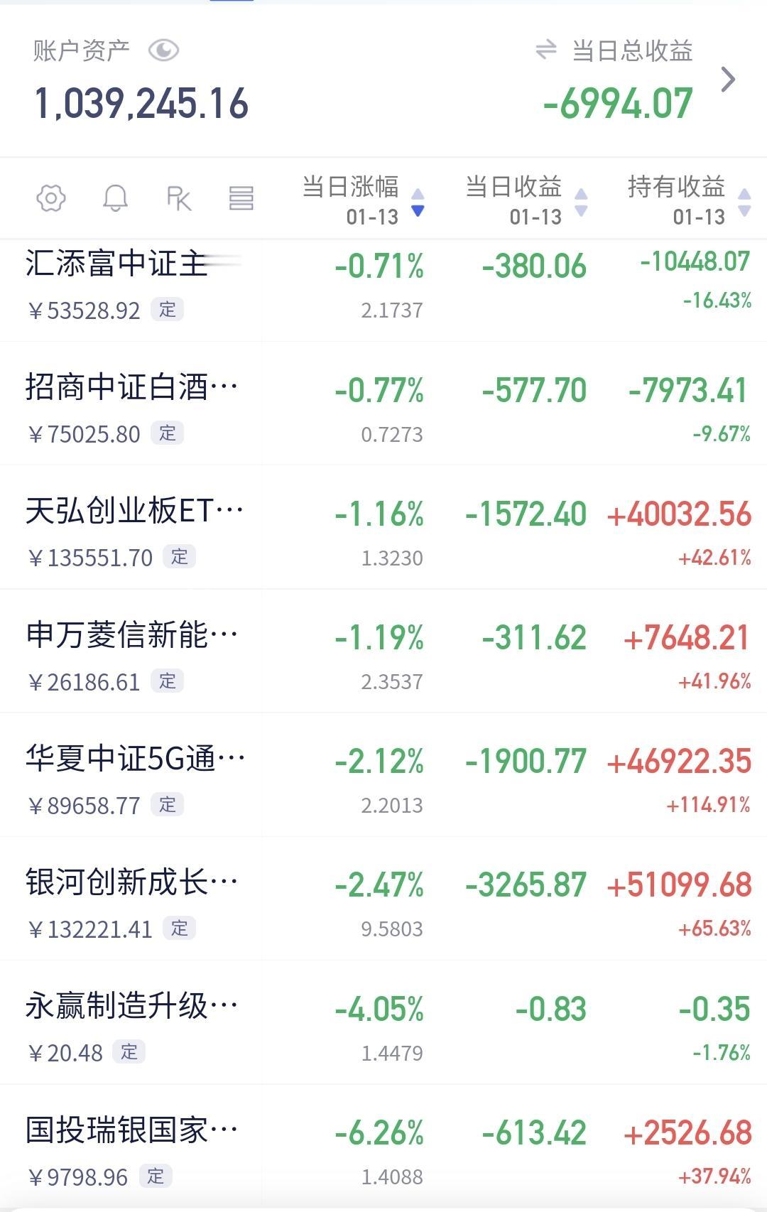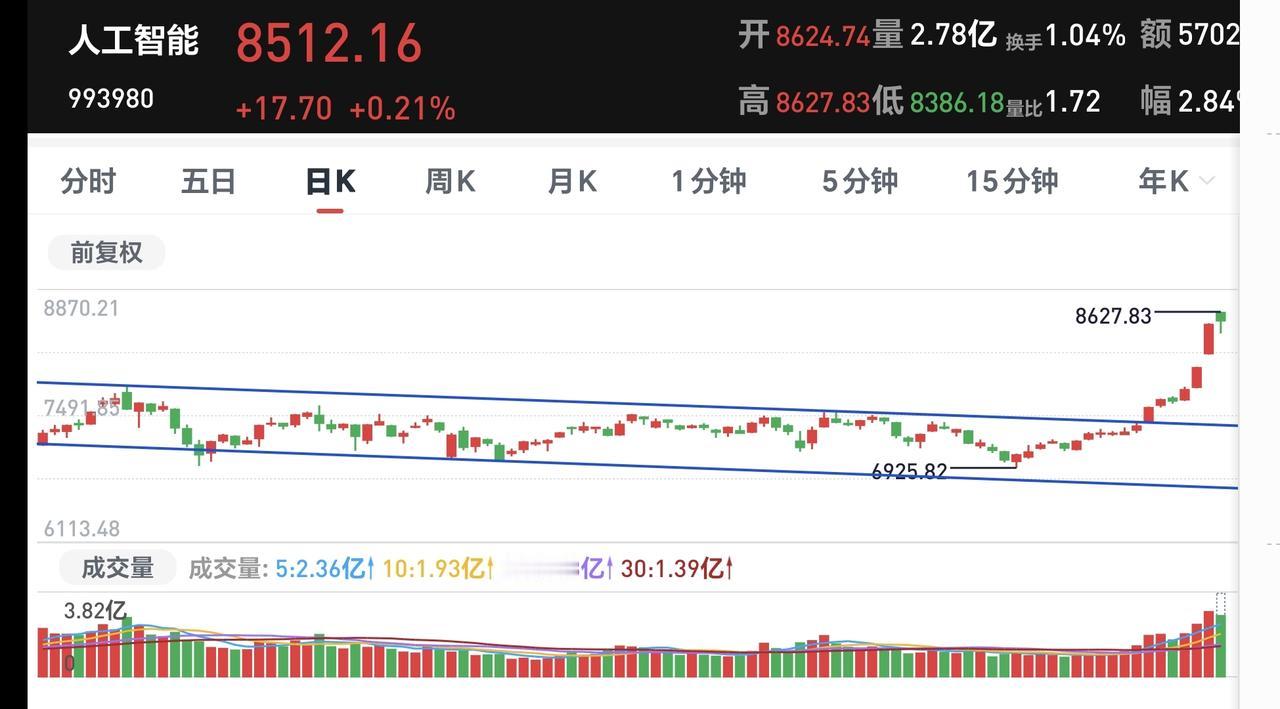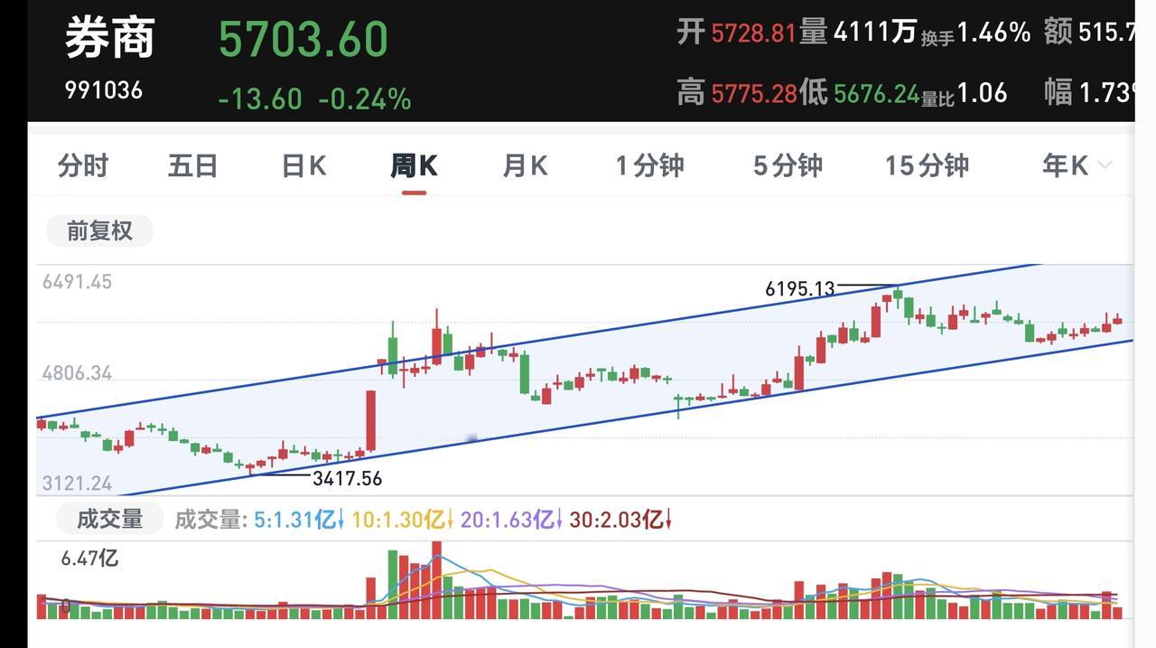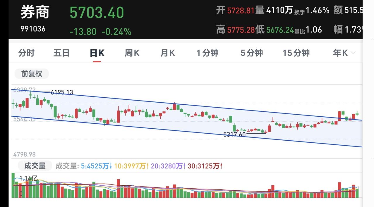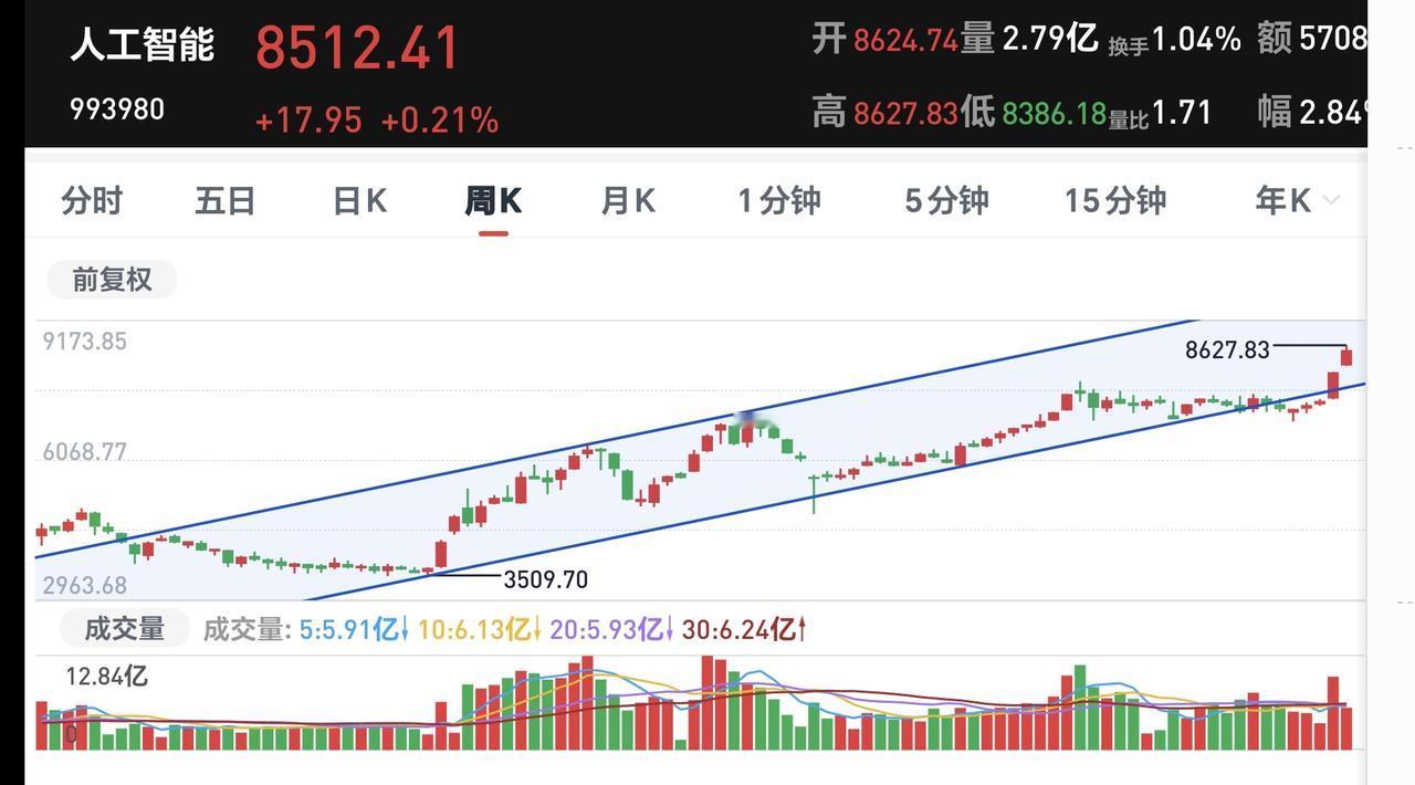 基金:今天的震荡调整是不是市场见顶的信号 市场下午开盘以后小幅度震荡,震荡的幅度并不是很大,创业板指下跌了1.17%,盘中点位3348点,指数下跌了0.31%,盘中点位4152点。 整个股票市场,上涨2119家,下跌3208家,涨停78家,跌停38家,上涨家数少于下跌家数。 持有的基金中,盘中估值上涨幅度最大的三个板块是:AI应用板块,先进制造板块,创新药板块,估值下跌幅度最大的三个板块是:军工板块,可控核聚变板块,芯片半导体板块,估值整体亏损了6985元。 整个基金市场,上涨9918家,下跌9145家,上涨幅度超过5%的4家,下跌幅度超过5%的16家。 图9是今天基金的上涨排行榜,图10是今天基金的下跌排行榜,图11是ETF上涨幅度排行榜,图12是今天基金的加仓榜,图13是今天基金的减仓榜。 1:下午韩式黄色线在蓝色线下方,两条线之间的敞口并不大,这样的情况下不支持市场指数大幅度下跌,继续观察两条线之间的敞口会不会有变化,继续观察两条线之间的位置会不会有变化。 2:现在两市累计成交28585亿,相比于昨天同期放量了1%,这说明今天在震荡调整的过程当中,并没有资金大幅度出逃,从资金面的情况看,现在还看不出见顶信号,也就是说,今天的震荡调整并没有看出是见顶的信号。 3:现在盘中五天线位置是4121点,现在盘中的点位是4152点,是在五天线之上的震荡,在五天线跌破之前,都不要过分的恐慌。 4:我们来看一下下面的截图14,这是主力资金进出板块的情况,主力资金净流入最多的三个板块是:医药生物板块,医疗服务板块,黄金概念板块,主力资金净流出最多的三个板块是:高端制造板块,国企板块,蓝筹策略板块。 5:我们来看一下下面的截图15,这是人工智能板块日K线图,从图中可以看出,我画了两条倾斜向下的斜线,这是人工智能板块日线级别下跌通道。前段时间的上涨突破了这个下跌通道的上轨,也就是说,人工智能板块日线级别下跌趋势已经被改变,持有的人可以继续持有。 我们来看一下下面的截图16,这是人工智能板块周K线图,从图中可以看出,我画了两条倾斜向上的斜线,这是人工智能板块周线级别上涨通道,前段时间跌破了这个上涨通道的下轨,上周的上涨又收回到这个上涨通道内,也就是说,人工智能板块周线级别又重新处于上涨趋势中,持有的人可以继续持有,除非跌破这个上涨通道的下轨,才可以考虑要不要止盈出来观望。 6:我们来看一下下面的截图17,这是券商板块日K线图,从图中可以看出,我画了两条倾斜向下的斜线,这是券商板块日线级别下跌通道,上周五的上涨突破了这个下跌通道的上轨,也就是说,券商板块日线级别下跌趋势有可能已经被改变。 我们来看一下下面的截图18,这是券商板块周K线图,从图中可以看出,我画了两条倾斜向上的斜线,这是券商板块周线级别上涨通道,现在的位置处于这个上涨通道内,也就是说,券商板块周线级别处于上涨趋势中,持有的人可以继续持有,除非跌破这个上涨通道的下轨,才可以考虑要不要止盈出来观望。 今天究竟应该怎么办?我会在评论区留言。 我每天都会分享我的观点,我的观点只代表我个人的看法,不能作为你操作的依据,据此操作后果自负。